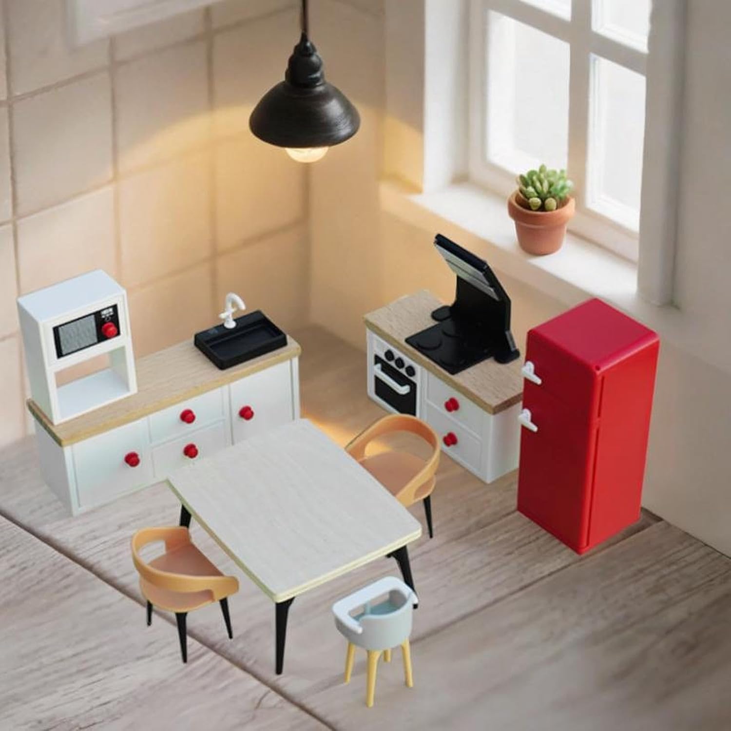 【 la creatività e l'interazione genitore-figlio】: il set di mobili per la casa delle bambole è perfetto per il gioco genitore-figlio, consentendo ai bambini di progettare scene e creare storie, stimolando la loro immaginazione e rafforzando il loro pensiero spaziale e le capacità di narrazione 【Uso versatile】: il set di mobili in miniatura per case delle bambole è versatile e adatto per case delle bambole in 1/12 o come oggetto di scena per fotografie in miniatura. 【Materiale】: i giocattoli per mobili in miniatura sono realizzati in robusto PP e legno, con dettagli realistici per un uso a lungo termine 【Set completo compatto】: mobile bianco, due sedie da pranzo europee, tavolo da pranzo, frigorifero, stufa bianca e seggiolone per bambini 【Regalo ideale per le bambine】: la decorazione della casa delle bambole è perfetta per compleanni o occasioni speciali e il gioco di ruolo lo rende un ottimo regalo per qualsiasi bambina che ama giocare a casa con le bambole