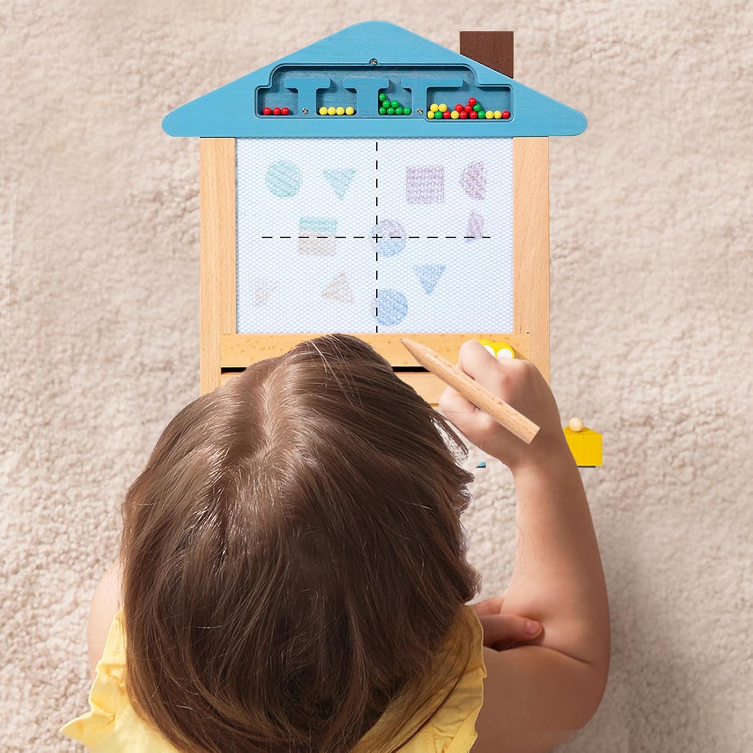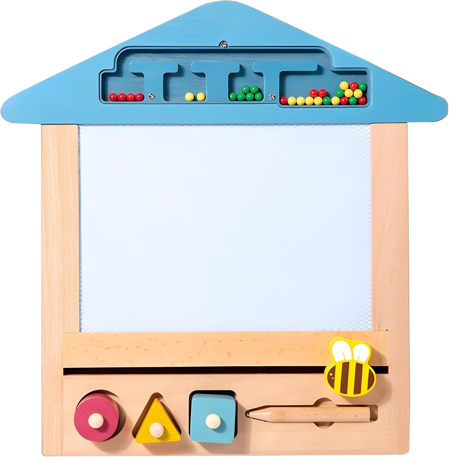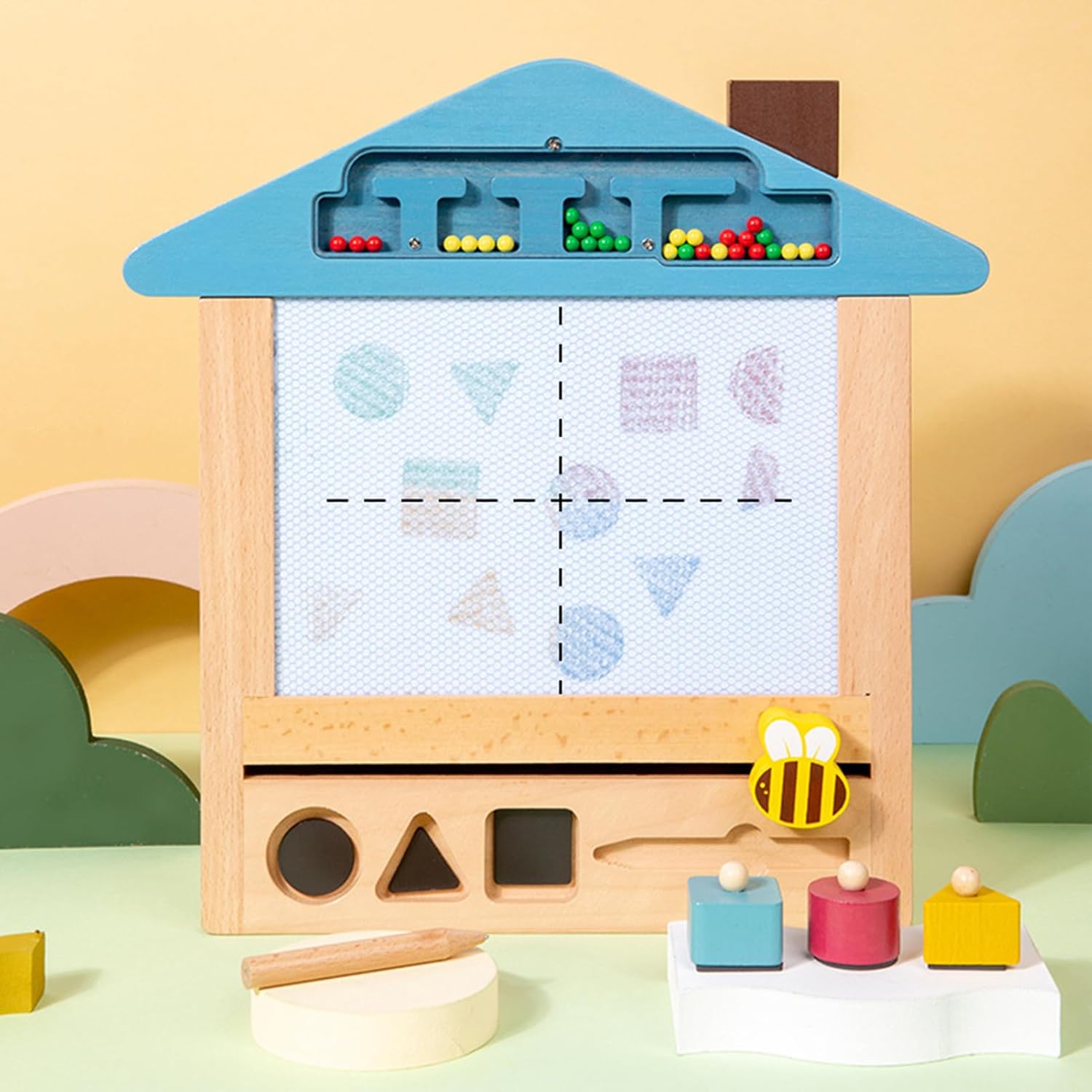 Colorful magnetic drawing board with a smooth allows for easy writing and drawing, promoting creativity in young children without the of paper or colors, making it an ideal tool for artistic expression and imaginative play while keeping the environment clean and tidy for parents Includes four different colored stamps and multiple drawing stencils that assist in learning shapes, letters, and numbers through engaging and interactive play, enhancing their cognitive skills while providing endless fun and creativity, making learning enjoyable and effective Sturdy wooden frame construction supports the magnetic drawing and features an integrated storage compartment to keep all stamps and accessories organized, ensuring that everything is easily accessible and reducing clutter, which helps children develop organizational skills from an early age Magnetic drawing pen attached with a string prevents loss and encourages proper pencil grip, aiding in the development of fine motor skills and hand-eye coordination in preschool-aged kids, making it a perfect educational tool that combines fun and learning in engaging package Easy erase function allows children to wipe clean their artwork by simply sliding the eraser across the , providing infinite drawing possibilities without wasting paper, fostering creativity and reducing waste while allowing kids to express themselves freely and repeatedly without limits