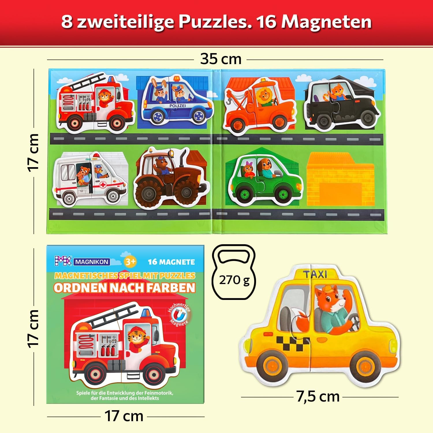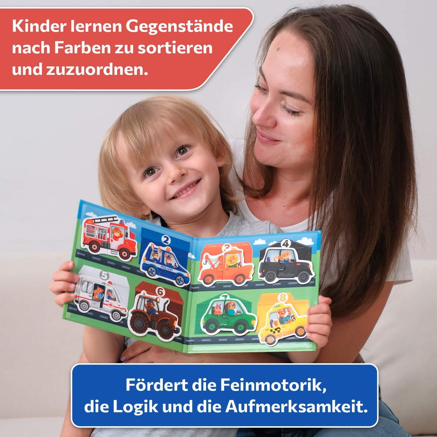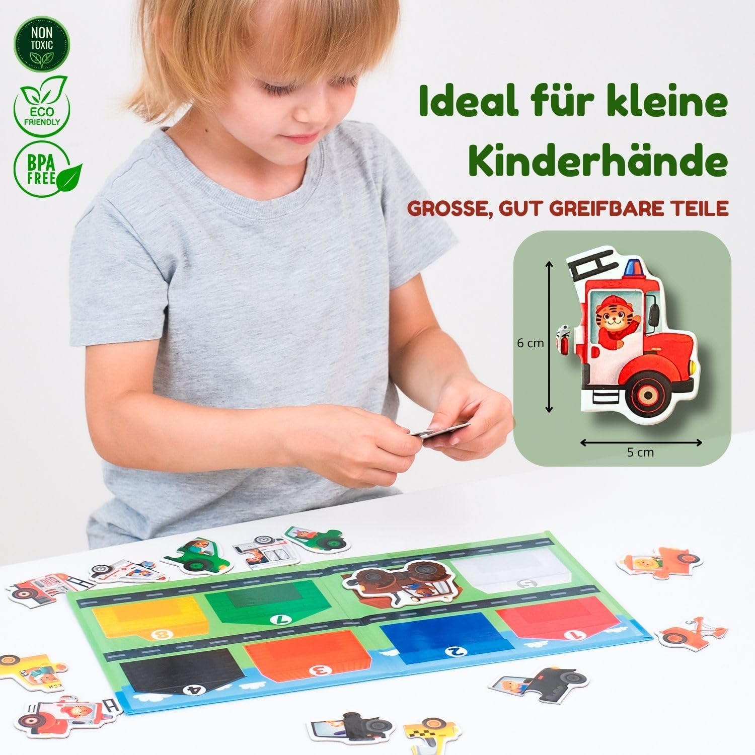 OCCUPAZIONE AUTOGUIDA PER BAMBINI: giocattolo magnetico per bambini da 1 a 3 anni – una grande attività di apprendimento in età prescolare che stimola le capacità motorie e rafforza il pensiero logico. Questo giocattolo da viaggio misura 17 x 35 cm, molto leggero (solo 270 g) e si compone di otto puzzle in due pezzi. Ampio campo di gioco e magneti di alta qualità: il nostro giocattolo educativo è realizzato a forma di libro magnetico. L'ampio campo da gioco (35 x 15 cm) e i magneti a tenuta salda per bambini lo rendono un impiego perfetto per i viaggi in auto. Puzzle e puzzle perfettamente coordinati per bambini da 2 a 6 anni. Impara i colori, nomina le auto e conta. Pratica attività di viaggio in viaggio: il gioco per bambini è realizzato in un formato pratico. Può essere facilmente trasportato in viaggio, visite mediche, ristoranti, ecc. Il bambino non si annoierà mai e sarà impegnato senza uno schermo, giocando. 16 MAGNETI PER BAMBINI: i magneti aderiscono perfettamente al campo di gioco, non cadono nemmeno in posizione verticale e vengono conservati sul campo di gioco (in formato libro). Il giocattolo promuove le capacità motorie, la percezione visiva e la memoria. Promozione: il giocattolo per le abilità motorie per colori contiene grandi pezzi di puzzle facilmente afferrabili con magneti, perfetti per le mani dei bambini piccoli. Ideale per i bambini che fanno la prima esperienza con i puzzle: nessuna frustrazione, ma esperienze di successo! Design austriaco: i giocattoli Magnikon sono progettati in Austria, con particolare attenzione ai materiali, allo stile e ai colori utilizzati. Giocattoli e giochi Magnikon per promuovere il pensiero logico, il linguaggio, la memoria e le abilità motorie delle dita.