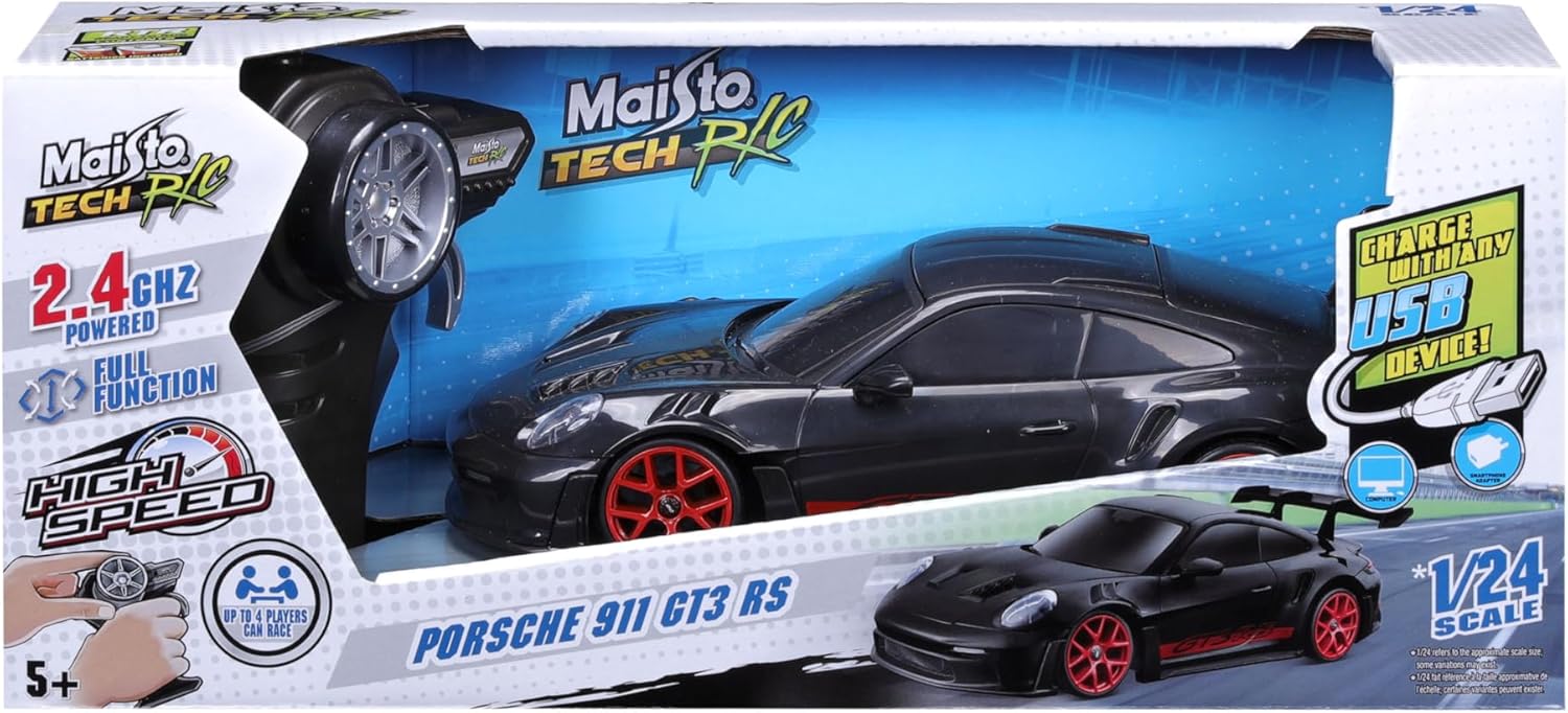 Elegante auto da corsa: con la veloce Porsche 911 GT3 RS della Street Series di Maisto Tech i fan degli sport motoristici grandi e piccoli arrivano a loro spese Nero-rosso e veloce: l'auto sportiva RC è dotata di trazione posteriore e sterzo anteriore. È veloce fino a 8 km/h Dettagli autentici: l'auto RC è una replica dettagliata della Porsche e ha una lunghezza di circa 20 cm Controllo impugnatura a pistola: con il pratico telecomando, il carrello può essere guidato avanti, indietro, destra e sinistra e dura fino a 20 minuti con la batteria carica Dai 5 anni in su: la Porsche 911 GT3 RS telecomandata può essere facilmente gestita anche dai piloti più giovani