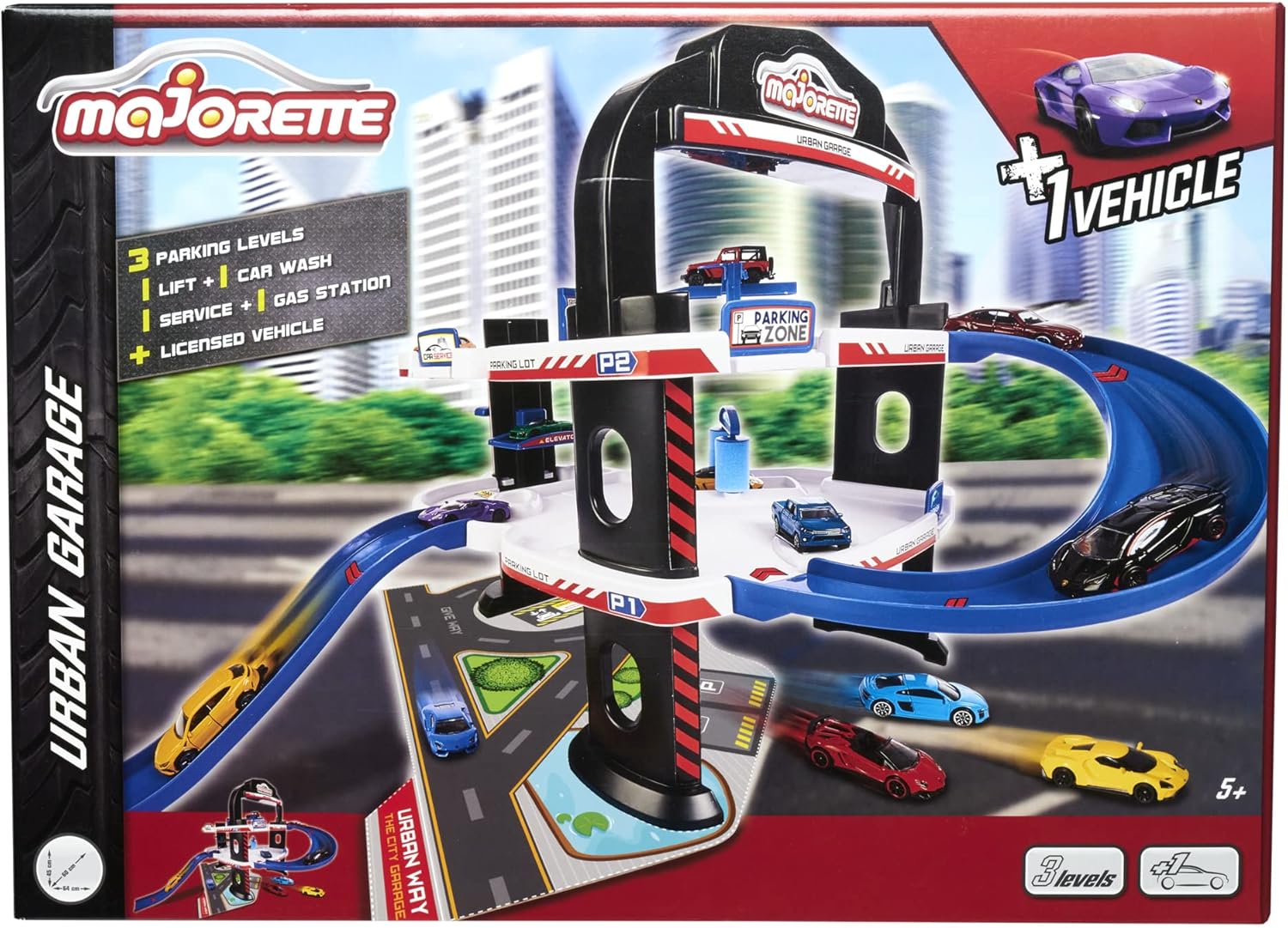 Majorette – Urban Garage – Parcheggio con una macchina giocattolo in metallo, grande garage con 3 livelli, stazione di servizio, officina, ascensore e autolavaggio.. Grande divertimento su tre piani: il Urban Garage è il set da gioco ideale per i piccoli appassionati di auto. Per le piccole auto giocattolo e il suo autista c'è un sacco di esplorazione e divertimento illimitato. Varie stazioni – Il concessionario auto da 64 x 60 x 45 cm offre un sacco di stazioni di gioco con un ascensore, un autolavaggio, un'officina e una stazione di servizio con un sacco di stazioni di gioco prima di scendere rapidamente dallo scivolo. Include una macchina Die-Cast – Per poter suonare direttamente il grande garage per auto, è incluso un Lamborghini Aventador lungo 7,5 cm con ruota libera, sospensioni e corpo in metallo. Per bambini dai 5 anni in su: la concessionaria con i veicoli in metallo è estremamente robusta, è un regalo ideale e offre a ragazzi e ragazze dai 5 anni in su un grande divertimento di lunga durata. Contenuto della confezione: garage con tre livelli, con piste, rampe di discesa e ascensore manuale e 1 veicolo Die-Cast. Accessori: 1 autolavaggio, 1 ponte sollevatore, 1 colonna del serbatoio, 1 cartone con strade e parcheggio da tagliare, 1 foglio adesivo DIN A4, 1 manuale di istruzioni (lingua italiana non garantita).
