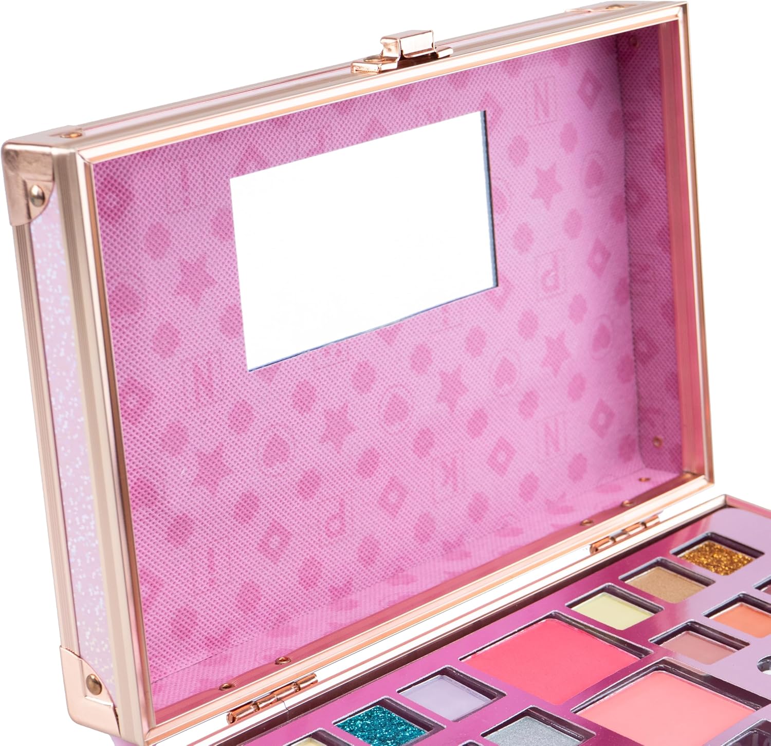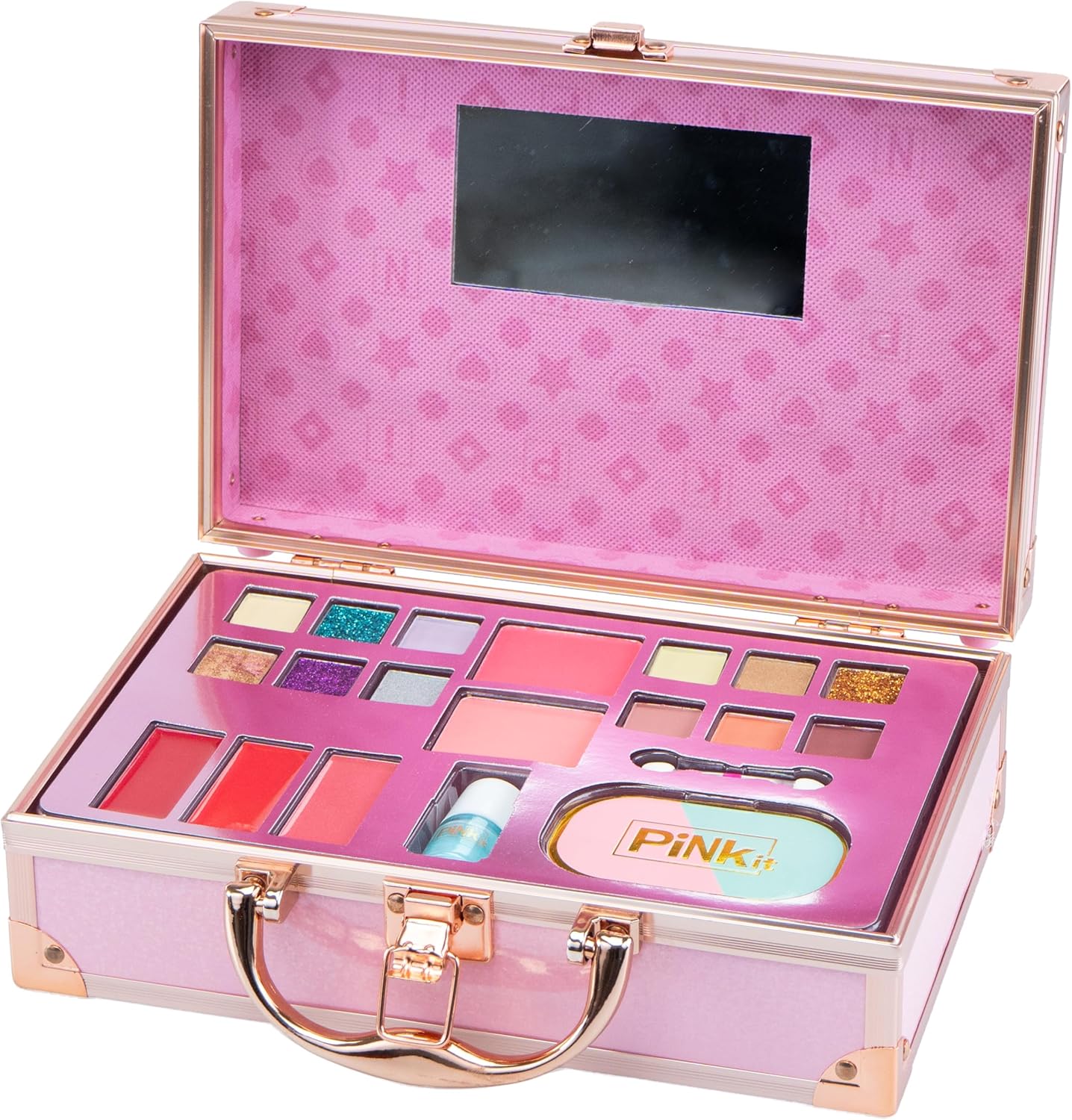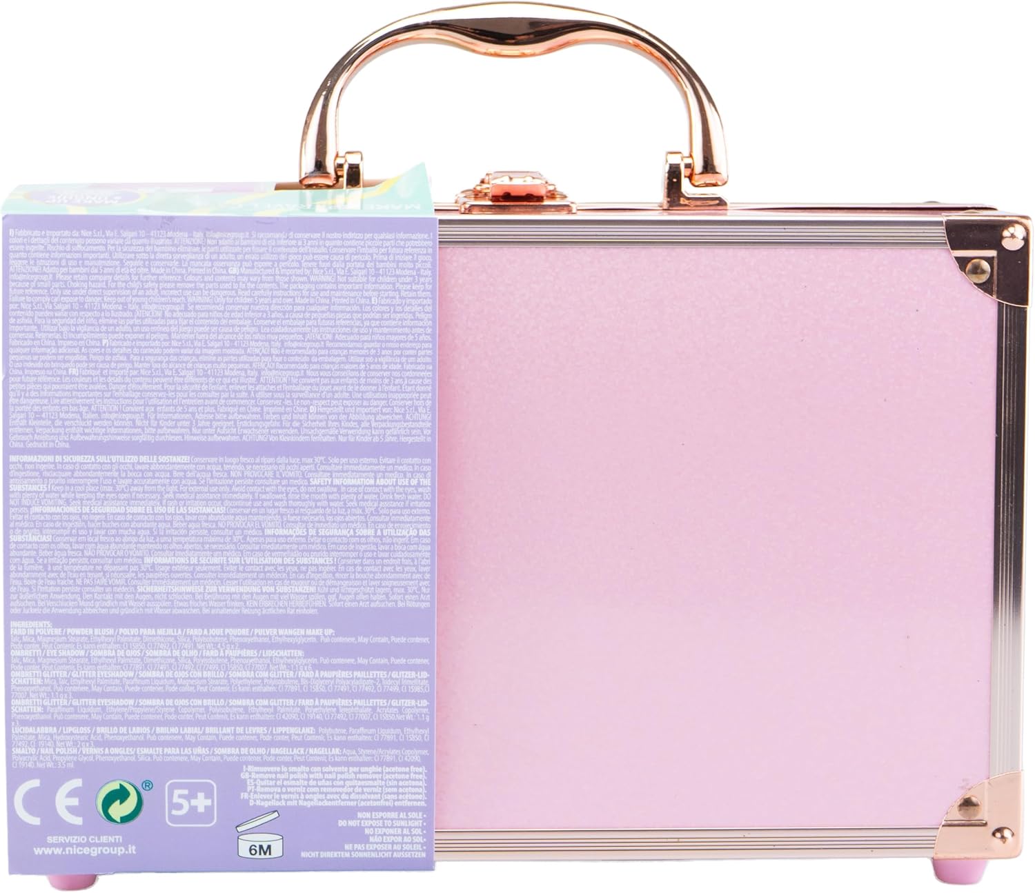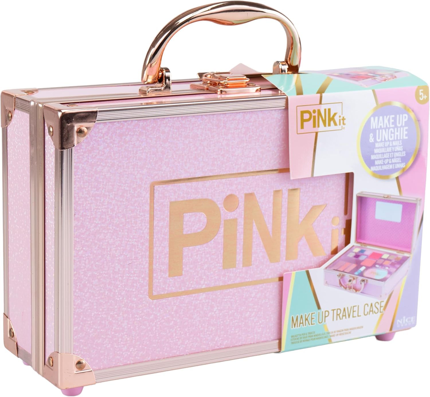 PINKIT Make Up TRAVEL CASE: è una valigetta porta trucchi dal design glamour, decorata con rifiniture dorate, che contiene un set di trucchi assortiti per bambine. CARATTERISTICHE: il set da trucco per bambini è realizzato con materiali testati, sicuri, senza parabeni, atossici e risultano facilmente rimuovibili dalla pelle con l’uso dell’acqua e di detergente delicato. Lo specchio è inserito all’interno del coperchio. Lo scomparto interno mantiene ogni prodotto al suo posto, rendendo la valigetta ordinata. La maniglia facilita il trasporto a mano del Travel Case Trucchi. UTILIZZO: il Make Up Case aiuta a stimolare la manualità, la coordinazione e le capacità di immaginazione di ogni bambino e bambina che vuole sentirsi da favola, senza porre limiti alla fantasia nei trucchi e travestimenti. DIMENSIONI: L 25 cm x A 18 cm x P 9 cm. Grazie alla forma compatta e alla pratica maniglia posta sulla parte superiore, la valigetta cofanetto la si può portare sempre con sé. CONTENUTO: 1 valigetta con 12 ombretti, 2 fard, 1 smalti, 3 lucidalabbra, 1 applicatore, 1 lima per le unghie, 1 specchio. Prodotto ORIGINALE Pink it. Età consigliata: 5+