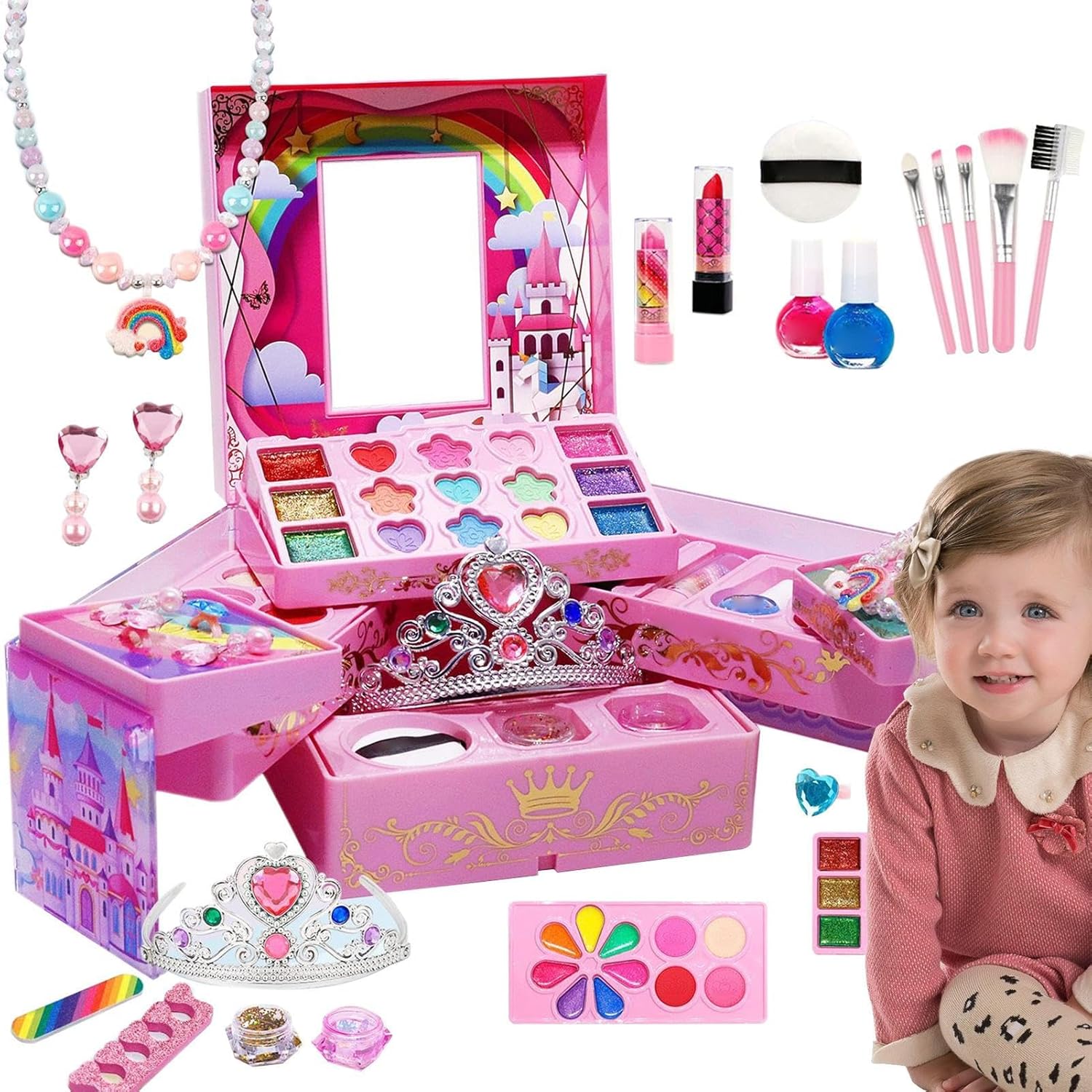 Set di giochi finti per bambini: include tavolo da trucco e set di strumenti, set di accessori e set di giochi finti per bambini in di creare ore di gioco di gioco divertente Sicuro per il bambino: progettato per i bambini, questo finto kit di trucco è realizzato, materiali innocui e solubili in acqua che non irritano la pelle delicata. È per il gioco fantasioso e si facilmente con sapone e pace di mente Portato comodamente: lascia che la tua bambina organizzi facilmente i suoi accessori per il trucco con una moltitudine di scomparti in questo kit di trucco finta. È progettato con una maniglia ed è compatto, pulito e portatile, rendendo facile da portare in vacanza o in auto Educativo e intellettuale: ogni tonalità di trucco e smalto in questo kit apre più possibilità. Creatività, questo set consente ai bambini di sperimentare un aspetto diverso ed esprimersi attraverso il trucco, raddoppiando anche come un divertente arte e attività artigianale Presente per gli amici: impressiona i tuoi adorabili bambini con questo regalo creativo, con un design unico e adorabile esprimere il tuo amore e la tua cura