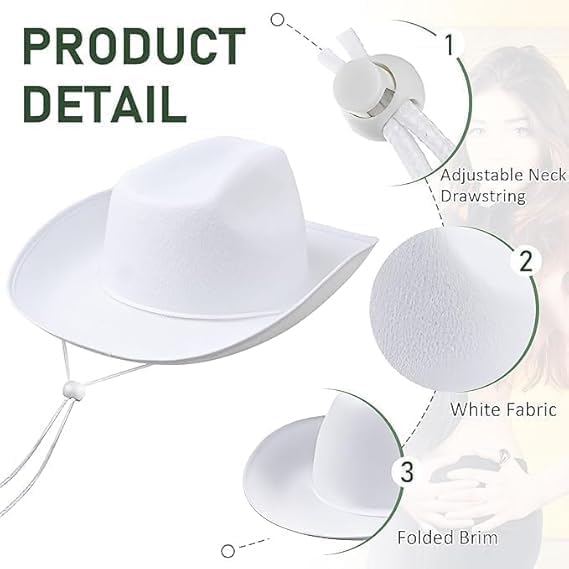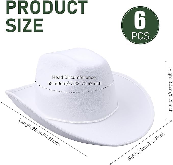 Descrizione prodotto Set di 6 – CAPPELLI DA COW-BOY BIANCO: Ogni ordine include 6 cappelli da cowboy bianchi in feltro, taglia unica, adatti alla maggior parte degli adolescenti e degli adulti. Dimensioni interne del cappello: 8 x 7 pollici/20 x 18 cm. Dimensioni esterne: 38 cm di lunghezza x 30 cm di larghezza x 13 cm di altezza. Circonferenza testa interna: 58 cm. Comodo da indossare: i cappelli da cowboy in feltro sono progettati per adattarsi a bambini grandi, adolescenti e adulti. Sono solidi, non morbidi, e sono dotati di un cordino regolabile per tenere il cappello in posizione se scivola o cade. DESIGN CLASSICO DI ALTA QUALITÀ: Offrendo un buon comfort a prezzi accessibili, i nostri cappelli in stile western sono ben realizzati, durevoli, robusti ed estetici. Sono accuratamente confezionati in un sacchetto trasparente per evitare sporco e danni durante il trasporto. Progetto fai da te: questi cappelli da cowboy semplici possono essere dipinti e personalizzati secondo i tuoi desideri. Puoi creare cappelli da sceriffo con una stella o abbinarli a un abito bianco. Il design unisex è adatto sia per donne che per uomini. Perfetto per feste e travestimenti: questi cappelli da cowboy per donne e uomini sono adorabili! Perfetti per giochi di travestimento, feste di compleanno a tema, addio al nubilato, Halloween, accessori per costumi, abiti western, decorazioni per cabina fotografica e molto altro ancora. Avviso di sicurezza 48