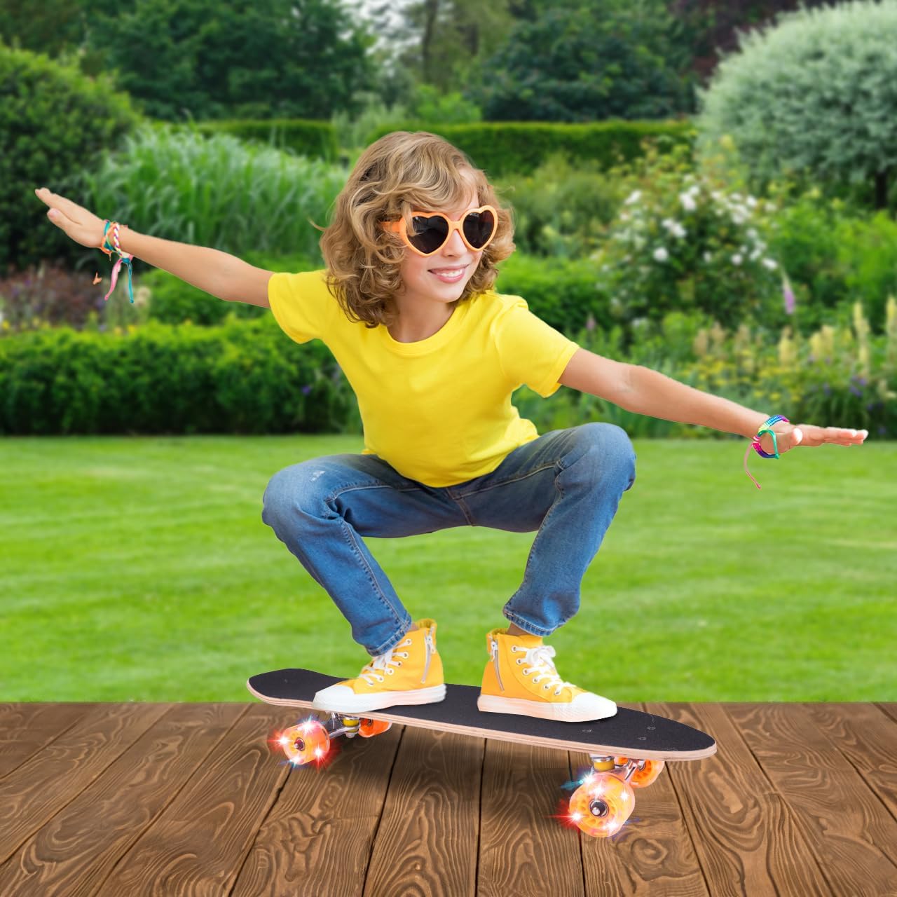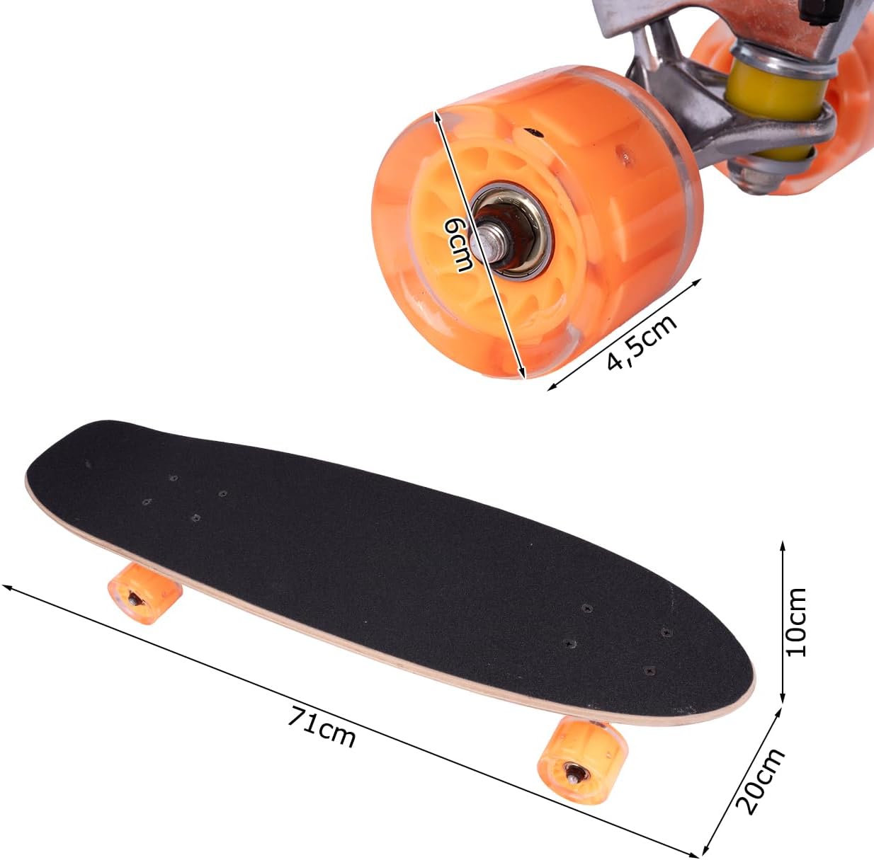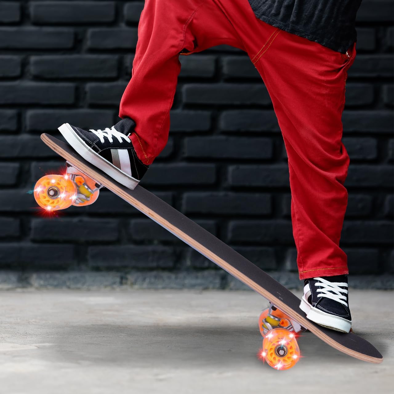 Materiali di alta qualità e costruzione durevole: il ponte è realizzato in legno di acero cinese a 7 strati, robusto ma leggero. Grandi ruote in gomma e cuscinetti ABEC-7 ad alte prestazioni: le ruote in PU da 60 mm offrono un buon assorbimento degli urti e sono dotate di LED. I cuscinetti ABEC-7 garantiscono una guida fluida. Ruote con luci a LED: aumentano la visibilità e la sicurezza, soprattutto al buio, e rendono la guida più emozionante. Piattaforma antiscivolo: la piattaforma antiscivolo garantisce stabilità e impedisce scivolamenti indesiderati. Ideale per l'attività fisica: lo skateboard favorisce la coordinazione motoria, la concentrazione e rinforza i muscoli mentre ci si diverte e si sta all'aria aperta.