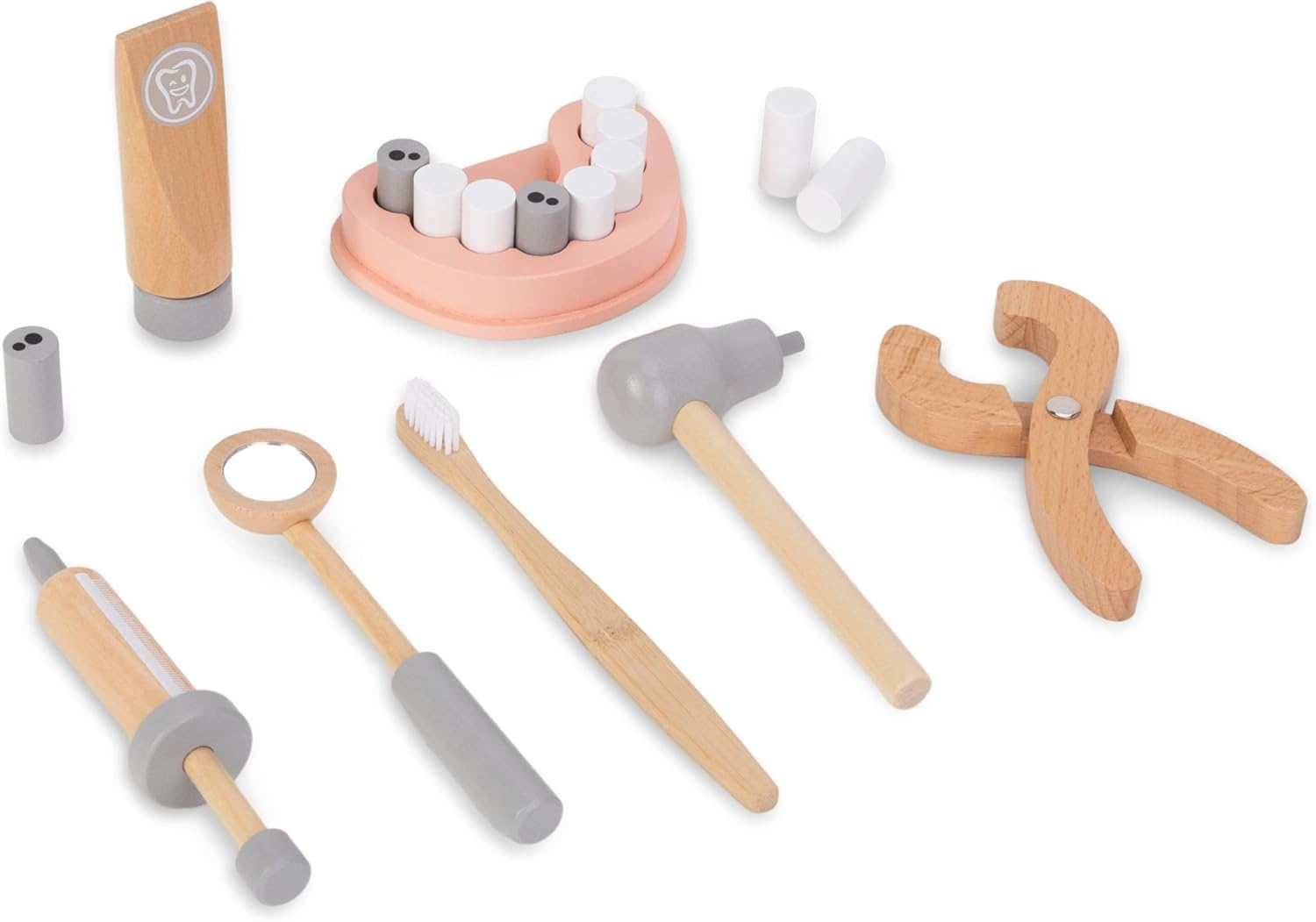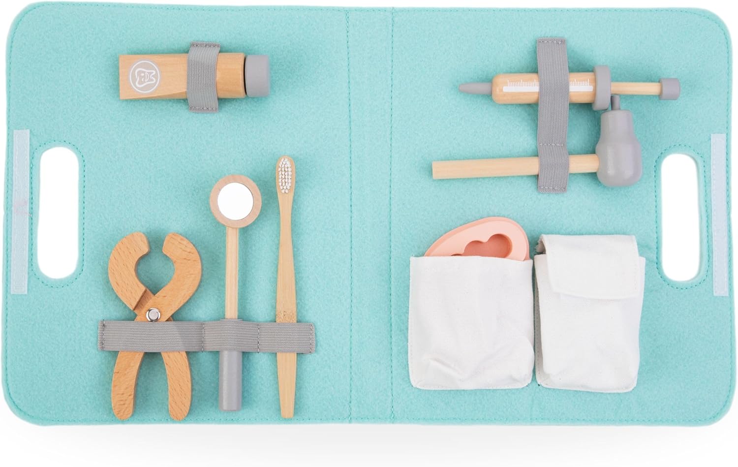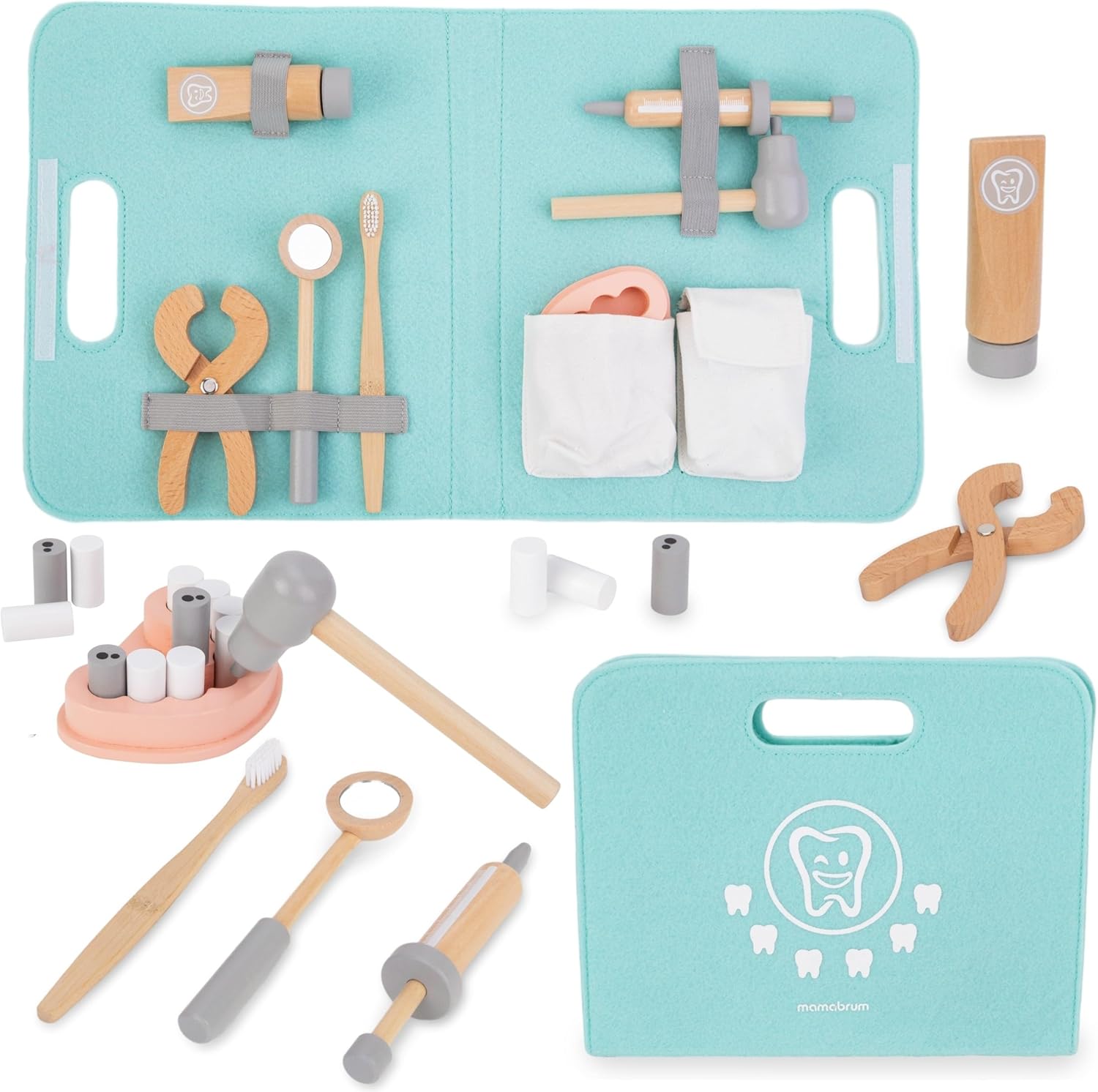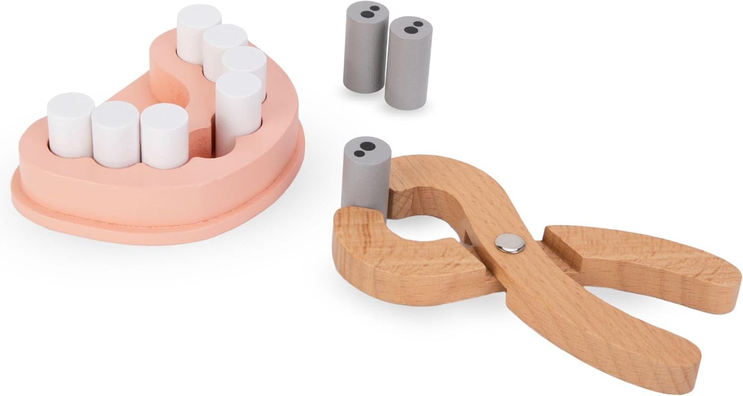 Gioco di ruolo educativo: Permette ai bambini di impersonare un dentista, stimolando l'immaginazione e insegnando l'importanza dell'igiene orale Materiali di alta qualità: Realizzato in legno robusto con una lavorazione precisa, garantendo sicurezza e durata nel tempo Accessori completi: Include tutti gli strumenti necessari, come specchio dentale, spazzolino e 11 denti in legno, per un'esperienza di gioco autentica Design minimalista: Estetica semplice e attraente, perfetta per integrarsi con il resto dei giocattoli nella cameretta dei bambini Adatto per bambini dai 3 anni in su: Promuove lo sviluppo delle capacità motorie e sociali attraverso il gioco collaborativo e la simulazione