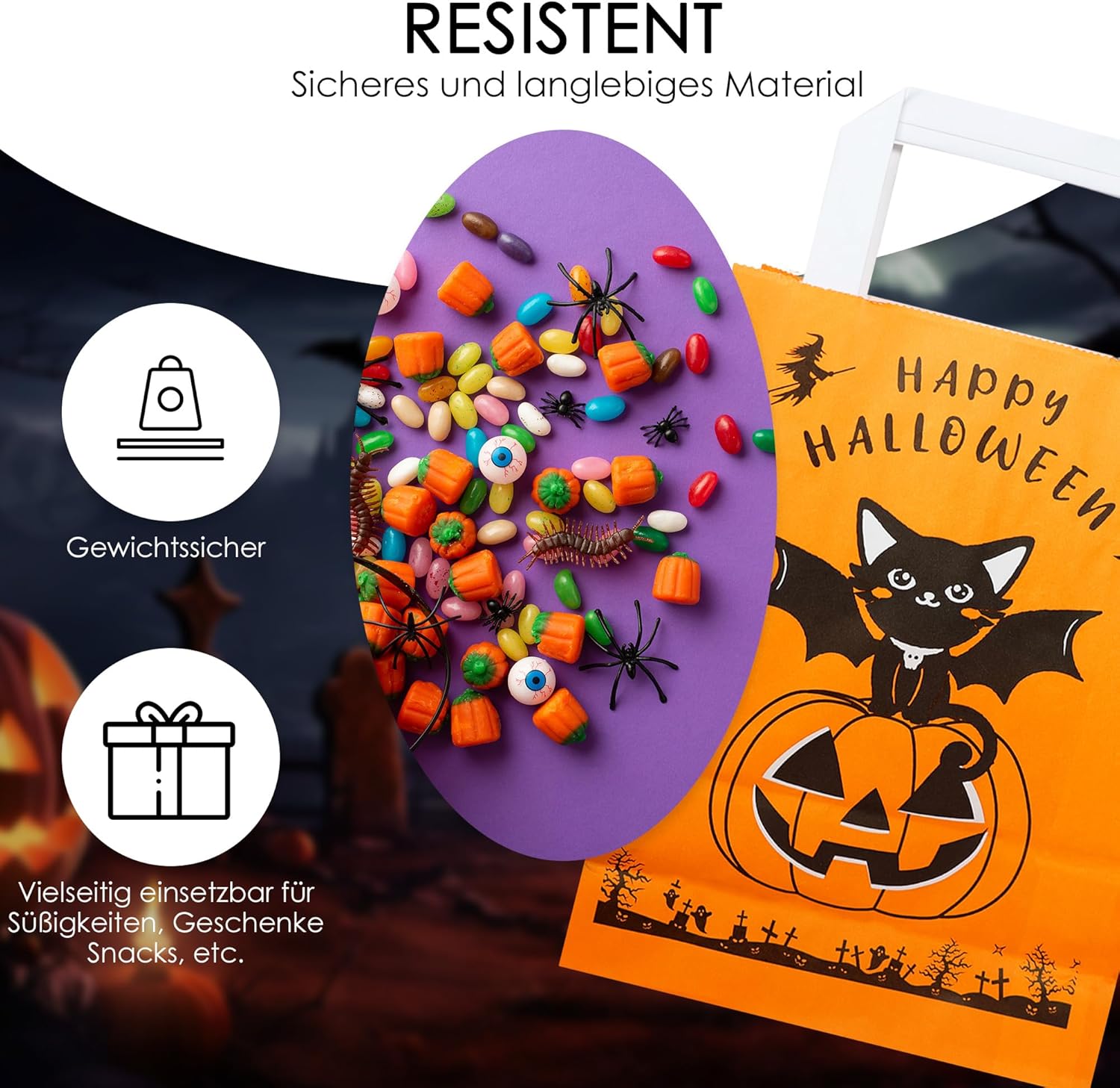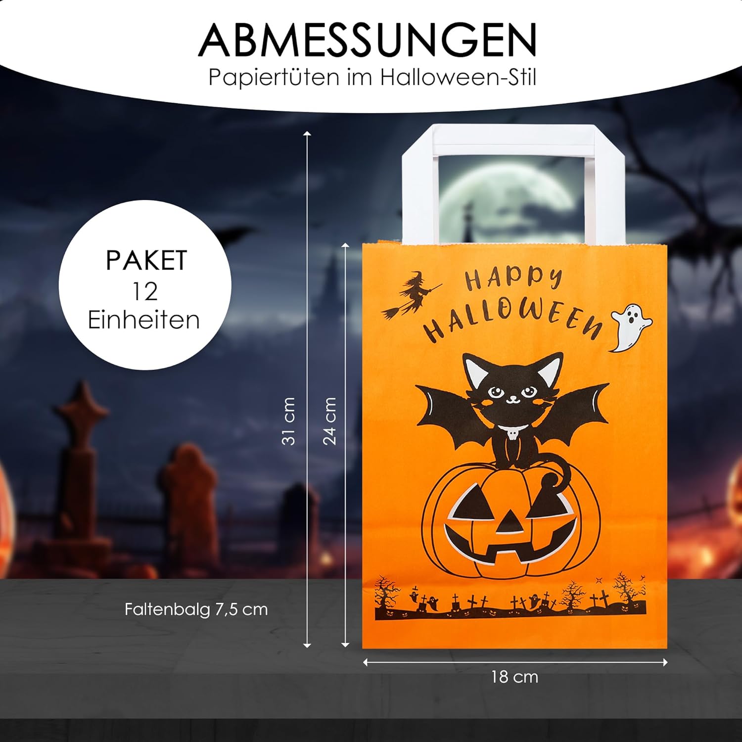 DIMENSIONI: Larghezza della borsa 18 cm. Altezza della borsa senza manico 24 cm. e larghezza del tassello 8 cm. ALTA RESISTENZA: realizzata in carta pesante, molto resistente e durevole, manici in carta rinforzata RICICLABILE: carta di cellulosa riciclata ecologica UTILIZZO: Borsa Halloween per bambini, buona capienza e resistenza per un giorno speciale. GARANZIA: Il nostro prodotto offre una garanzia di restituzione di 30 giorni, se hai domande puoi contattare il nostro servizio clienti.