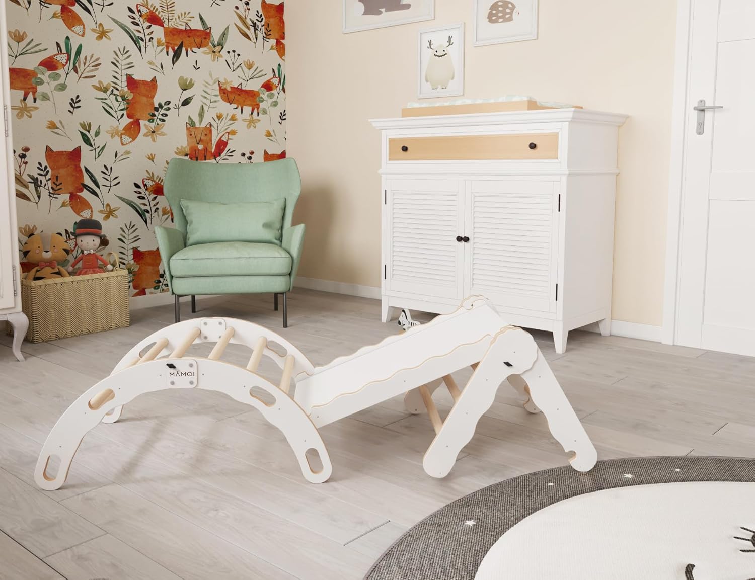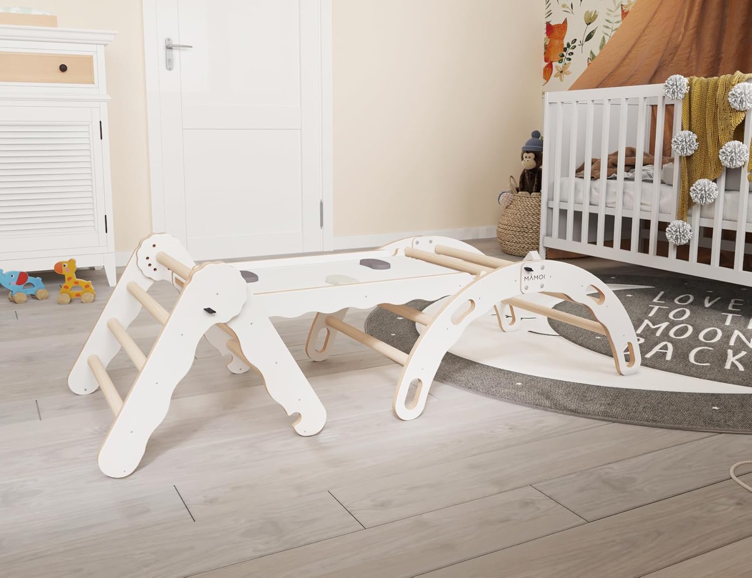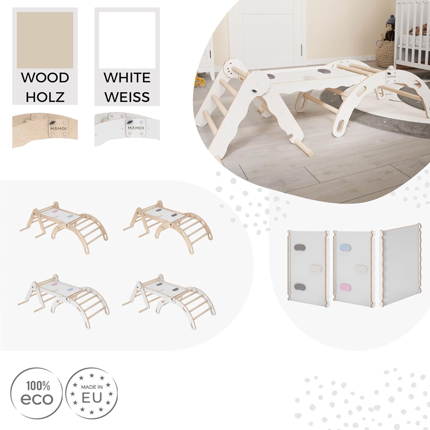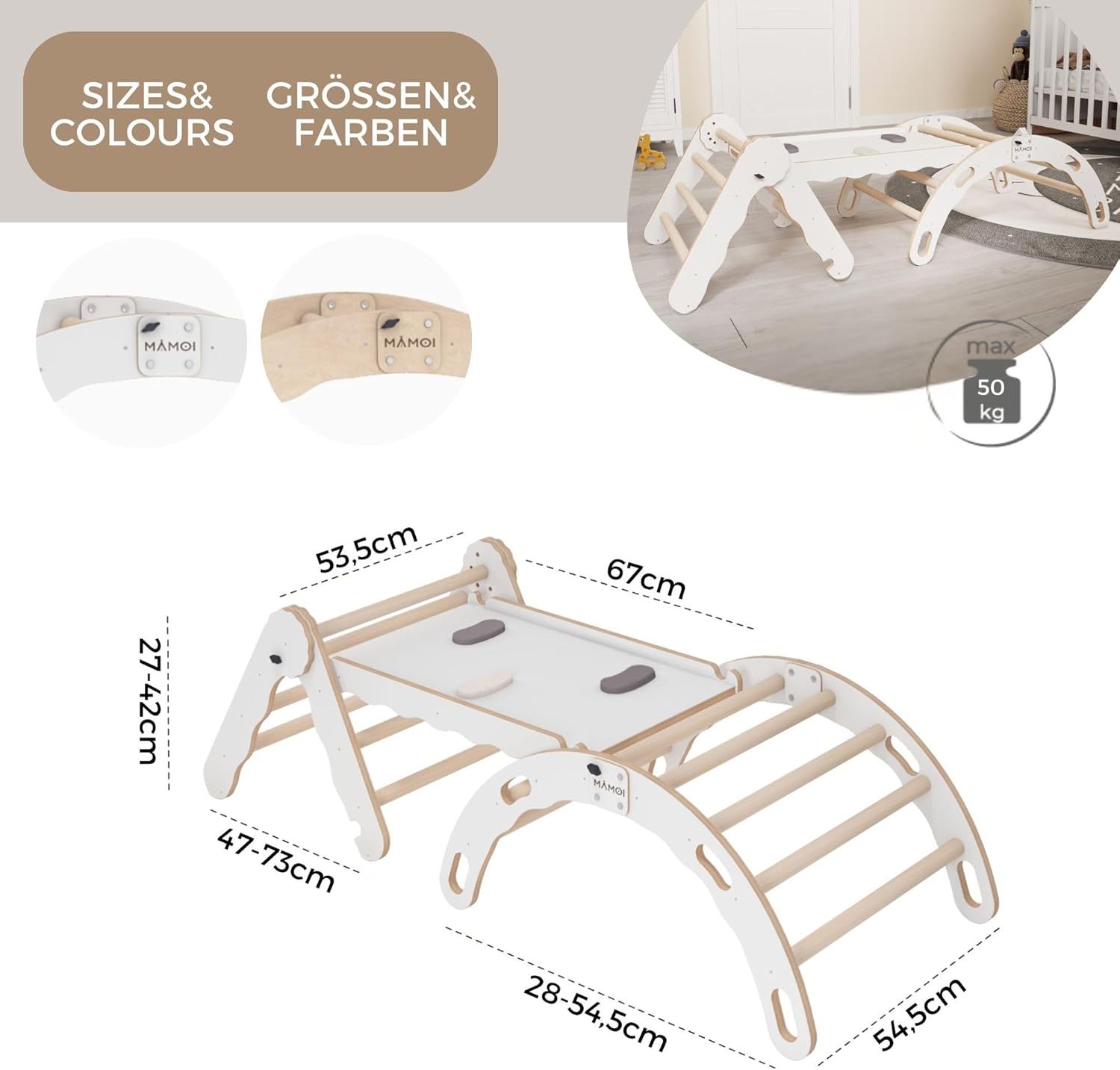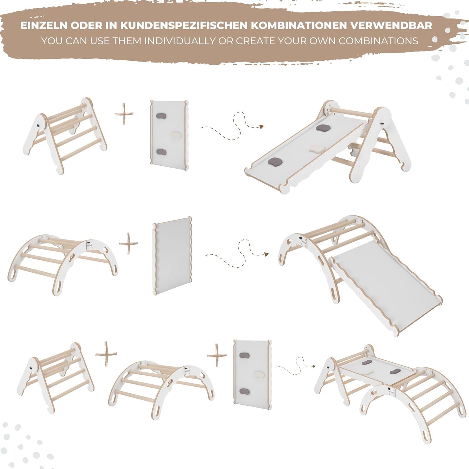 ✔ Il kit della parete arrampicata bambini con lo scivolo per bambini viene fabbricato in legno di pino e in legno compensato, il che lo rende stabile. Gli elementi sono finemente levigati, in modo che siano privi degli spigoli vivi. I triangolo rampicanti vengono fissati con viti a testa martello resistenti. . ✔ Il kit arrampicata per bambini viene fabbricato in legno di pino tagliato al CNC e in legno compensato di alta qualità. I giocattoli sono rispettosi dell’ambiente, e anche sicuri per i bambini. Nella fabbricazione vengono utilizzate oliature e vernici ecologiche che non provocano reazioni allergiche. La parete arrampicata bimbi è disponibile con una rifinitura naturale, senza l'uso di vernici. ✔ I prodotti progettati per l'autoassemblaggio. L'assemblaggio del kit da triangolo arrampicata bambini è facile. I prodotti possono sostenere un peso fino a 50 kg e sono destinati ai bambini di età superiore ai 9 mesi. Il kit da arrampicata bambini è adeguato ai bambini di diverse età, a seconda del loro peso e della loro altezza. ✔ Il design moderno si armonizzi bene ad ogni stanza. Il telaio di gioco arrampicata bambini in finitura naturale è leggero e si abbina a tutti gli stili di arredamento. Il design universale si abbina particolarmente bene con gli interni in stile scandinavo. Le viti sono dotate di dettagli molto precisi. Il kit completo sembra organico e gli elementi possono essere liberamente organizzati. ✔ Il prodotto può essere utilizzato all'aperto, ma deve essere conservato in un luogo asciutto e pulito. A causa dei materiali naturali, non deve essere esposta a condizioni atmosferiche avverse come pioggia o neve. Il produttore non è responsabile per il mancato rispetto delle condizioni di conservazione delle istruzioni del giocattolo.