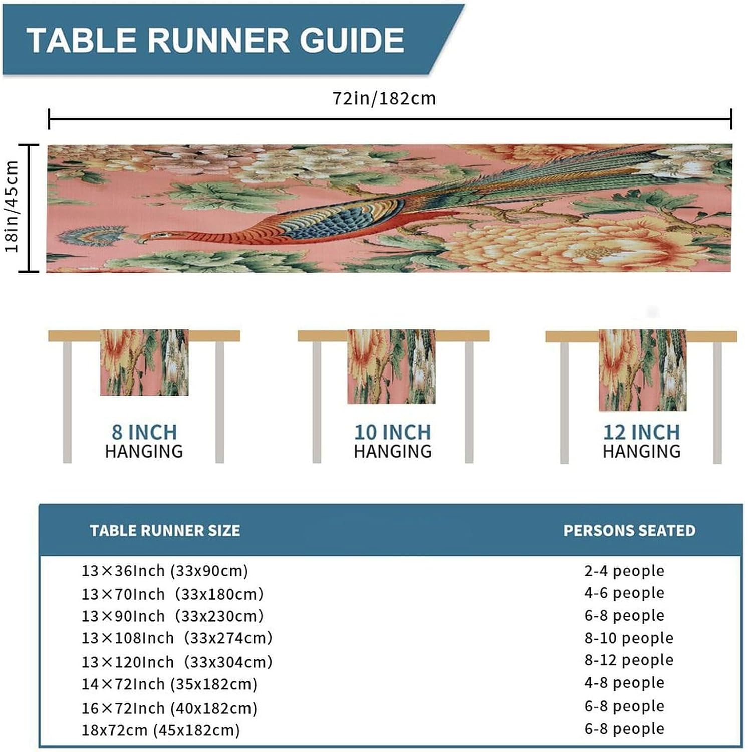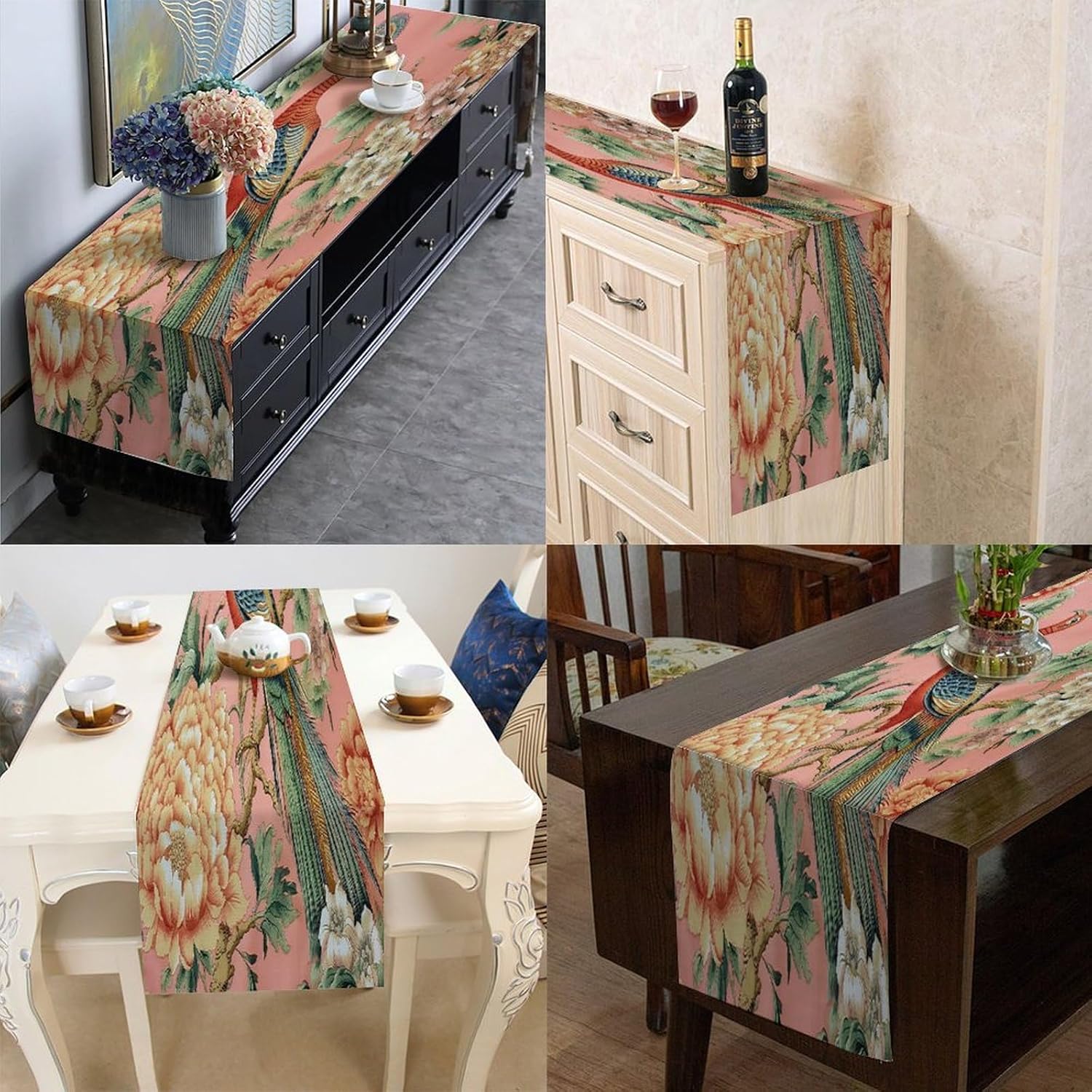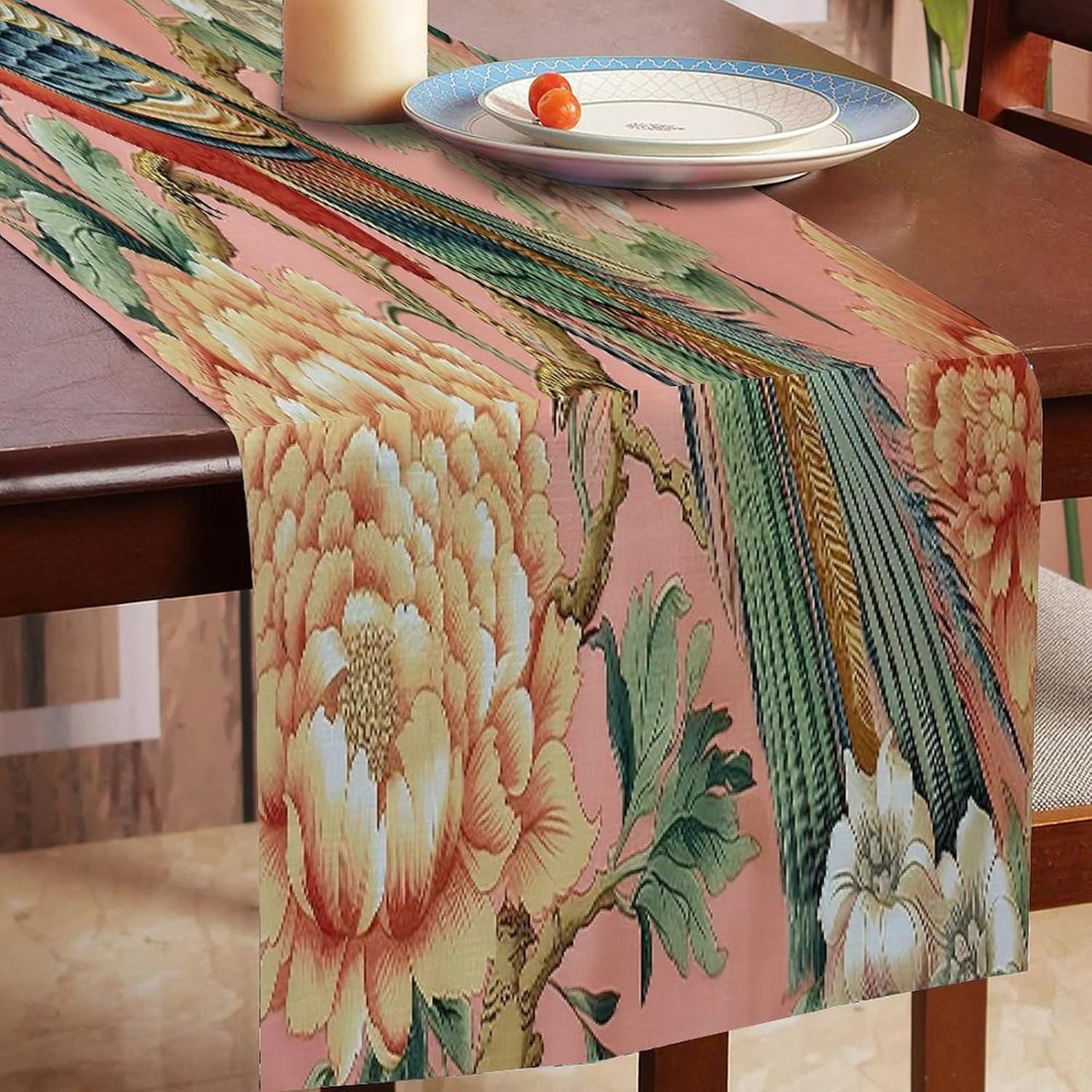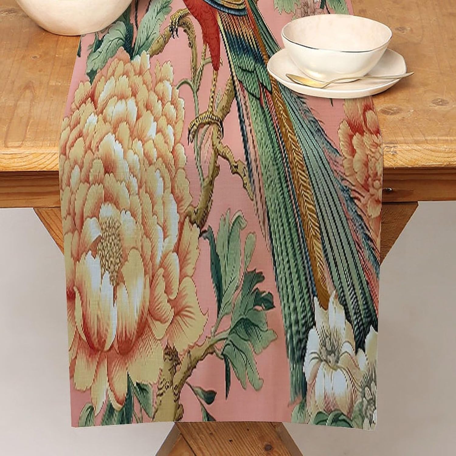 Manor Blush Chinoiserie Bird Peony Runner da tavolo 45,7 x 198,1 cm, tovaglia decorativa per la casa, per cucina, sala da pranzo, feste, riunioni di famiglia, vacanze, runner da tavola decorazione