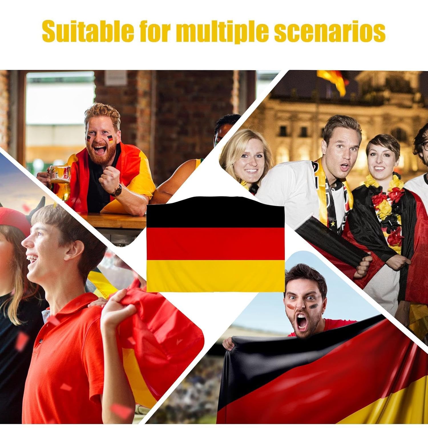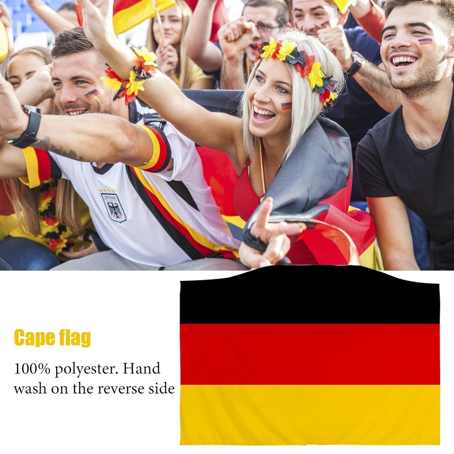 Patriottismo in mostra: svela il tuo orgoglio con un design unico; questo mantello con bandiera tedesca, adornato con gli accattivanti colori nero, rosso e oro, ti assicura di esprimere magnificamente il patriottismo. Materiale: il nostro mantello con bandiera tedesca è realizzato in poliestere di prima qualità, garantendo durata e uso a lungo termine. Il mantello è morbido, confortevole e resistente allo sbiadimento, fornendo una buona sensazione e rendendolo facile da pulire. Facile da indossare: infilati nello spirito della festa; mentre indossi le maniche, srotolando il mantello rivela una bandiera a grandezza naturale, incarnando l'orgoglio nazionale ad ogni allungamento delle braccia. Uso versatile: perfetto per eventi sportivi tedeschi, questo mantello con bandiera inizia l'atmosfera celebrativa di rivalità e competizioni, promuovendo il cameratismo e lo spirito di squadra tra i fan. Ottimo per la famiglia o gli amici, il mantello con bandiera tedesca è un modo per mostrare il tuo orgoglio nazionale in eventi sportivi e occasioni speciali. Dai il perfetto e fai una dichiarazione.