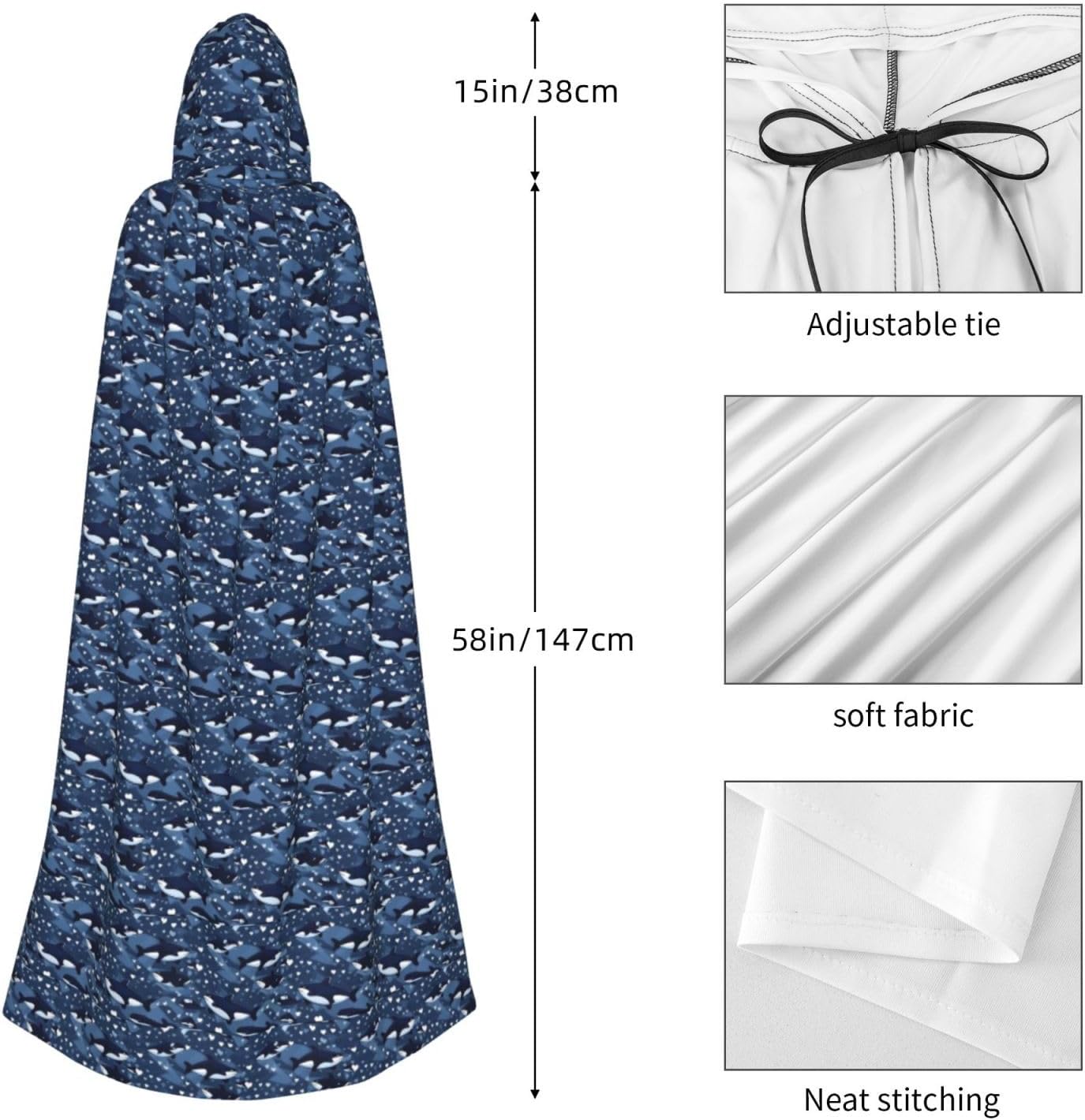 Materiale e design della balena killer blu: il tessuto è realizzato in 100% fibra di poliestere (poliestere) tessuto di alta qualità, morbido e confortevole. Il design con cappuccio non è solo elegante e bello, ma fornisce anche calore extra alla testa e al collo. Caratteristiche del prodotto: il poncho oversize con cappuccio è un poncho con cappuccio senza lacci, senza cerniera, comodo realizzato in tessuto lungo, resistente e non prurito. Dimensioni del prodotto: il cappello misura 38,1 cm di altezza, 147,3 cm di lunghezza, 154 cm di larghezza. Adatto per occasioni: feste di Natale, feste di Halloween, feste in costume, celebrazioni pagane. Ideale per travestimenti, cosplay, costumi da scena, streghe, vampiri, royalty, scelta regalo perfetta per amici o familiari. Persone applicabili: adulti, unisex