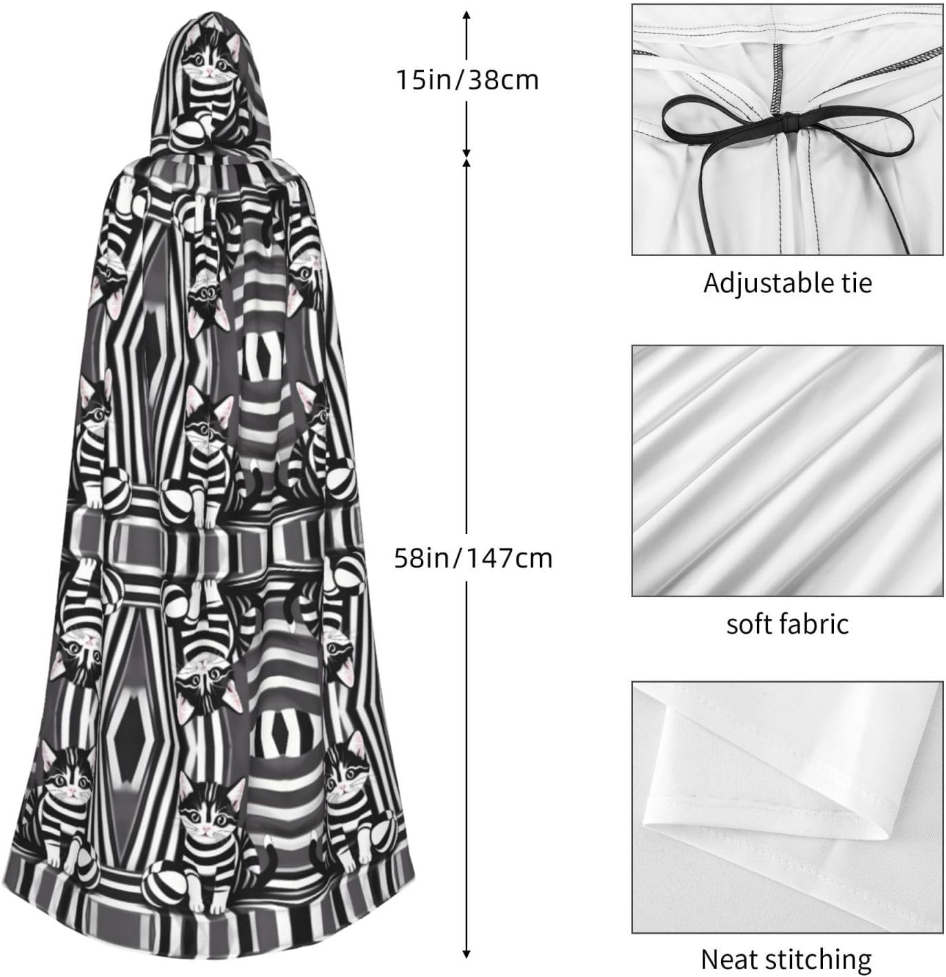 Materiale e design a righe bianche e nere: il tessuto è realizzato in 100% fibra di poliestere (poliestere) tessuto di alta qualità, morbido e confortevole. Il design con cappuccio non è solo elegante e bello, ma fornisce anche calore extra alla testa e al collo. Caratteristiche del prodotto: il poncho oversize con cappuccio è un poncho con cappuccio senza lacci, senza cerniera, comodo realizzato in tessuto lungo, resistente e non prurito. Dimensioni del prodotto: il cappello misura 38,1 cm di altezza, 147,3 cm di lunghezza, 154 cm di larghezza. Adatto per occasioni: feste di Natale, feste di Halloween, feste in costume, celebrazioni pagane. Ideale per travestimenti, cosplay, costumi da scena, streghe, vampiri, royalty, scelta regalo perfetta per amici o familiari. Persone applicabili: adulti, unisex