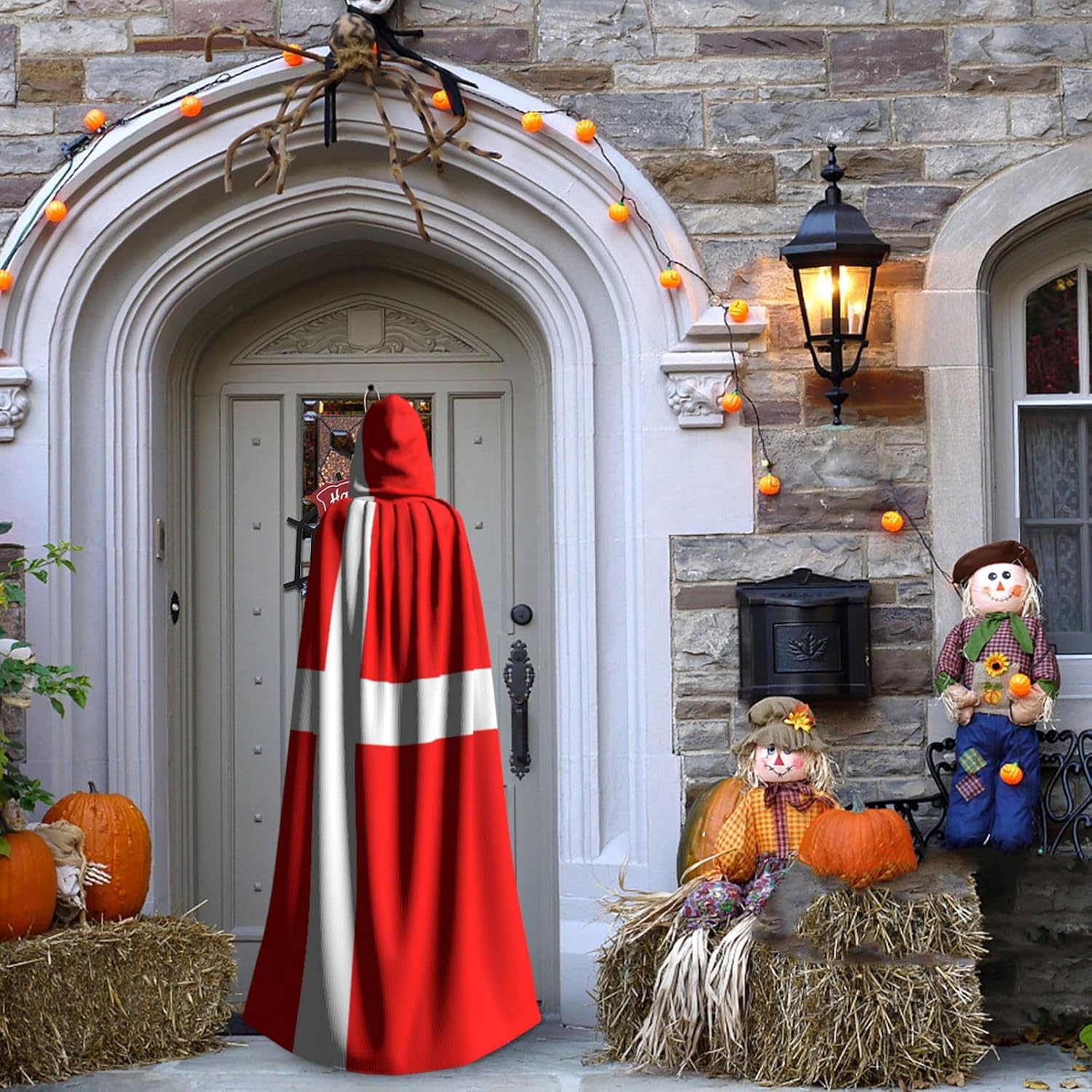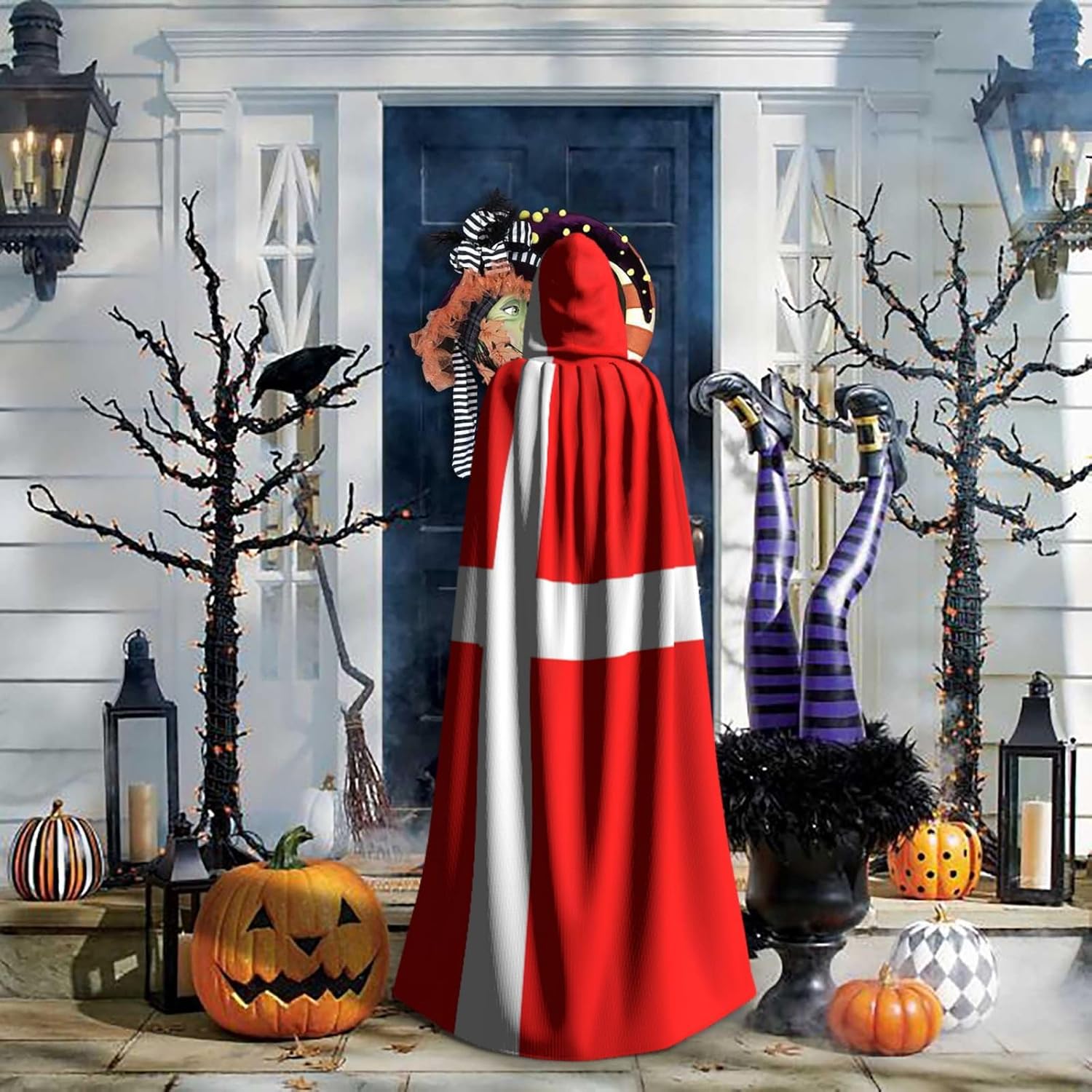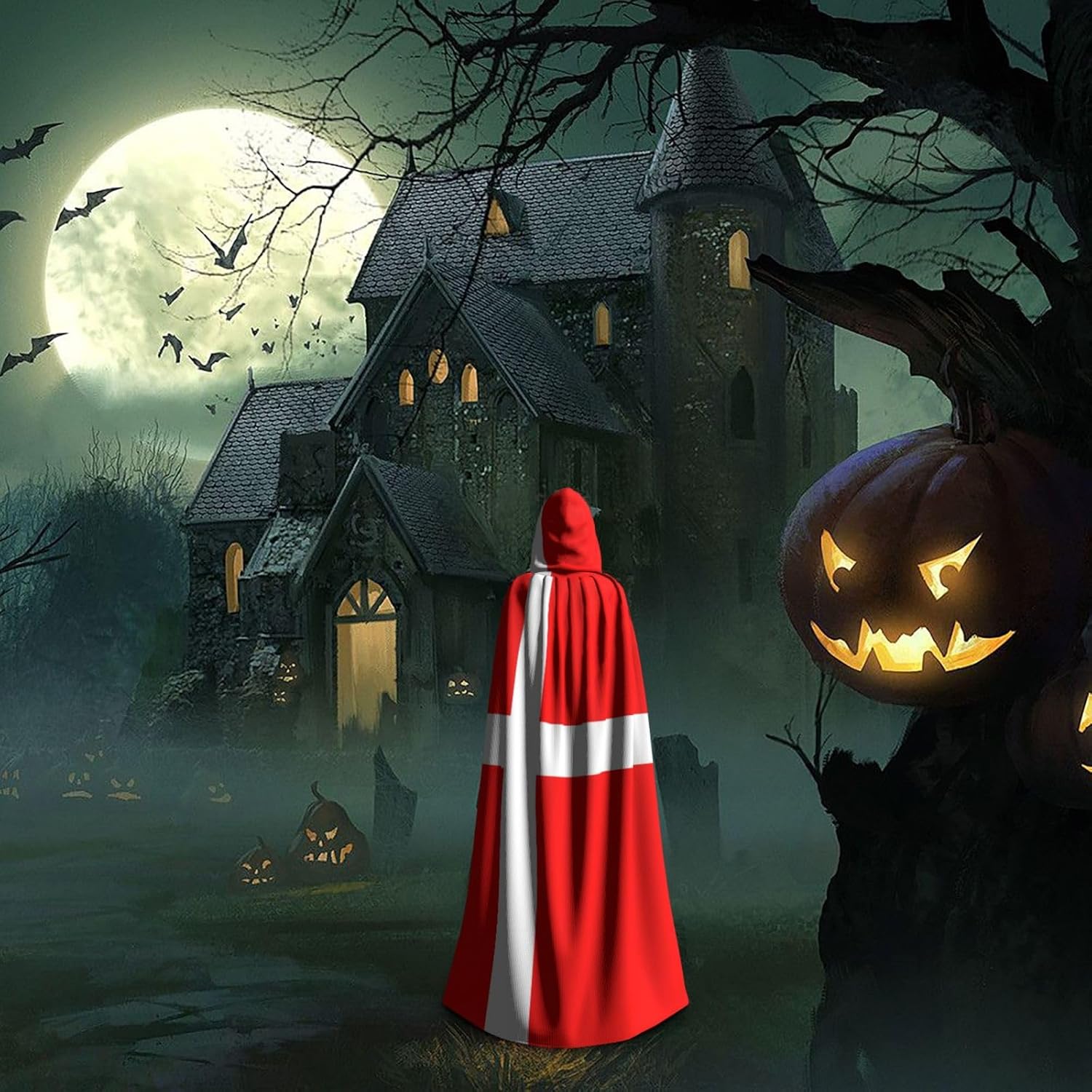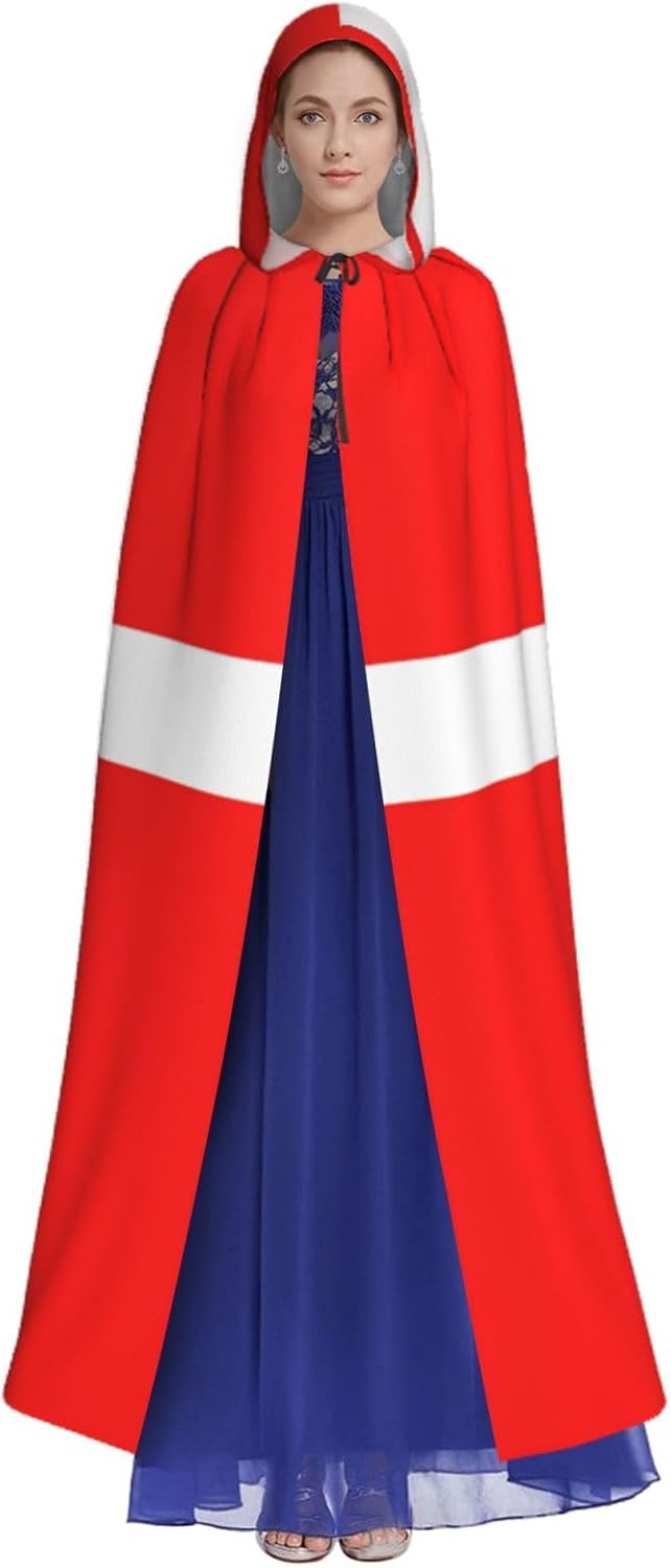 Mantello con cappuccio con bandiera danese della Danimarca, mantello medievale per Halloween, mantello da mago, mantello nero, costume da strega per adulti