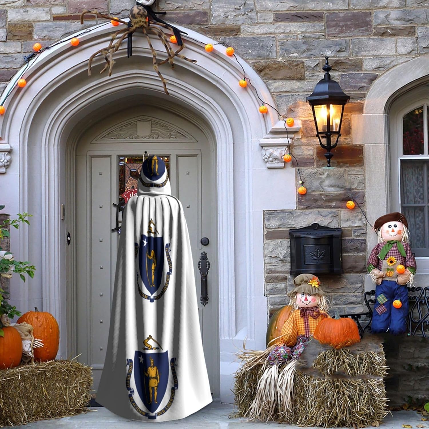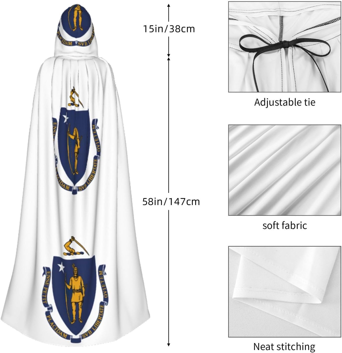 Mantello con cappuccio con bandiera del Massachusetts, mantello medievale per Halloween, mantello da mago, mantello nero, costume da strega per adulti