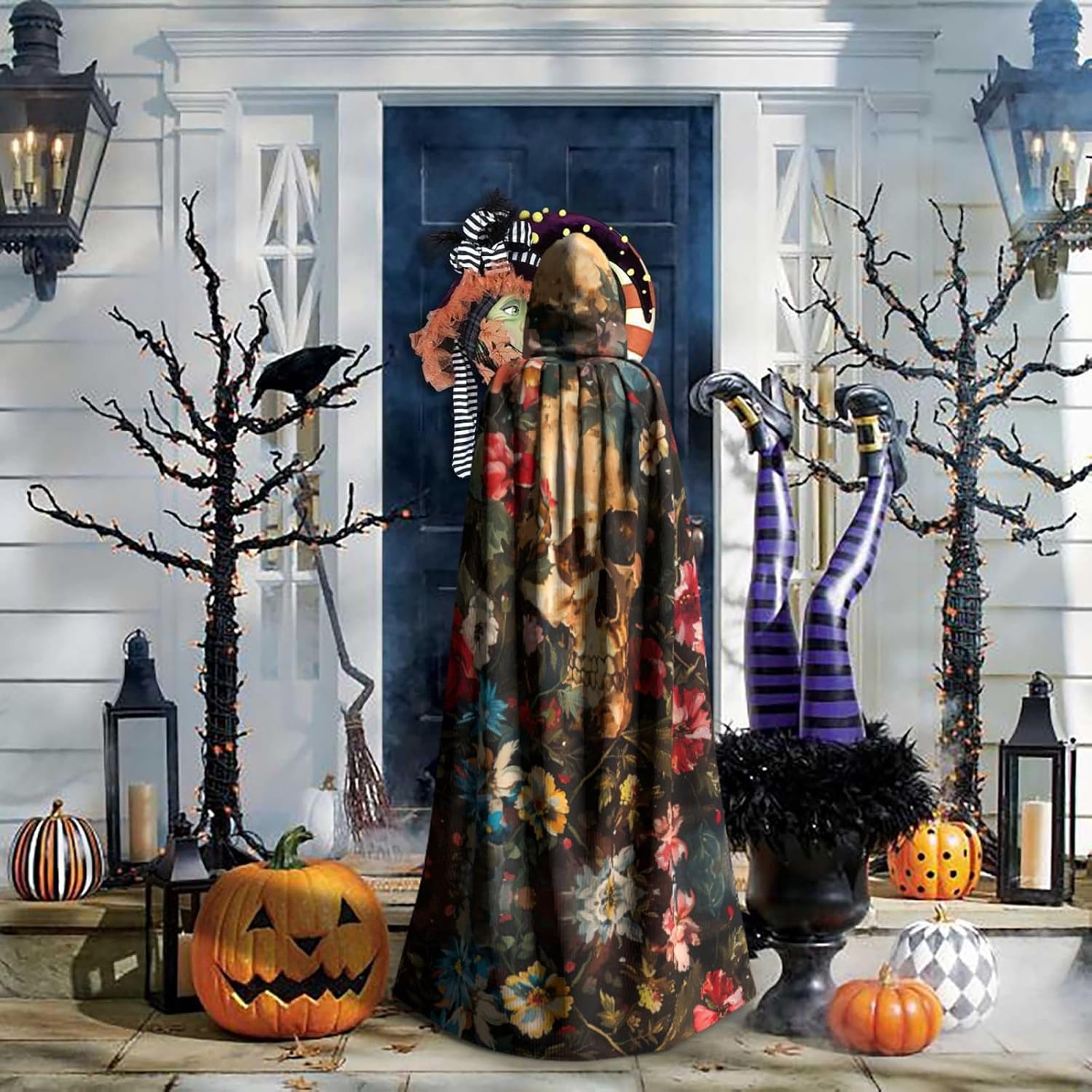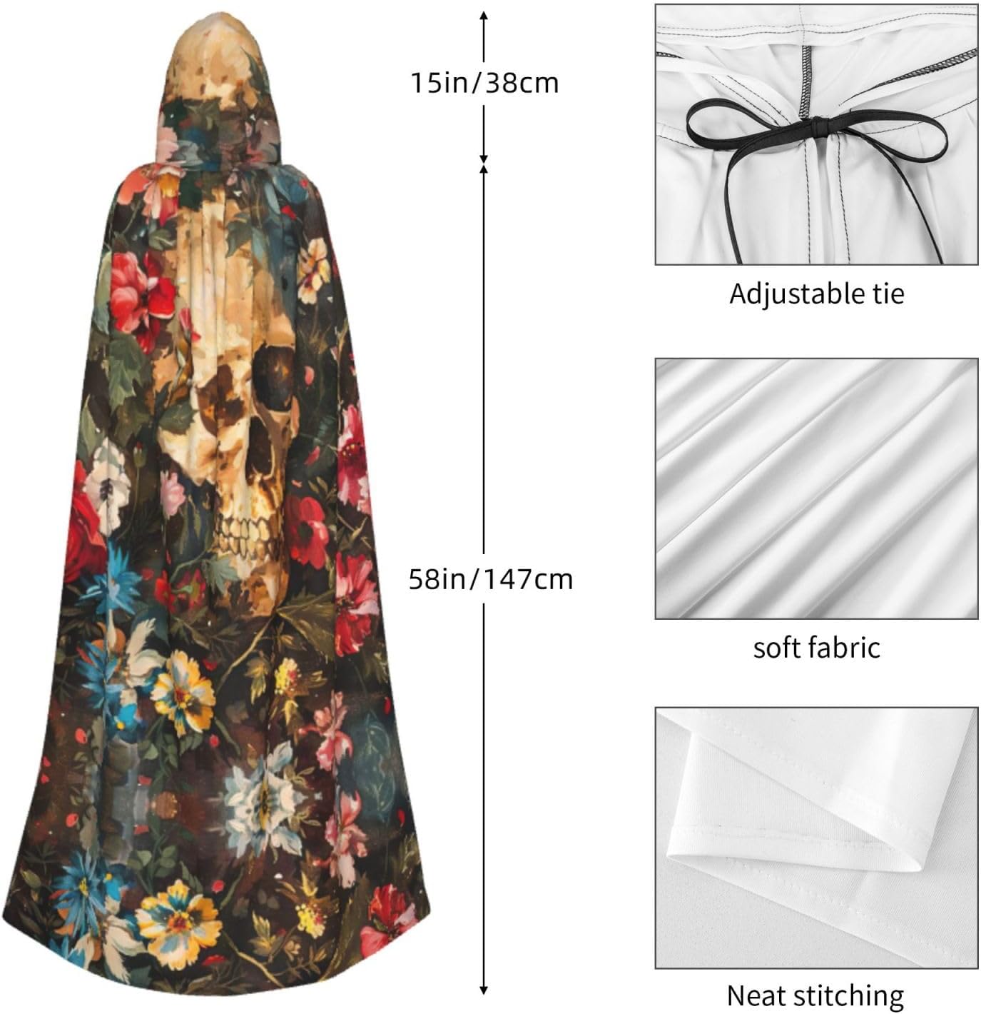 Il design senza cerniera, abbinato a un grande mantello con cappuccio e cravatta al collo, migliora il tuo mistero mantenendoti comodo con il suo tessuto non prurito. Con una lunghezza di 147 cm, larghezza di 154 cm e un'altezza del cappuccio di 38 cm, il nostro mantello con cappuccio con stampa floreale con teschio offre una copertura completa, assicurandoti di distinguerti in ogni occasione. Vari eventi come Halloween, cosplay, costumi da palcoscenico, feste a tema, balli, convegni di fumetti e molto altro ancora, il nostro mantello è versatile e conveniente. Facile da mantenere e di lunga durata, il nostro mantello con cappuccio con stampa floreale con teschio è lavabile in lavatrice e lavabile a mano. Con un design neutro, il nostro mantello è perfetto per uomini e donne.