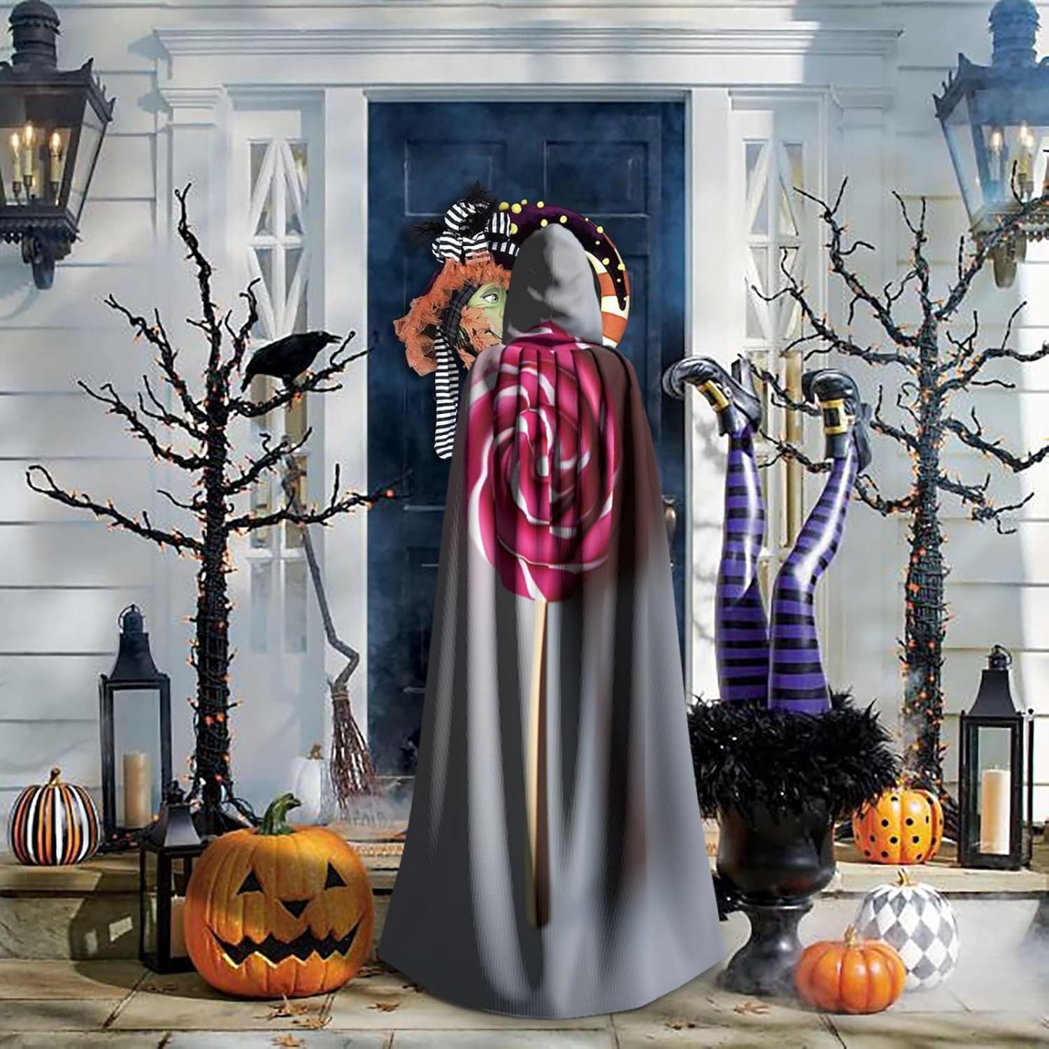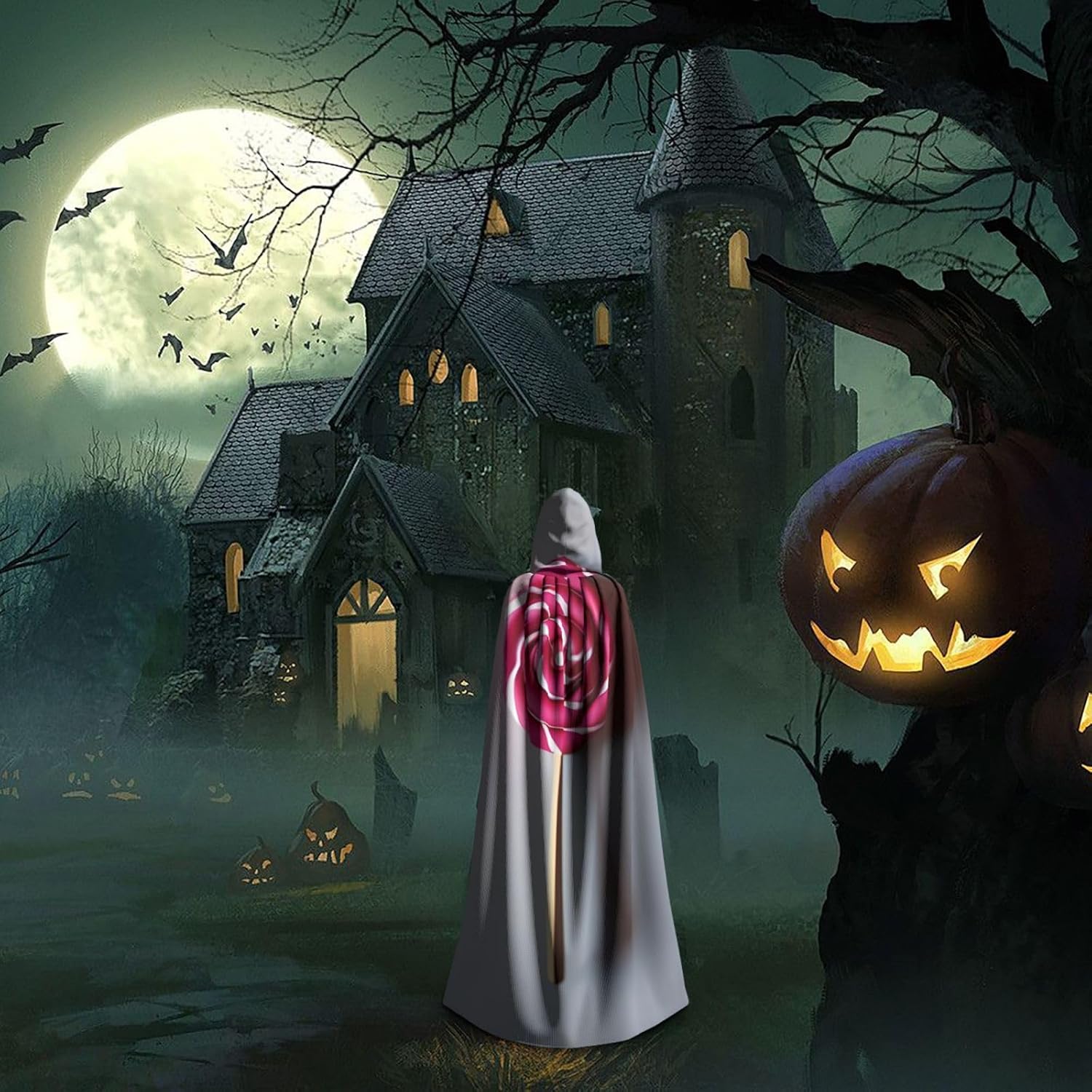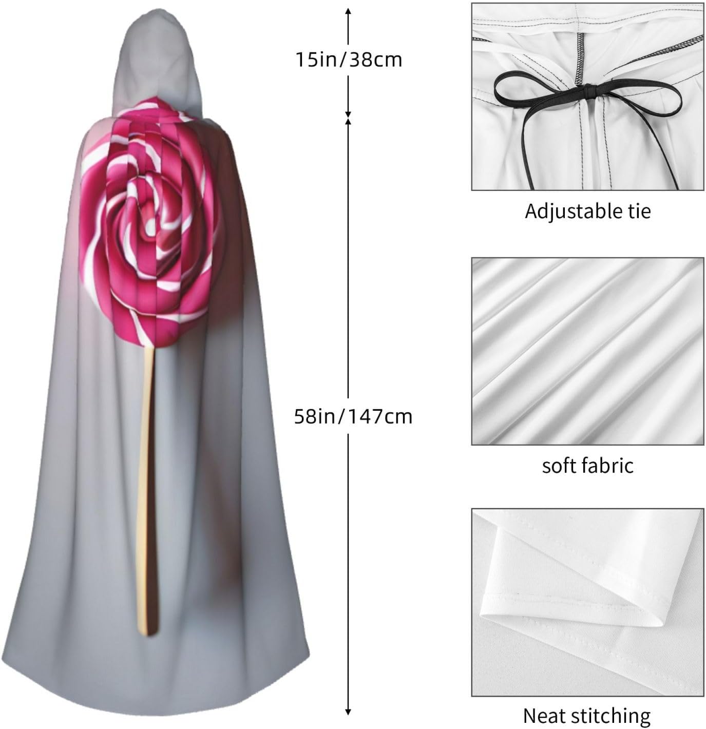 Il design senza cerniera, abbinato a un grande mantello con cappuccio e cravatta al collo, migliora il tuo mistero mantenendoti comodo con il suo tessuto non prurito. Con una lunghezza di 147 cm, larghezza di 154 cm e un'altezza del cappuccio di 38 cm, il nostro mantello con cappuccio con stampa lecca-lecca offre una copertura completa, assicurandoti di distinguerti in ogni occasione. Vari eventi come Halloween, cosplay, costumi da palcoscenico, feste a tema, balli, convegni di fumetti e molto altro ancora, il nostro mantello è versatile e conveniente. Facile da mantenere e di lunga durata, il nostro mantello con cappuccio con stampa lecca-lecca è lavabile in lavatrice e lavabile a mano. Con un design neutro, il nostro mantello è perfetto per uomini e donne.