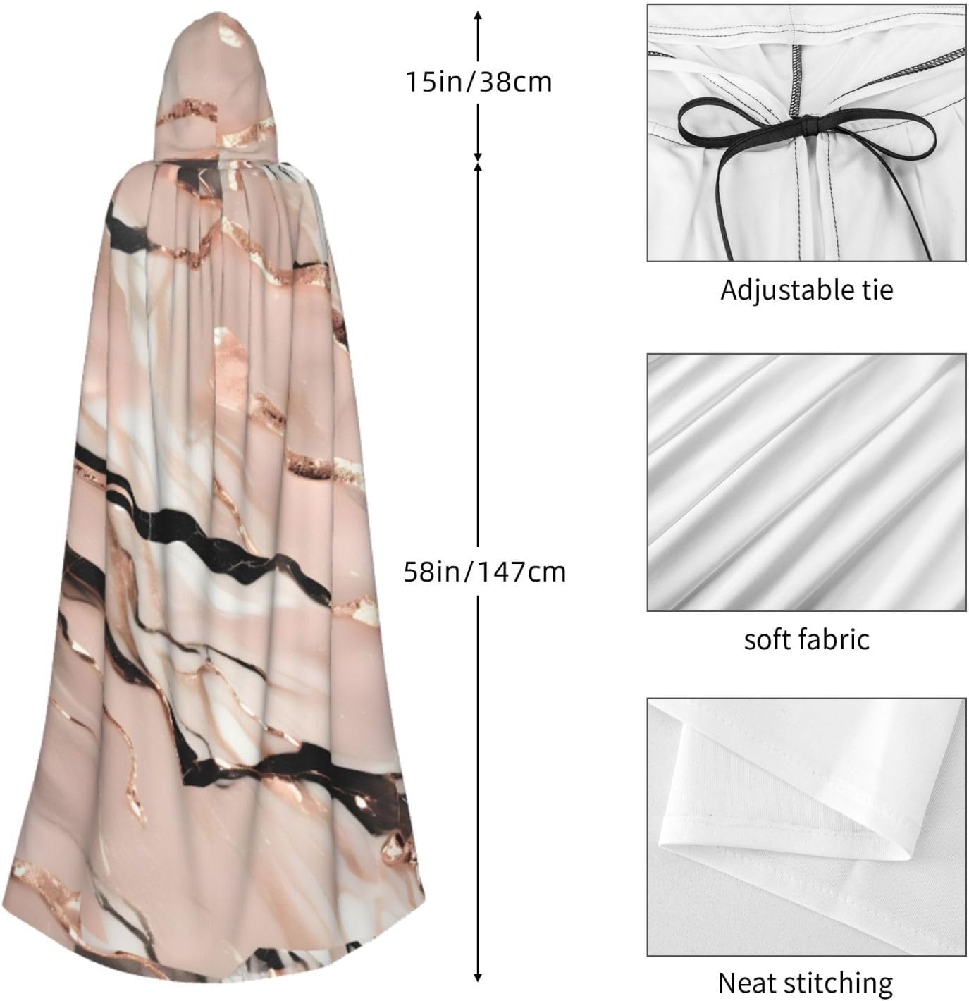 Il mantello con cappuccio per Halloween è realizzato con tessuto in poliestere morbido anche sulla pelle, prevenendo qualsiasi irritazione. Il mantello presenta un ampio cappuccio e uno stile annodato senza cerniere per un design sofisticato ed elegante. Con la sua dimensione universale, offre una copertura completa, adatta a tutti, assicurandoti di distinguerti tra la folla. Questo mantello con stampa in marmo rosso oro non è solo per Halloween; è abbastanza versatile per cosplay, spettacoli teatrali, balli in maschera, feste a tema e molto altro ancora.