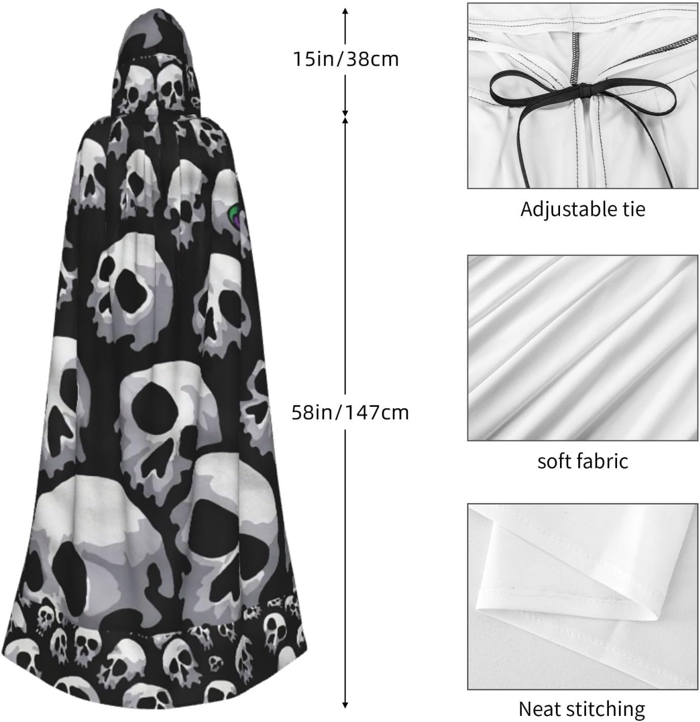 Trasforma le tue feste in costume con il nostro drammatico mantello con cappuccio di Halloween per adulti. Il design a stampa completa prepara le basi per un'esperienza festiva indimenticabile. Realizzato in fibra di poliestere di alta qualità, il nostro mantello garantisce comfort ed è morbido al tatto, eliminando qualsiasi possibilità di prurito. Le dimensioni extra-large e il design con cravatta rendono questo mantello facile da indossare, e la sua versatilità si adatta a una vasta gamma di eventi - da feste di Halloween, feste in maschera, fumetti e carnevali. Con una caratteristica di facile manutenzione, compatibile sia in lavatrice che a mano, il mantello rimane fresco per ogni celebrazione. Scegli il nostro mantello unisex con cappuccio per un ensemble che ti assicura di distinguerti ad ogni festa.