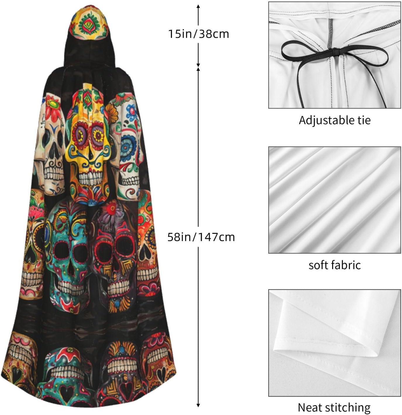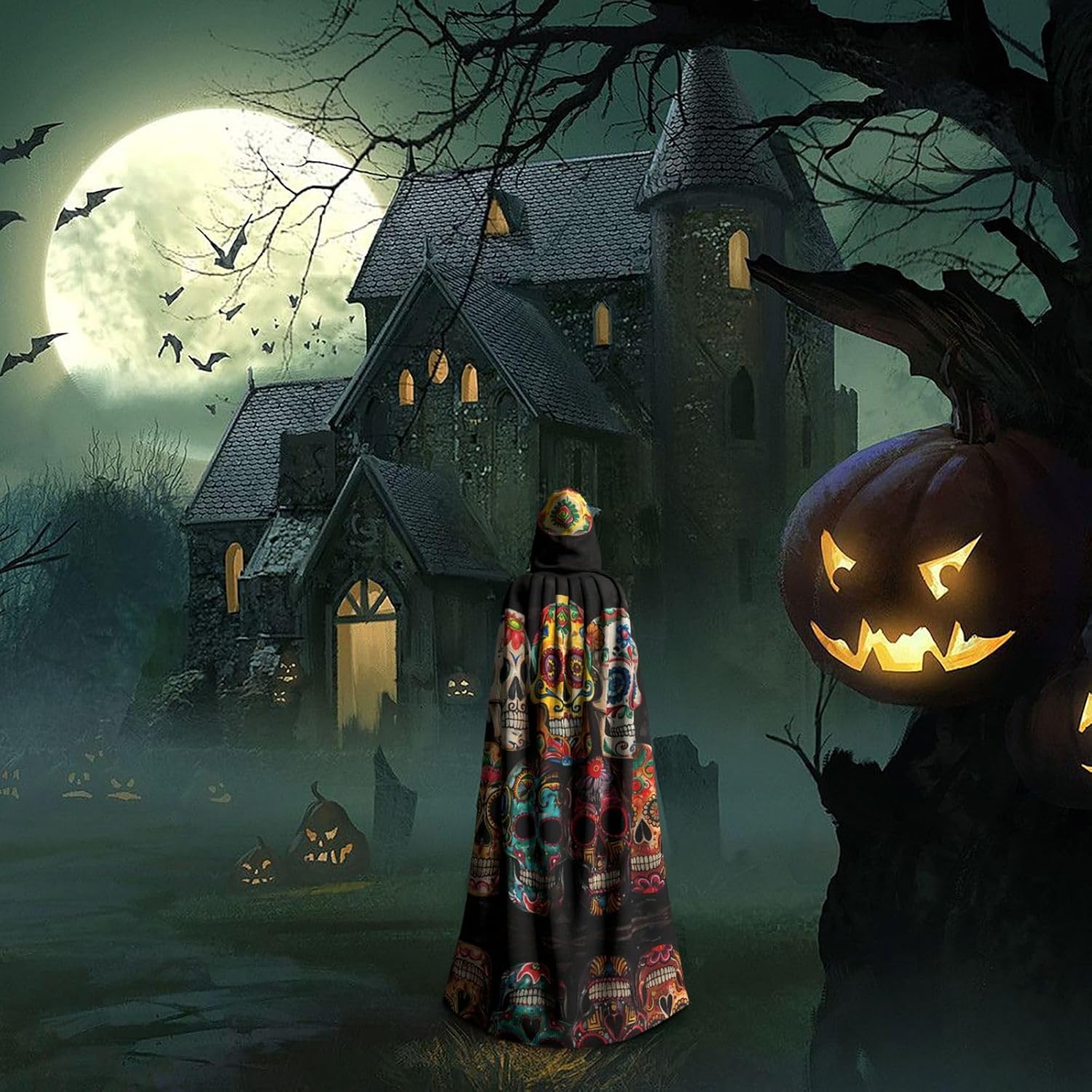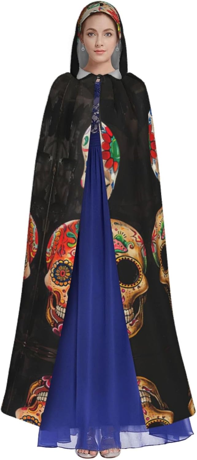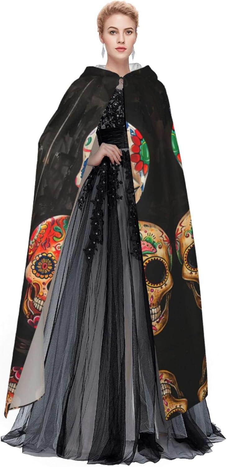 Mantello con cappuccio con teschi di zucchero, mantello medievale per Halloween, mantello da mago, mantello nero, costume da strega per adulti
