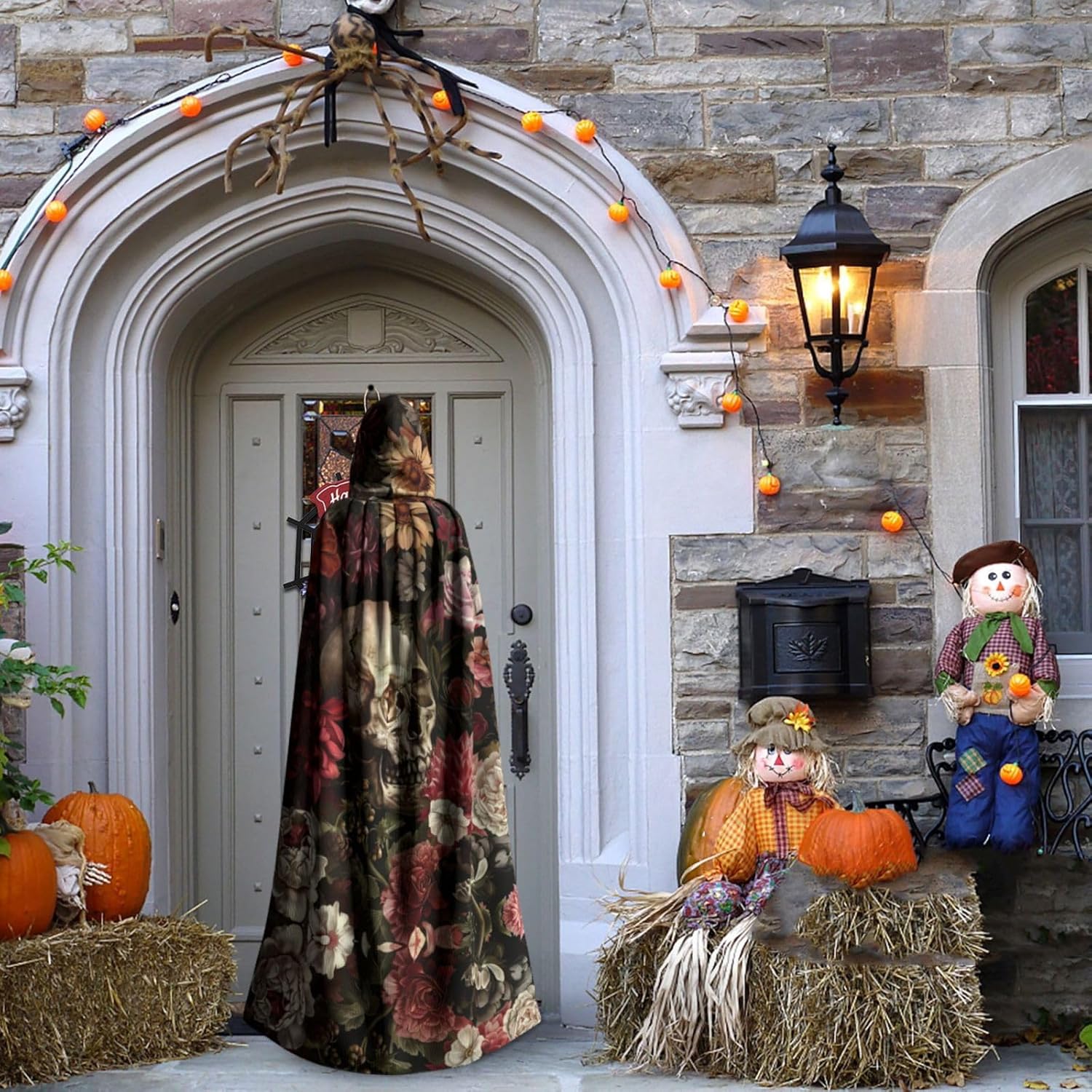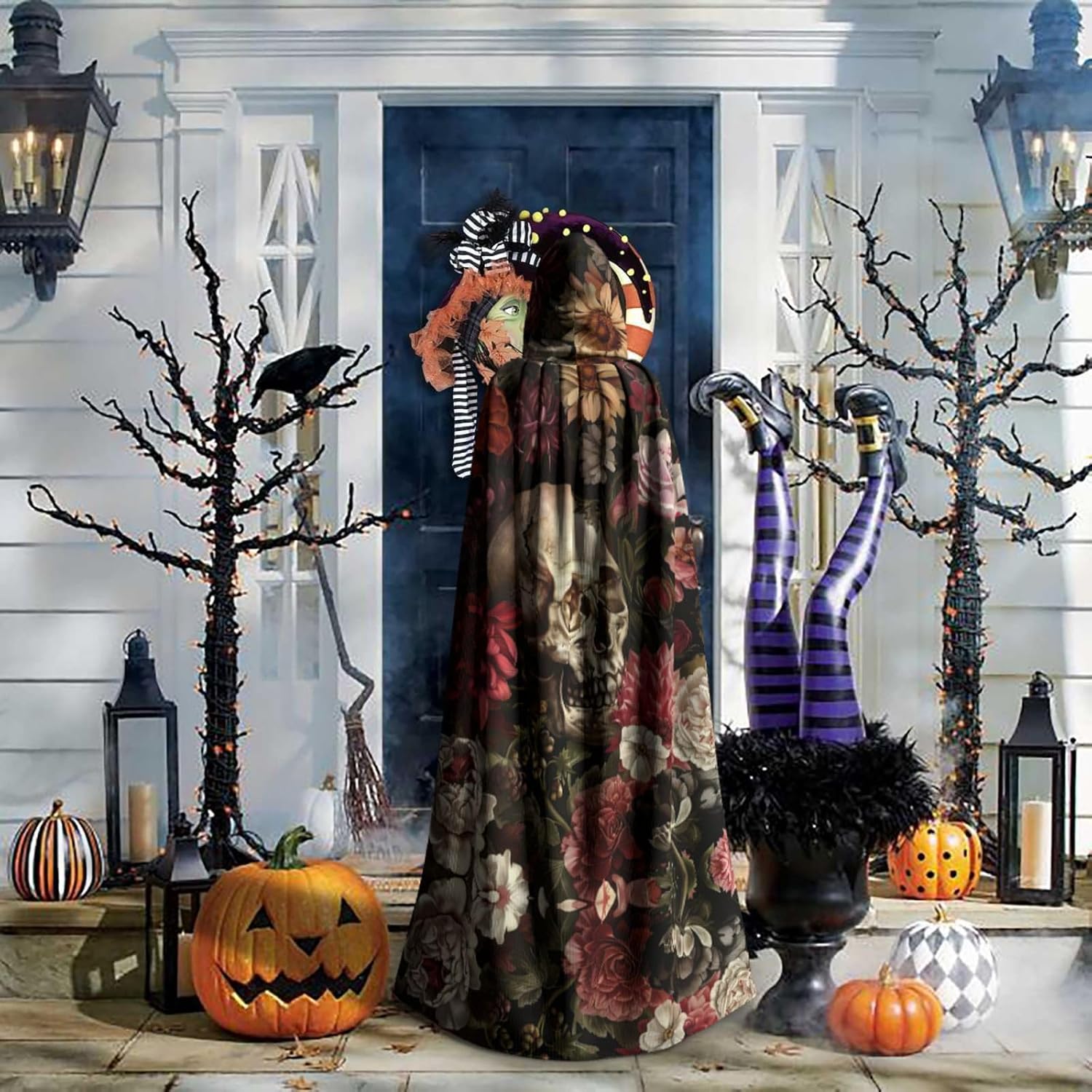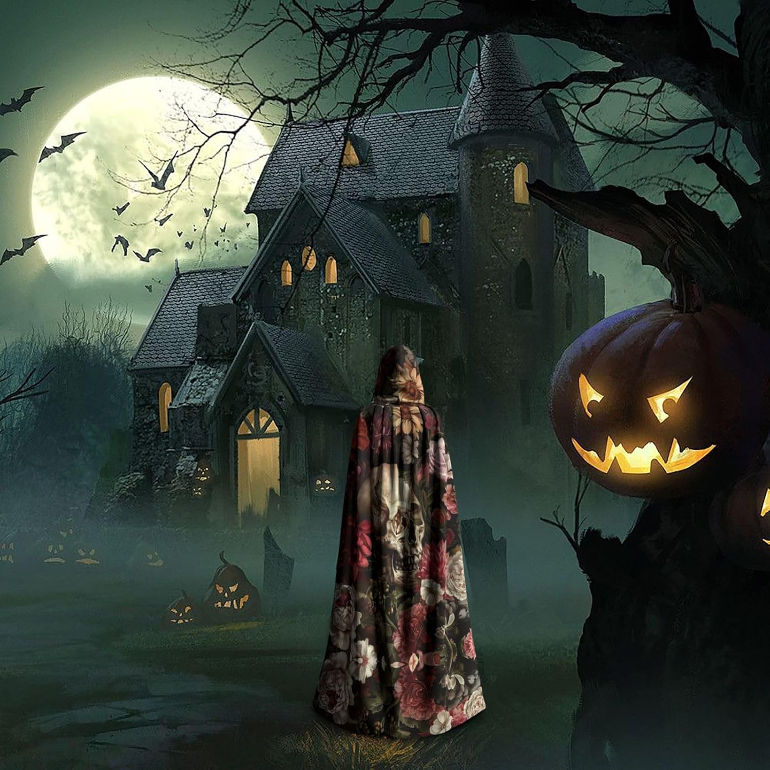 Mantello con cappuccio con teschio floreale mantello medievale mantello da mago mantello nero per adulti costume da strega