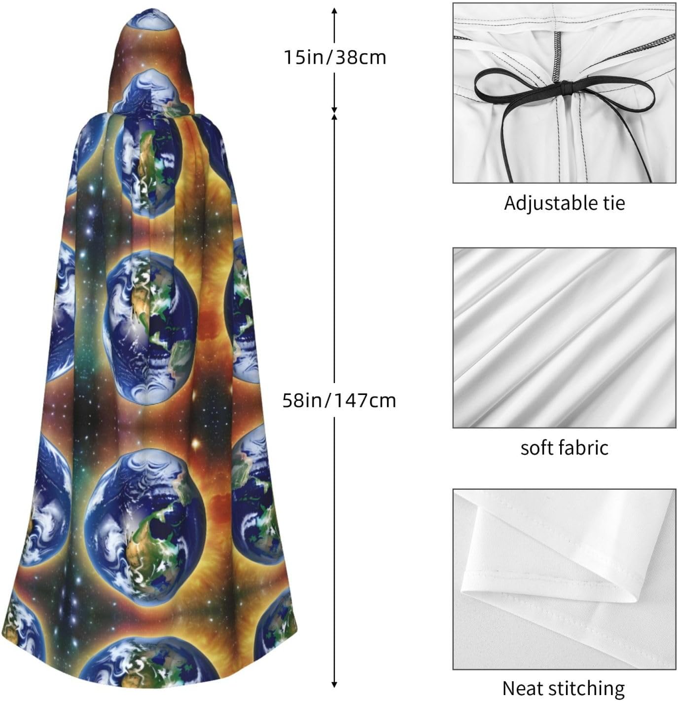 Materiale e design Cosmic Earth: il tessuto è realizzato in 100% fibra di poliestere (poliestere) tessuto di alta qualità, morbido e confortevole. Il design con cappuccio non è solo elegante e bello, ma fornisce anche calore extra alla testa e al collo. Caratteristiche del prodotto: il poncho oversize con cappuccio è un poncho con cappuccio senza lacci, senza cerniera, comodo realizzato in tessuto lungo, resistente e non prurito. Dimensioni del prodotto: il cappello misura 38,1 cm di altezza, 147,3 cm di lunghezza, 154 cm di larghezza. Adatto per occasioni: feste di Natale, feste di Halloween, feste in costume, celebrazioni pagane. Ideale per travestimenti, cosplay, costumi da scena, streghe, vampiri, royalty, scelta regalo perfetta per amici o familiari. Persone applicabili: adulti, unisex