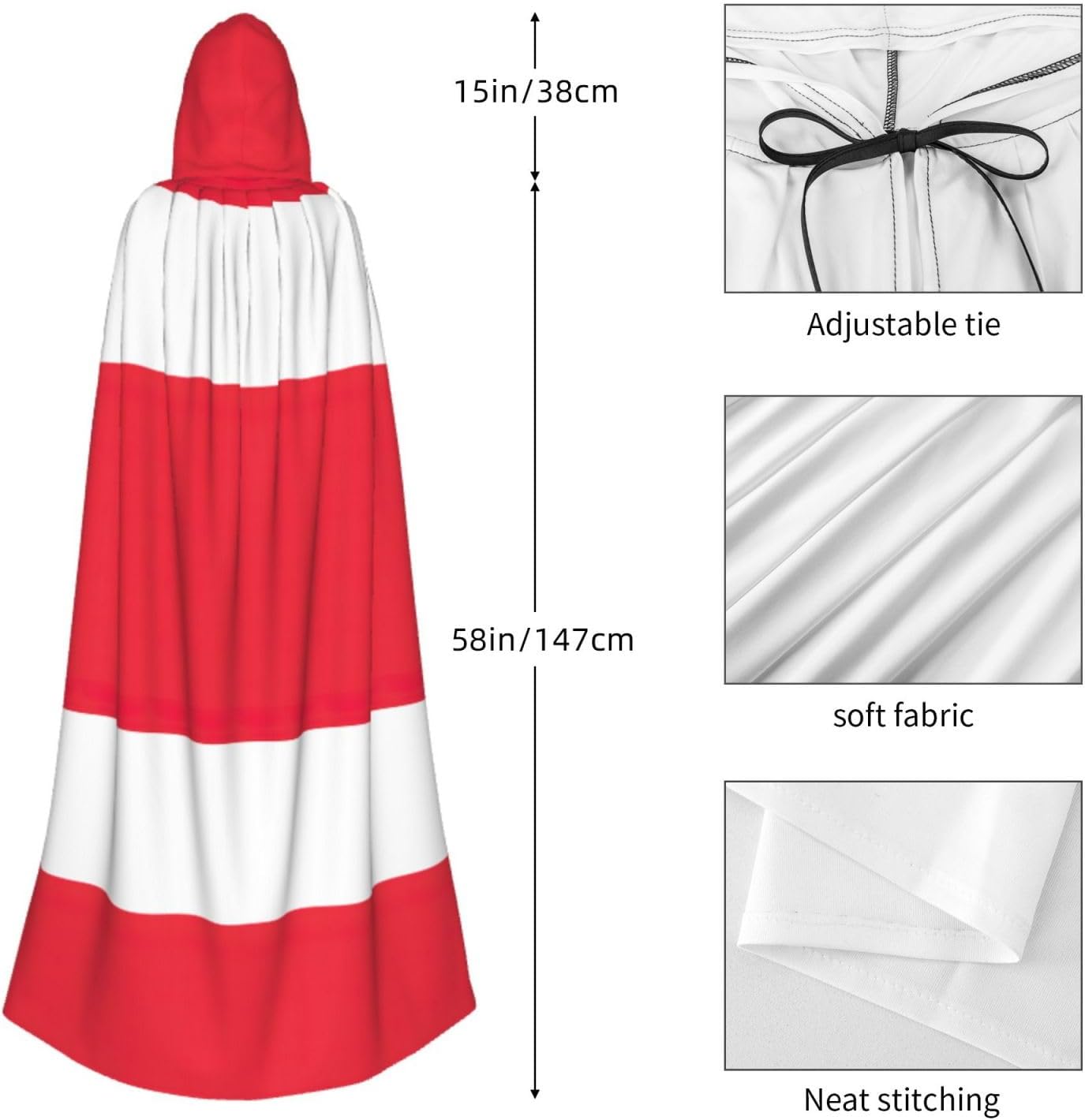 Il mantello con cappuccio per Halloween è realizzato con tessuto in poliestere morbido anche sulla pelle, prevenendo qualsiasi irritazione. Il mantello presenta un ampio cappuccio e uno stile annodato senza cerniere per un design sofisticato ed elegante. Con la sua dimensione universale, offre una copertura completa, adatta a tutti, assicurandoti di distinguerti tra la folla. Questo mantello con stampa bandiera austriaca non è solo per Halloween; è abbastanza versatile per cosplay, spettacoli teatrali, balli in maschera, feste a tema e molto altro ancora.