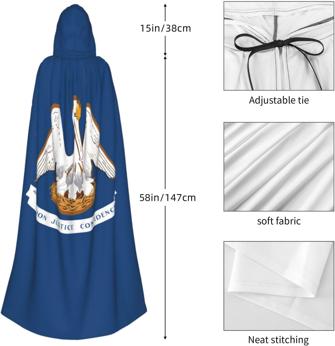 Il mantello con cappuccio per Halloween è realizzato con tessuto in poliestere morbido anche sulla pelle, prevenendo qualsiasi irritazione. Il mantello presenta un ampio cappuccio e uno stile annodato senza cerniere per un design sofisticato ed elegante. Con la sua dimensione universale, offre una copertura completa, adatta a tutti, assicurandoti di distinguerti tra la folla. Questo mantello con stampa della bandiera della Louisiana non è solo per Halloween; è abbastanza versatile per cosplay, spettacoli teatrali, balli in maschera, feste a tema e molto altro ancora.