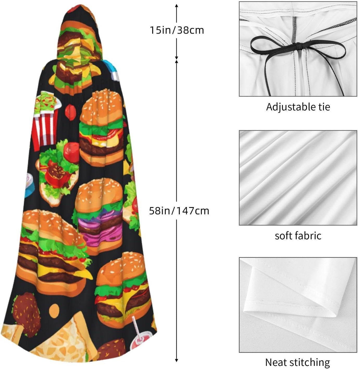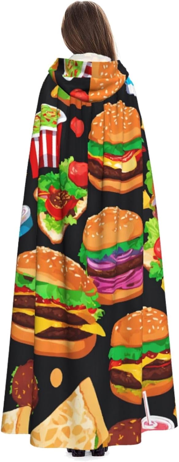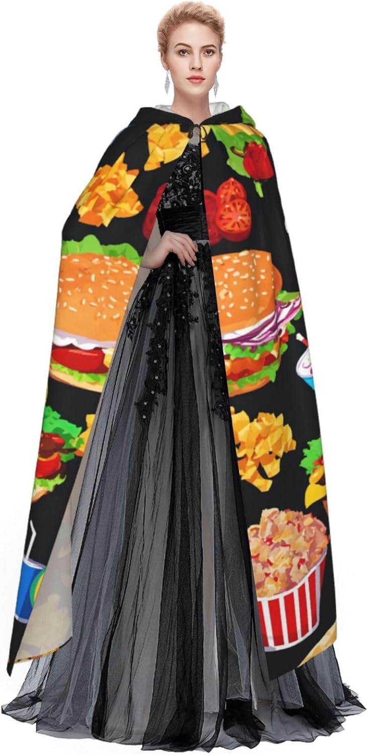 Il mantello con cappuccio per Halloween è realizzato con tessuto in poliestere morbido anche sulla pelle, prevenendo qualsiasi irritazione. Il mantello presenta un ampio cappuccio e uno stile annodato senza cerniere per un design sofisticato ed elegante. Con la sua dimensione universale, offre una copertura completa, adatta a tutti, assicurandoti di distinguerti tra la folla. Questo mantello con stampa divertente con motivo alimentare non è solo per Halloween; è abbastanza versatile per cosplay, spettacoli teatrali, balli in maschera, feste a tema e molto altro ancora.