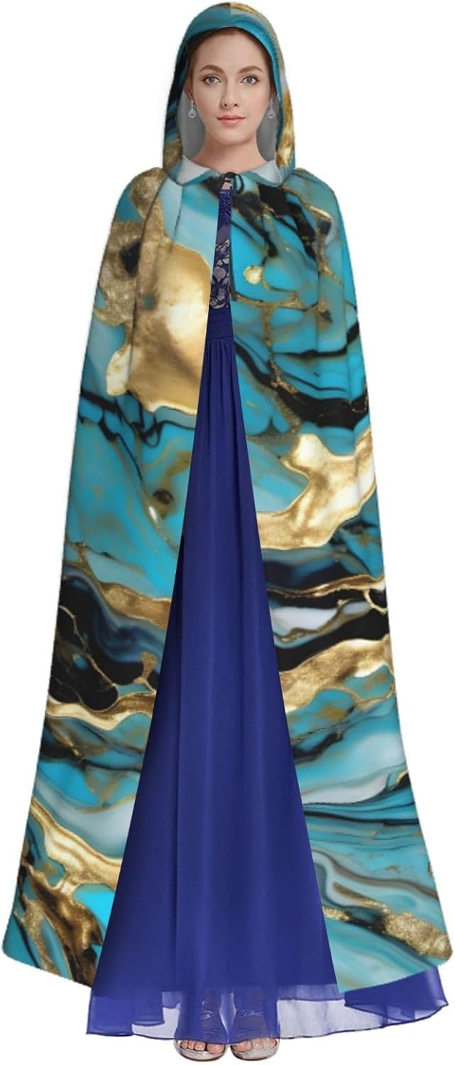 Il mantello con cappuccio per Halloween è realizzato con tessuto in poliestere morbido anche sulla pelle, prevenendo qualsiasi irritazione. Il mantello presenta un ampio cappuccio e uno stile annodato senza cerniere per un design sofisticato ed elegante. Con la sua dimensione universale, offre una copertura completa, adatta a tutti, assicurandoti di distinguerti tra la folla. Questo mantello blu turchese con stampa marmo oro non è solo per Halloween; è abbastanza versatile per cosplay, spettacoli teatrali, balli in maschera, feste a tema e molto altro ancora.