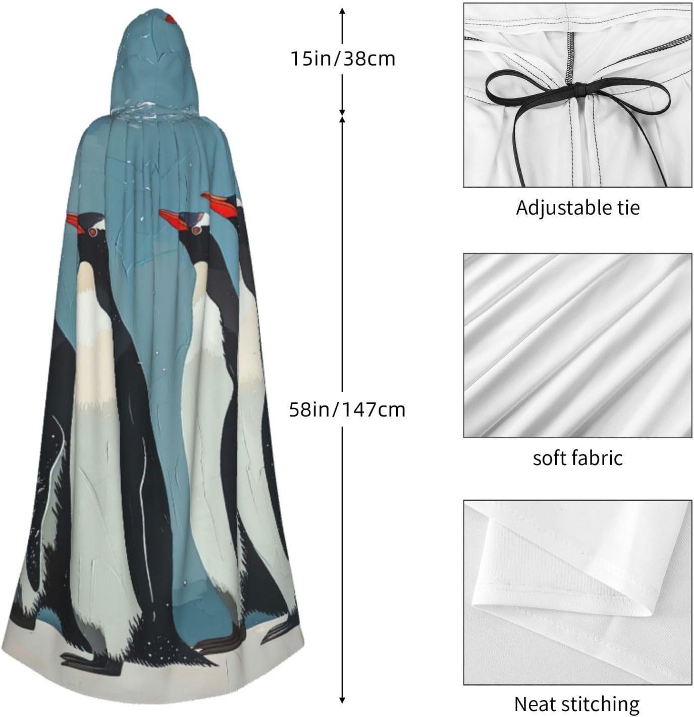 Il mantello con cappuccio per Halloween è realizzato con tessuto in poliestere morbido anche sulla pelle, prevenendo qualsiasi irritazione. Il mantello presenta un ampio cappuccio e uno stile annodato senza cerniere per un design sofisticato ed elegante. Con la sua dimensione universale, offre una copertura completa, adatta a tutti, assicurandoti di distinguerti tra la folla. Questo mantello con stampa pinguino non è solo per Halloween; è abbastanza versatile per cosplay, spettacoli teatrali, balli in maschera, feste a tema e molto altro ancora.