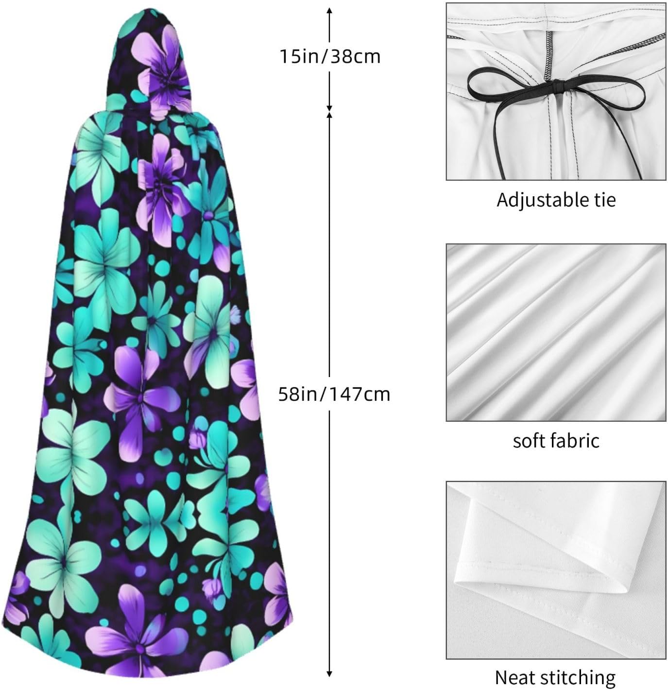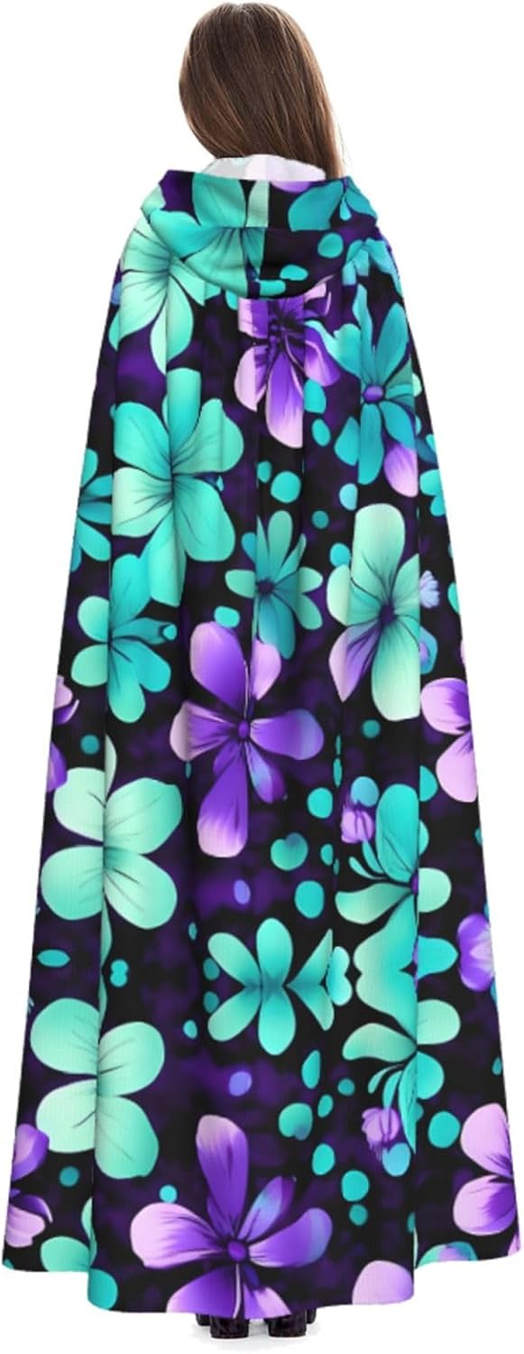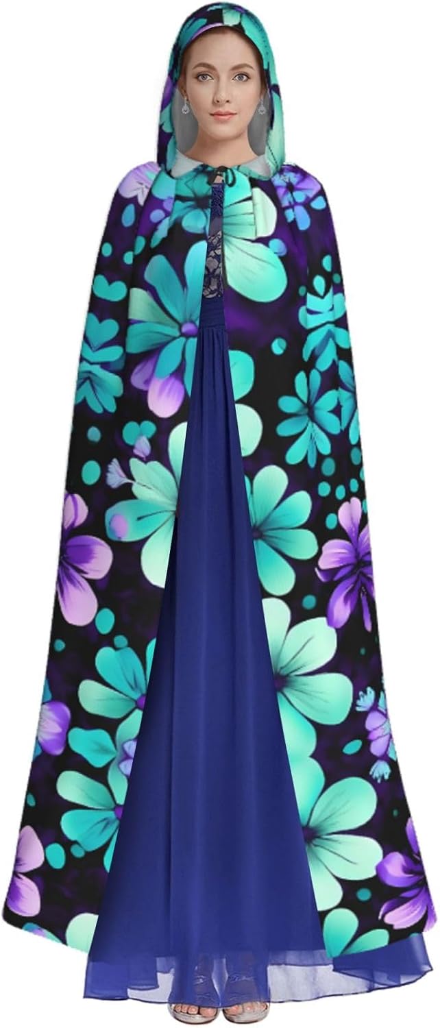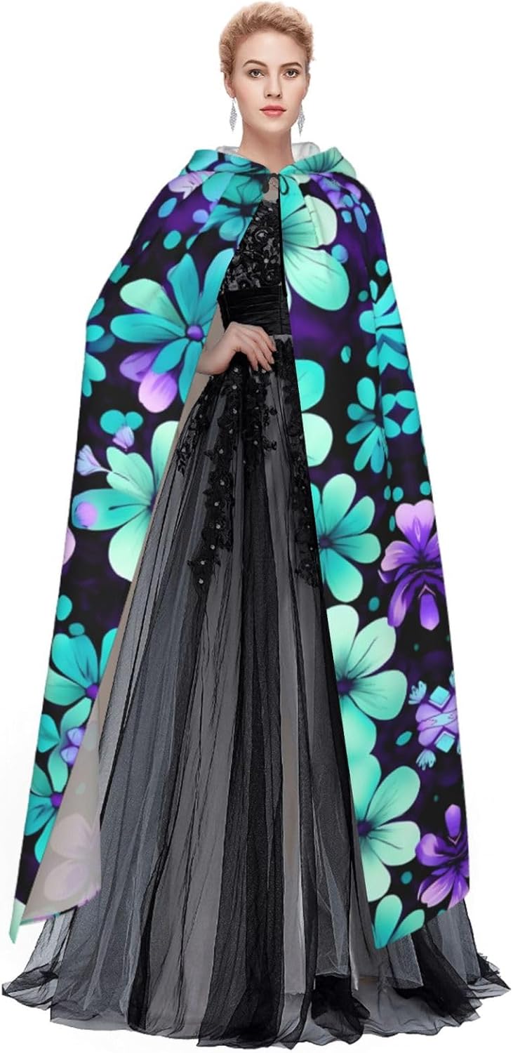 Il mantello con cappuccio per Halloween è realizzato con tessuto in poliestere morbido anche sulla pelle, prevenendo qualsiasi irritazione. Il mantello presenta un ampio cappuccio e uno stile annodato senza cerniere per un design sofisticato ed elegante. Con la sua dimensione universale, offre una copertura completa, adatta a tutti, assicurandoti di distinguerti tra la folla. Questo mantello con stampa di fiori viola e verde acqua non è solo per Halloween; è abbastanza versatile per cosplay, spettacoli teatrali, balli in maschera, feste a tema e molto altro ancora.