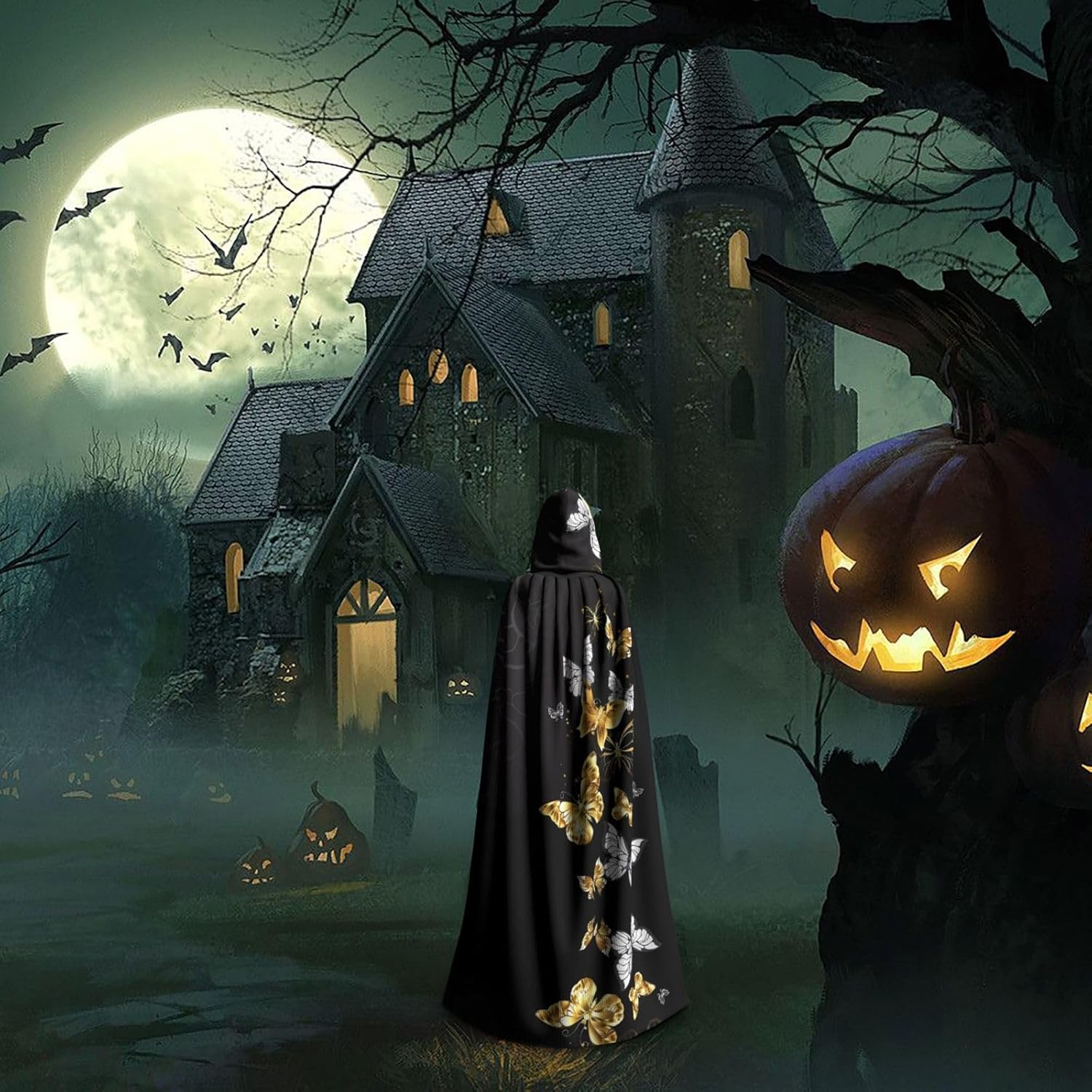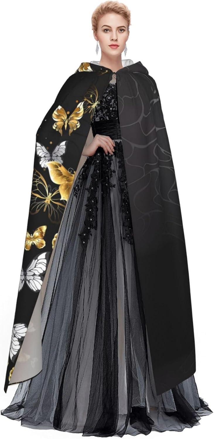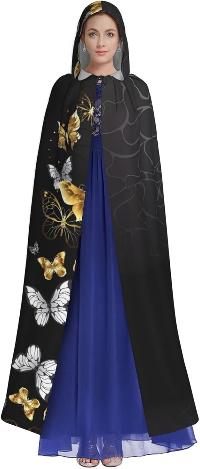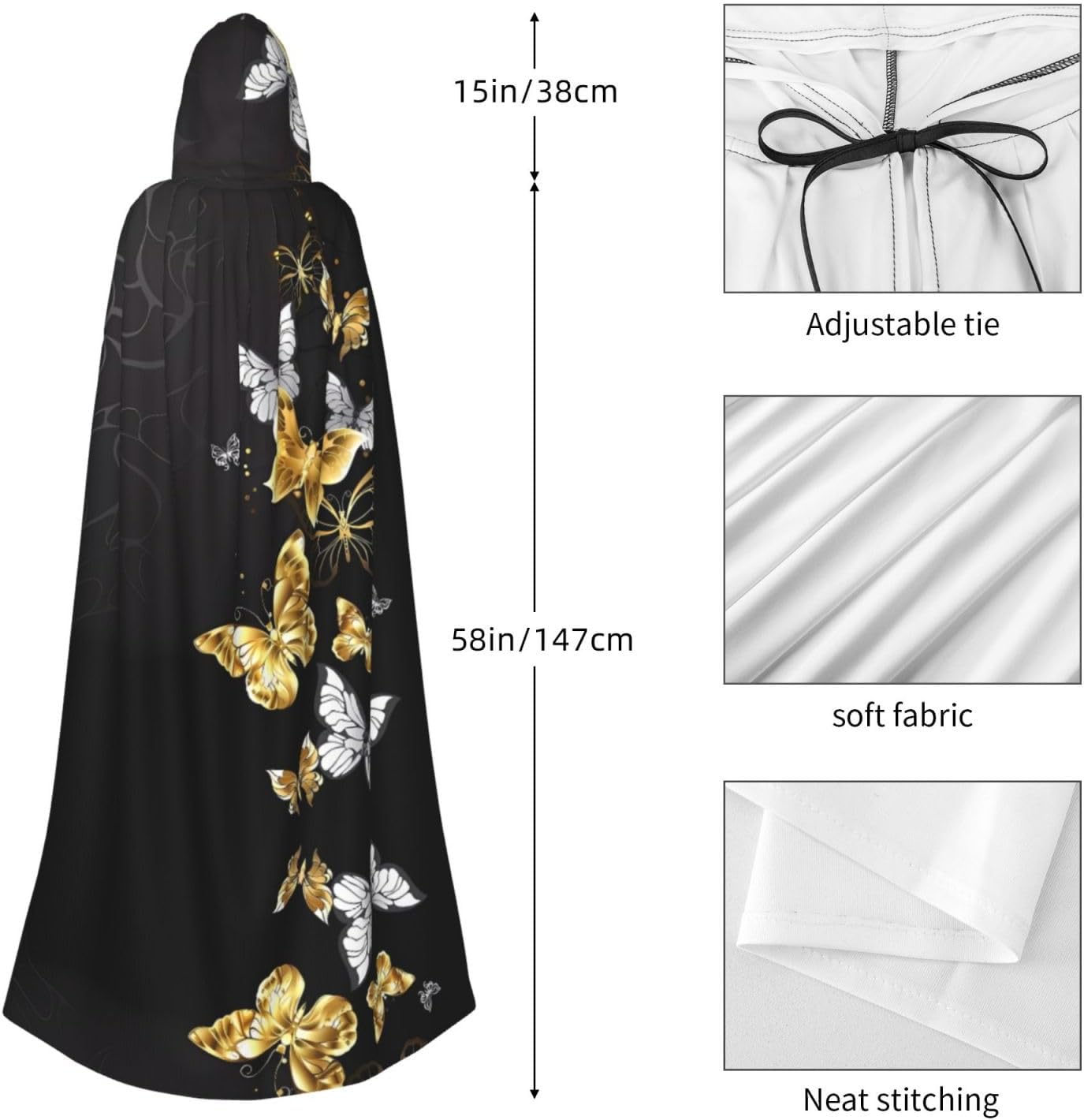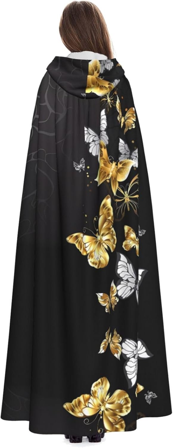 Mantello con cappuccio nero con farfalle bianche dorate, abiti da uomo e da donna per adulti, costumi cosplay di Natale e Halloween, feste in costume