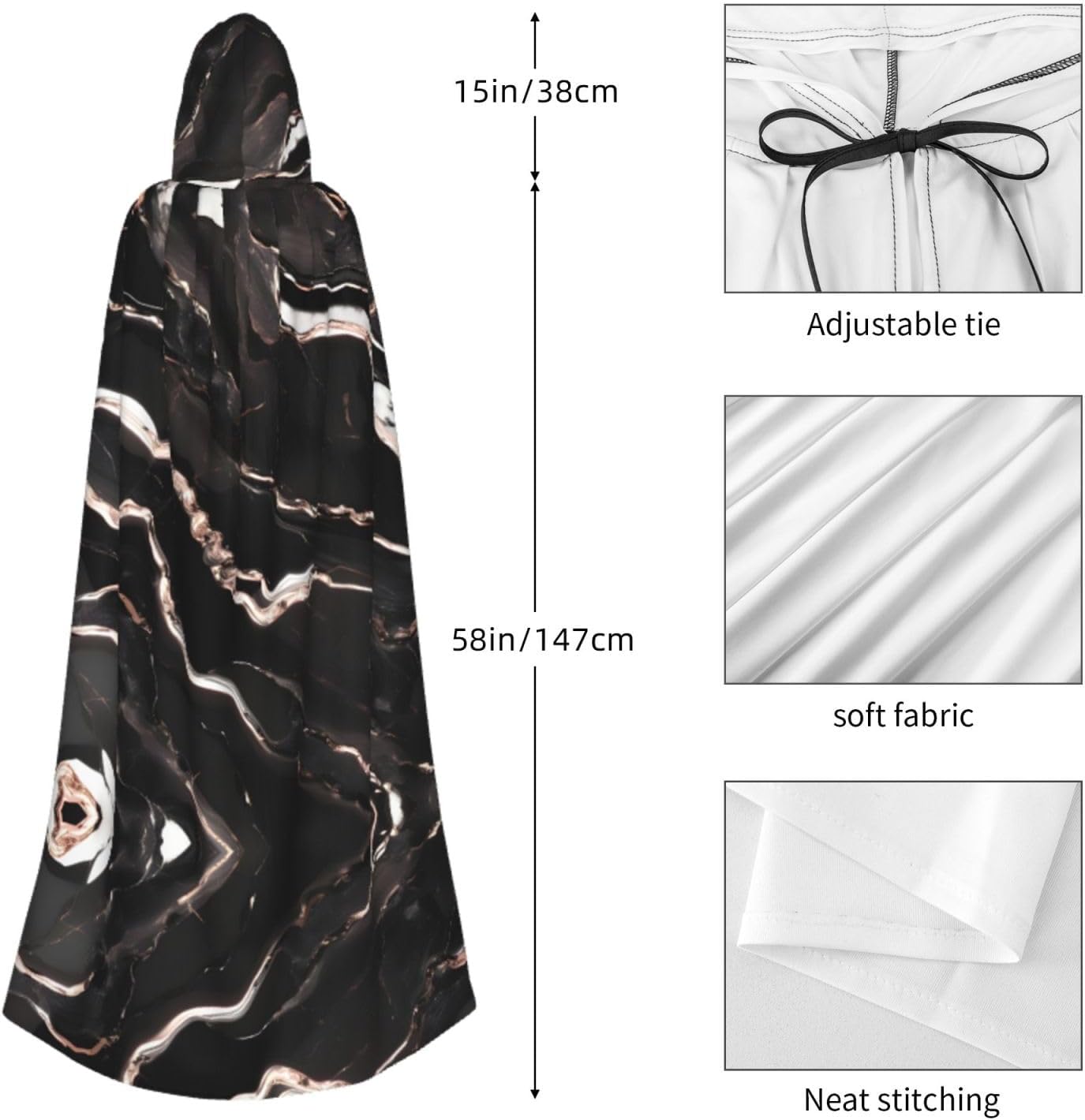 Il mantello con cappuccio per Halloween è realizzato con tessuto in poliestere morbido anche sulla pelle, prevenendo qualsiasi irritazione. Il mantello presenta un ampio cappuccio e uno stile annodato senza cerniere per un design sofisticato ed elegante. Con la sua dimensione universale, offre una copertura completa, adatta a tutti, assicurandoti di distinguerti tra la folla. Questo mantello nero con stampa in marmo oro rosa non è solo per Halloween; è abbastanza versatile per cosplay, spettacoli teatrali, balli in maschera, feste a tema e molto altro ancora.