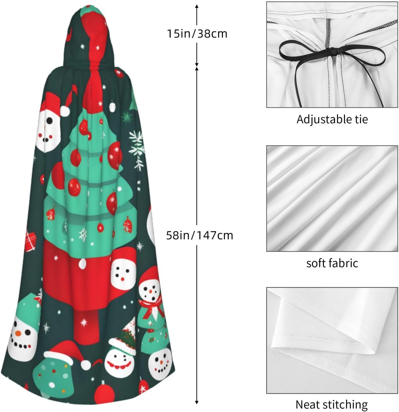Ruba lo spettacolo a qualsiasi evento di Halloween o a tema con il nostro mantello con cappuccio. Realizzato con un tessuto confortevole, non pruriginoso, questo mantello con stampa albero di Natale e pupazzo di neve è progettato per assicurarti di distinguerti tra la folla. Il mantello è facile da indossare e togliere, grazie alla cravatta e all'assenza di una cerniera. Con un design facile da pulire, può essere lavato in lavatrice o a mano per garantire che sia sempre pronto per il tuo prossimo evento. Prova la perfetta miscela di comfort, stile e versatilità con il nostro mantello con cappuccio.