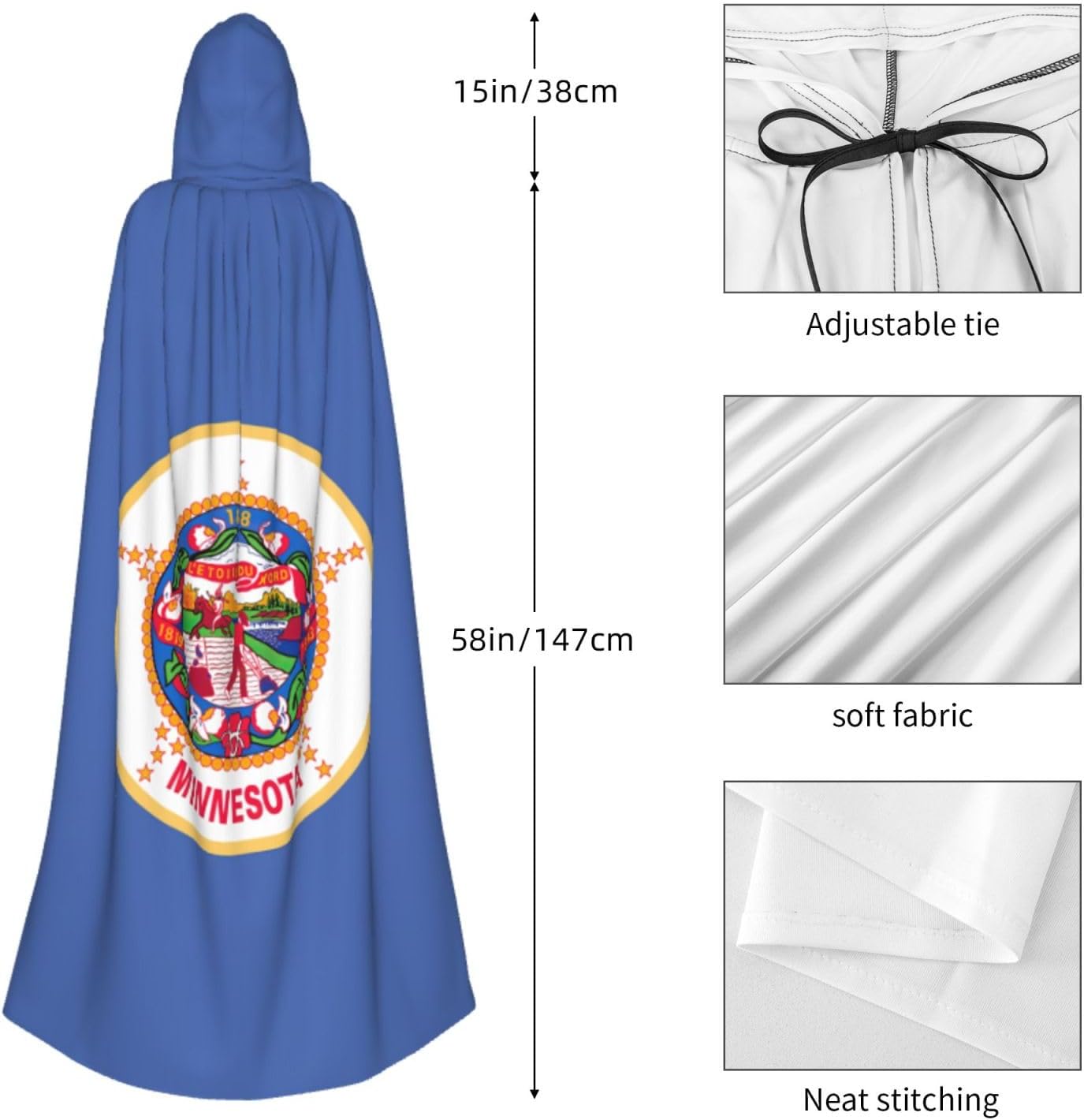 Ruba lo spettacolo a qualsiasi evento di Halloween o a tema con il nostro mantello con cappuccio. Realizzato con un tessuto confortevole, non pruriginoso, questo mantello con stampa bandiera del Minnesota è progettato per assicurarti di distinguerti tra la folla. Il mantello è facile da indossare e togliere, grazie alla cravatta e all'assenza di una cerniera. Con un design facile da pulire, può essere lavato in lavatrice o a mano per garantire che sia sempre pronto per il tuo prossimo evento. Prova la perfetta miscela di comfort, stile e versatilità con il nostro mantello con cappuccio.