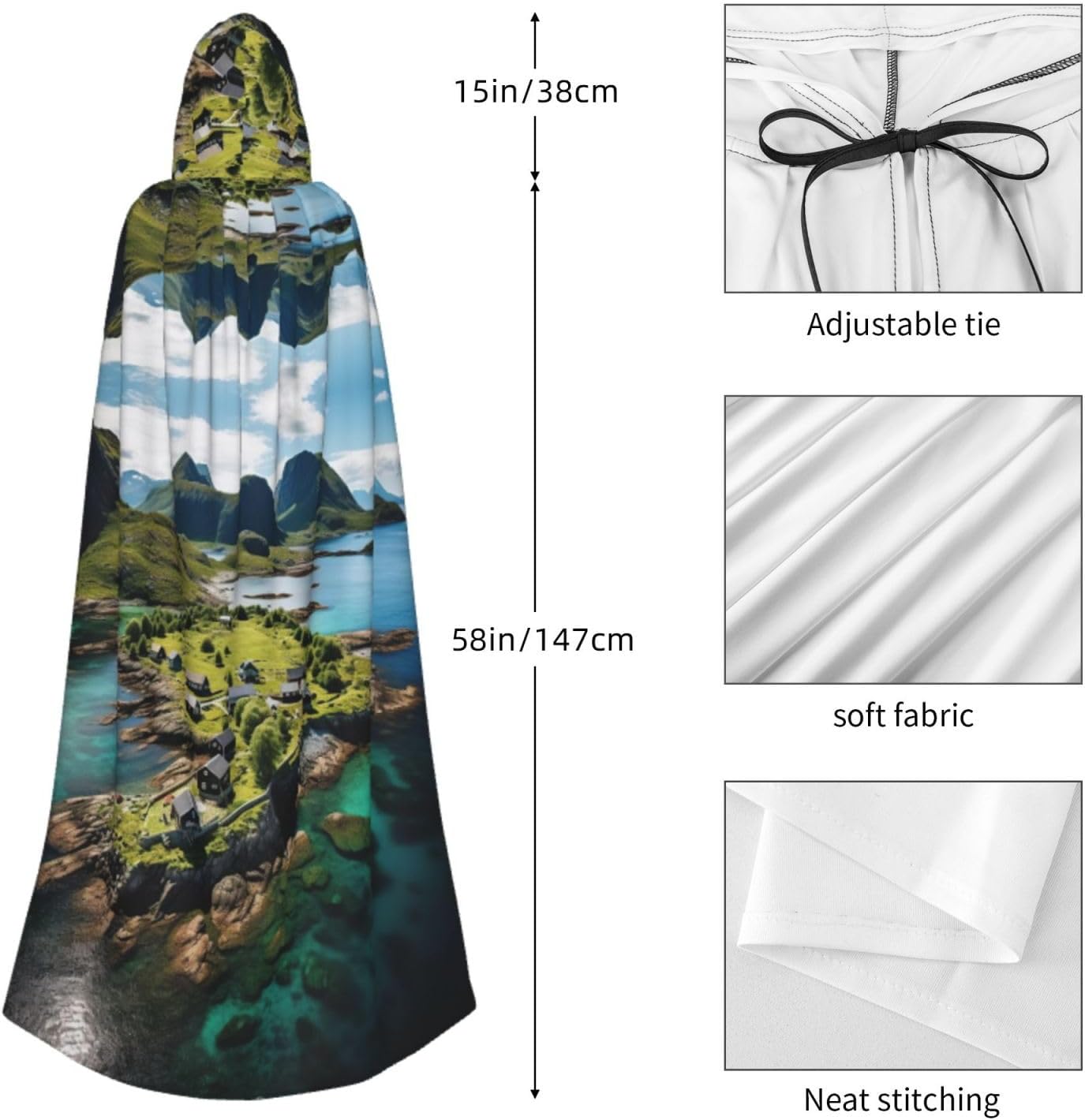 Il design senza cerniera, abbinato a un grande mantello con cappuccio e cravatta al collo, migliora il tuo mistero mantenendoti comodo con il suo tessuto non prurito. Con una lunghezza di 147 cm, larghezza di 154 cm e un'altezza del cappuccio di 38 cm, il nostro mantello con cappuccio con stampa delle isole norvegesi offre una copertura completa, assicurandoti di distinguerti in ogni occasione. Vari eventi come Halloween, cosplay, costumi da palcoscenico, feste a tema, balli, convegni di fumetti e molto altro ancora, il nostro mantello è versatile e conveniente. Facile da mantenere e di lunga durata, il nostro mantello con cappuccio con stampa Isole Norvegia è lavabile in lavatrice e lavabile a mano. Con un design neutro, il nostro mantello è perfetto per uomini e donne.