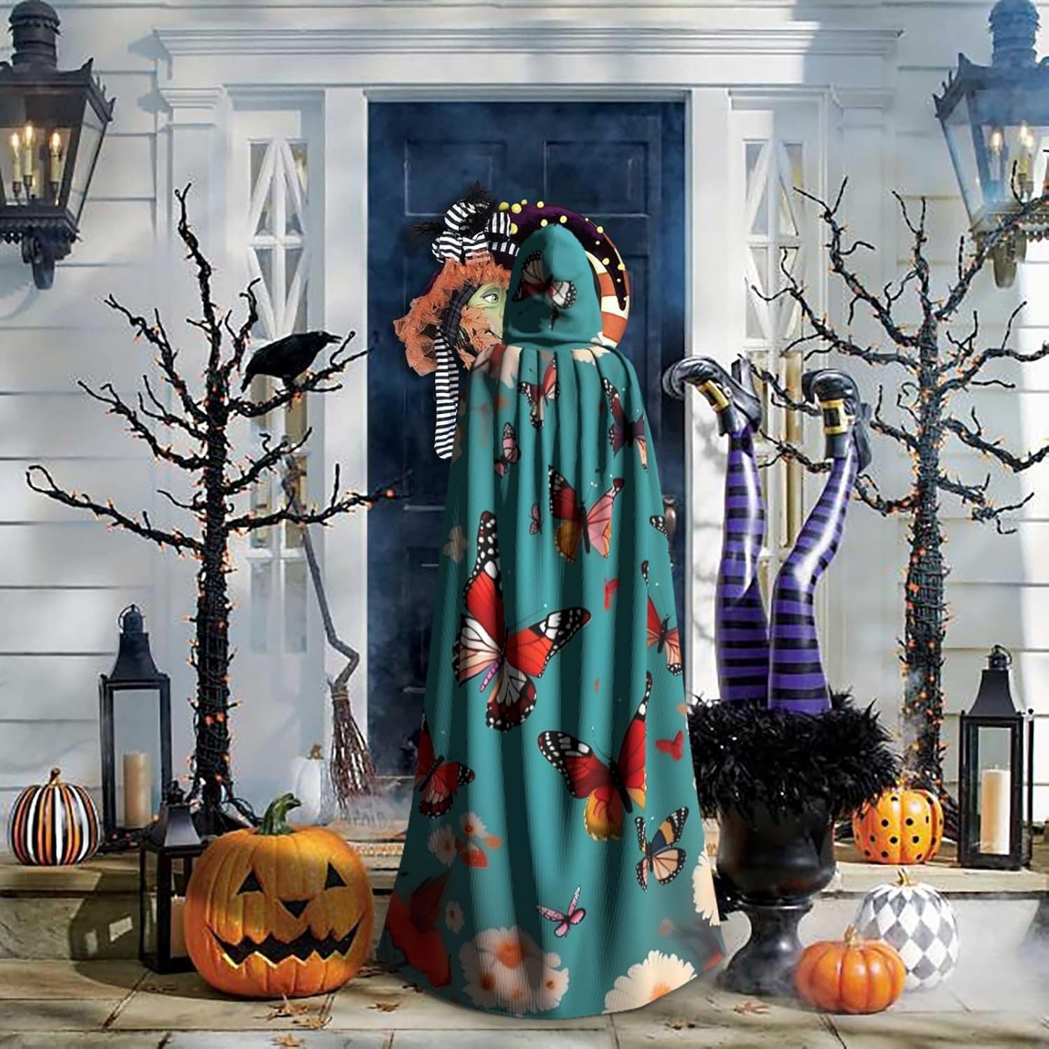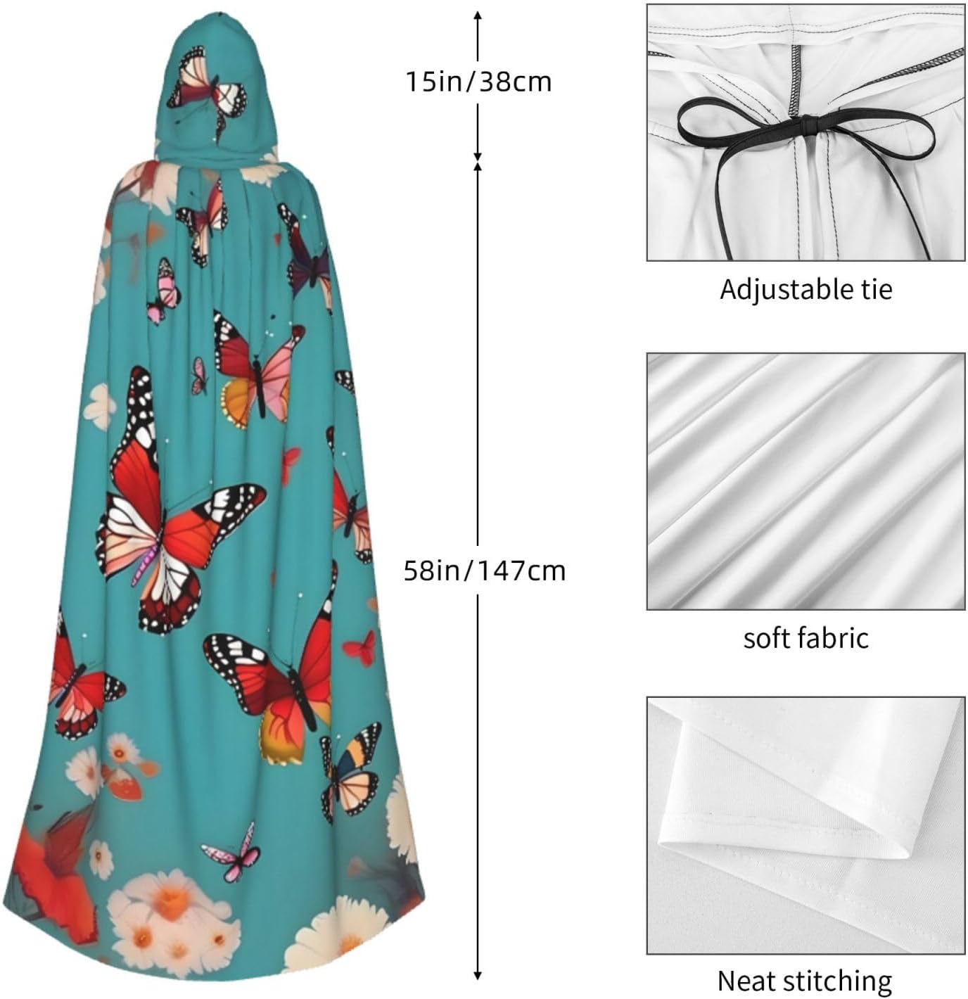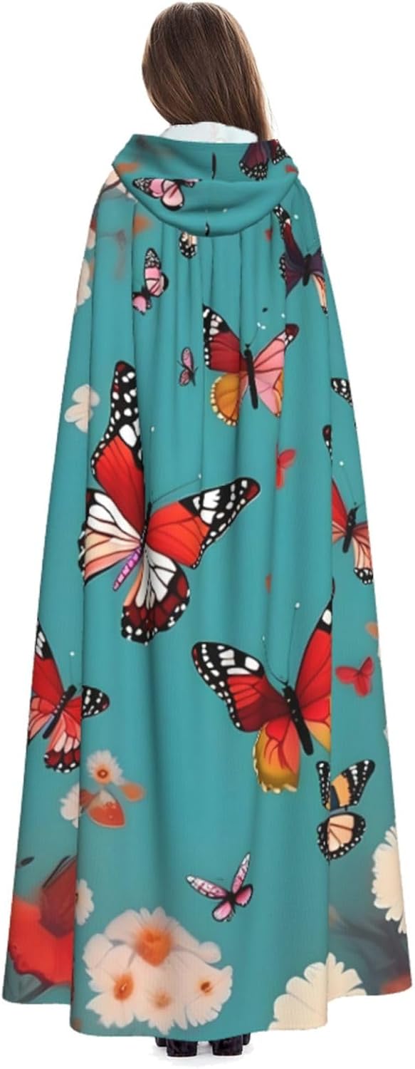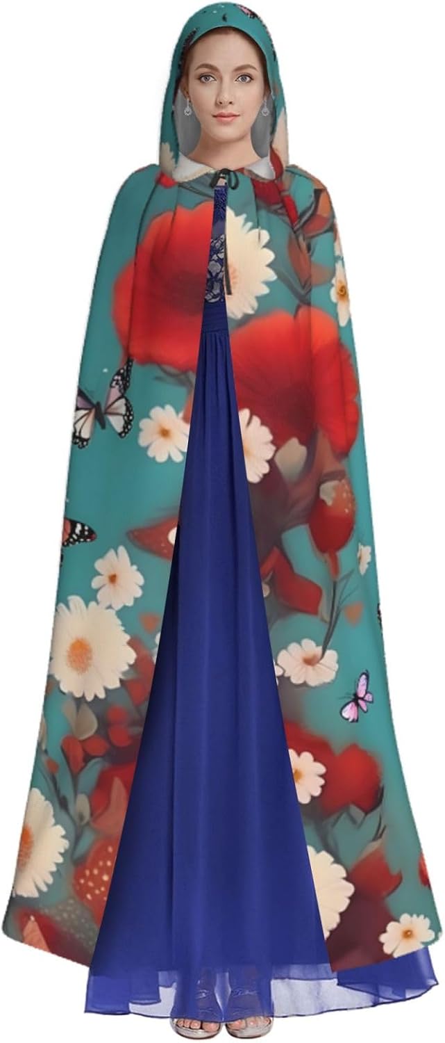 Ruba lo spettacolo a qualsiasi evento di Halloween o a tema con il nostro mantello con cappuccio. Realizzato con un tessuto confortevole, non pruriginoso, questo mantello con stampa di farfalle volanti tra fiori è progettato per assicurarti di distinguerti tra la folla. Il mantello è facile da indossare e togliere, grazie alla cravatta e all'assenza di una cerniera. Con un design facile da pulire, può essere lavato in lavatrice o a mano per garantire che sia sempre pronto per il tuo prossimo evento. Prova la perfetta miscela di comfort, stile e versatilità con il nostro mantello con cappuccio.