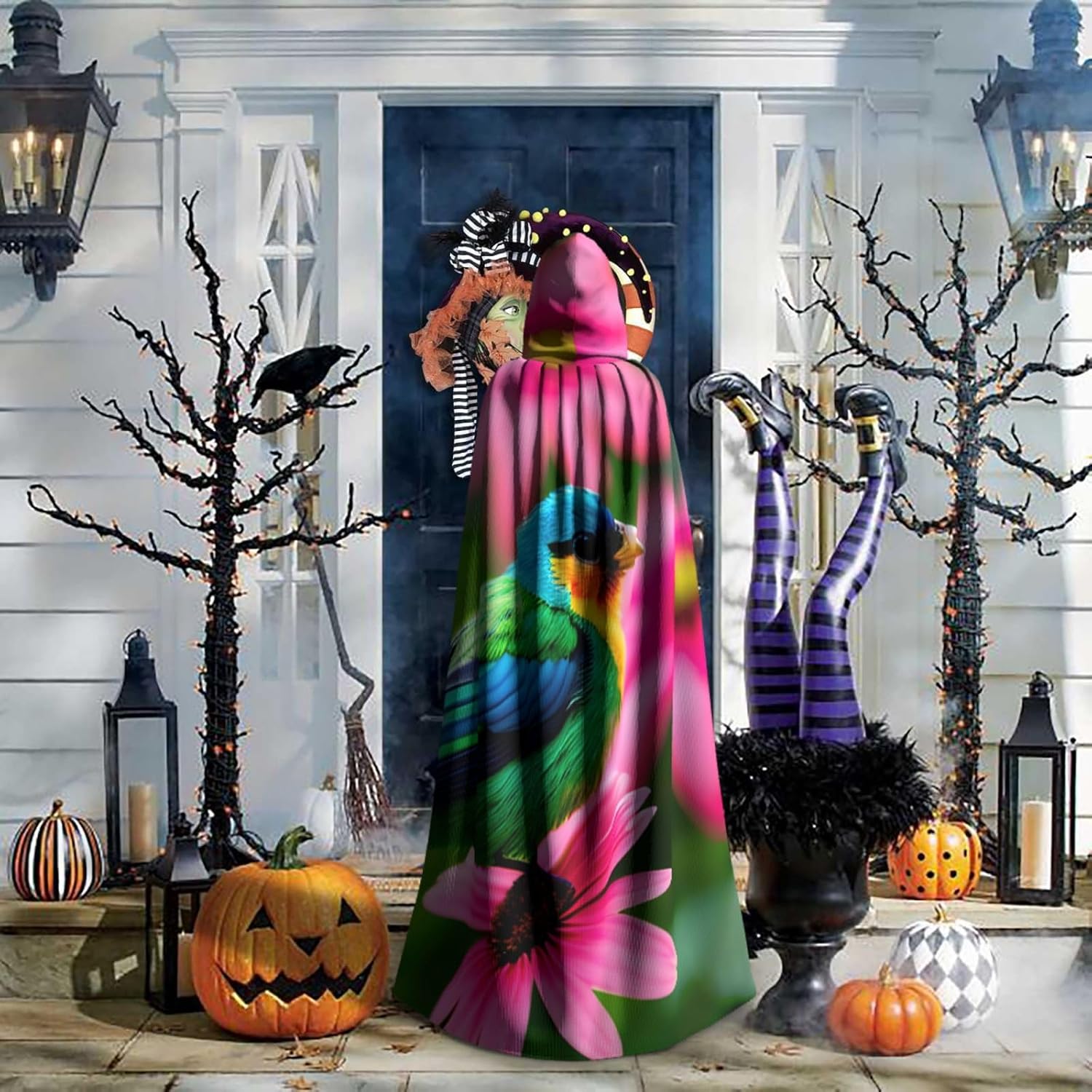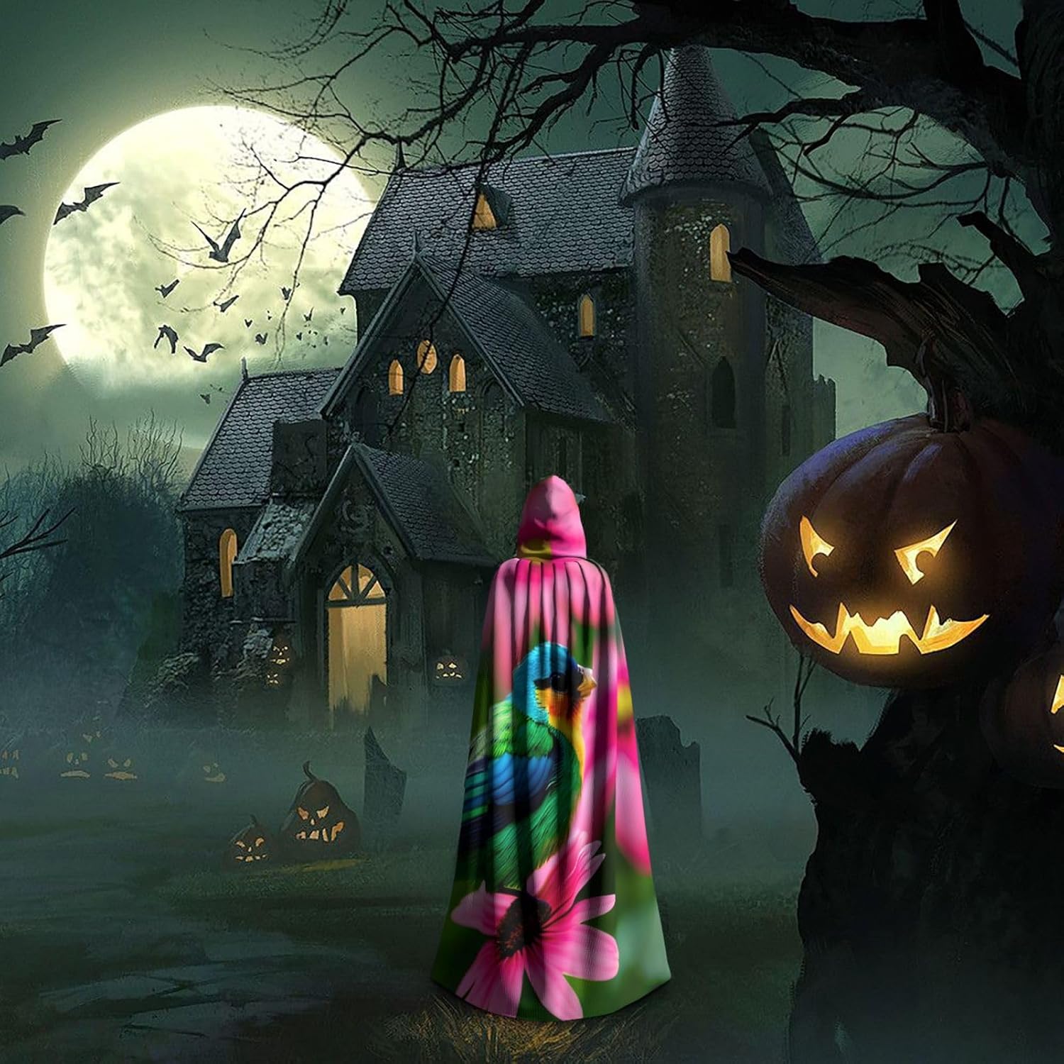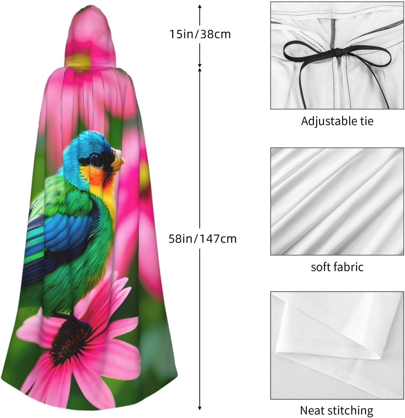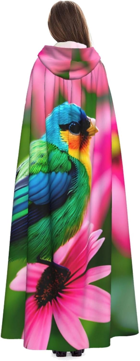 Ruba lo spettacolo a qualsiasi evento di Halloween o a tema con il nostro mantello con cappuccio. Realizzato con un tessuto confortevole, non pruriginoso, questo mantello colorato con stampa di fiori e uccelli è progettato per assicurarti di distinguerti tra la folla. Il mantello è facile da indossare e togliere, grazie alla cravatta e all'assenza di una cerniera. Con un design facile da pulire, può essere lavato in lavatrice o a mano per garantire che sia sempre pronto per il tuo prossimo evento. Prova la perfetta miscela di comfort, stile e versatilità con il nostro mantello con cappuccio.
