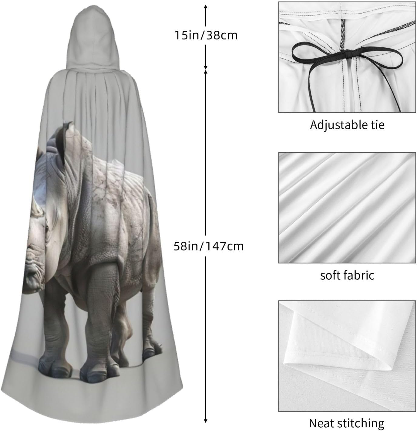 Realizzato in poliestere, questo mantello con stampa di rinoceronte animale con cappuccio garantisce longevità e comfort. Le sue dimensioni ottimali assicurano una copertura completa per tutte le età, facendoti risaltare in qualsiasi evento. Che tu sia diretto per Halloween, un evento cosplay, un costume da palcoscenico, una festa in maschera, una festa a tema, un ballo o una convention di fumetti, questo mantello è una scelta ideale. Il suo design unico, completo di un grande cappuccio e cravatte collare. Inoltre, puoi dire addio ai metodi di pulizia complicati. Questo mantello con cappuccio con stampa animale rinoceronte è lavabile in lavatrice e a mano, offrendo una cura senza sforzo. Esci con stile e comfort con il nostro mantello con cappuccio, il tuo compagno per tutti gli eventi e le occasioni.