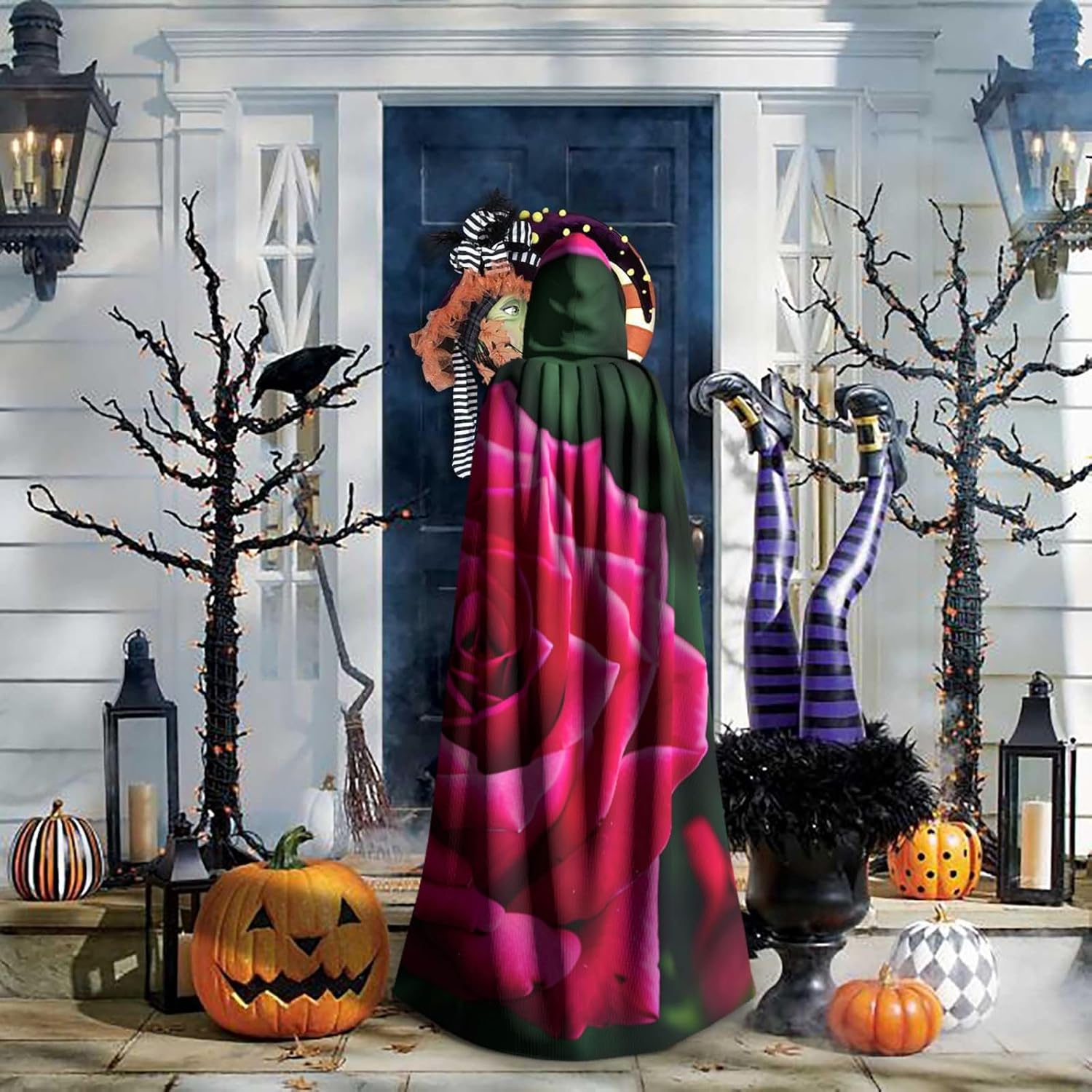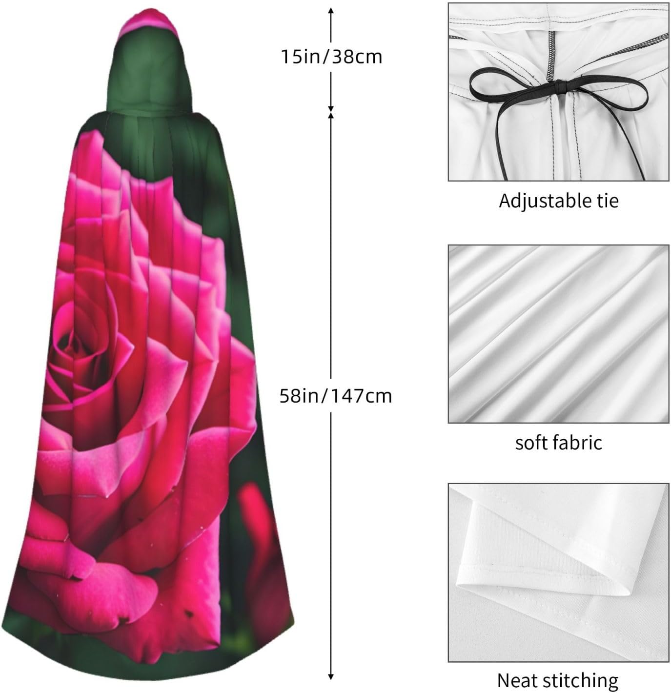 Ruba lo spettacolo a qualsiasi evento di Halloween o a tema con il nostro mantello con cappuccio. Realizzato con un tessuto confortevole, non pruriginoso, questo mantello con stampa a fiori di rosa è progettato per assicurarti di distinguerti tra la folla. Il mantello è facile da indossare e togliere, grazie alla cravatta e all'assenza di una cerniera. Con un design facile da pulire, può essere lavato in lavatrice o a mano per garantire che sia sempre pronto per il tuo prossimo evento. Prova la perfetta miscela di comfort, stile e versatilità con il nostro mantello con cappuccio.