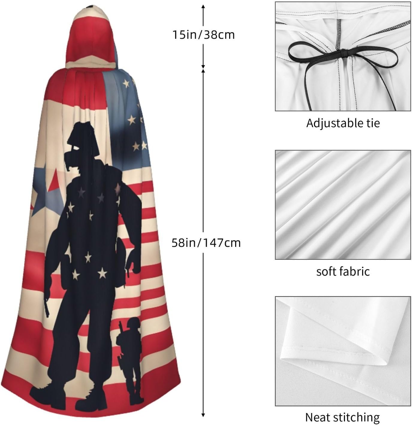 Ruba lo spettacolo a qualsiasi evento di Halloween o a tema con il nostro mantello con cappuccio. Realizzato con un tessuto confortevole, non pruriginoso, questo mantello patriottico con stampa del giorno della memoria dei soldati militari statunitensi è progettato per assicurarti di distinguerti tra la folla. Il mantello è facile da indossare e togliere, grazie alla cravatta e all'assenza di una cerniera. Con un design facile da pulire, può essere lavato in lavatrice o a mano per garantire che sia sempre pronto per il tuo prossimo evento. Prova la perfetta miscela di comfort, stile e versatilità con il nostro mantello con cappuccio.