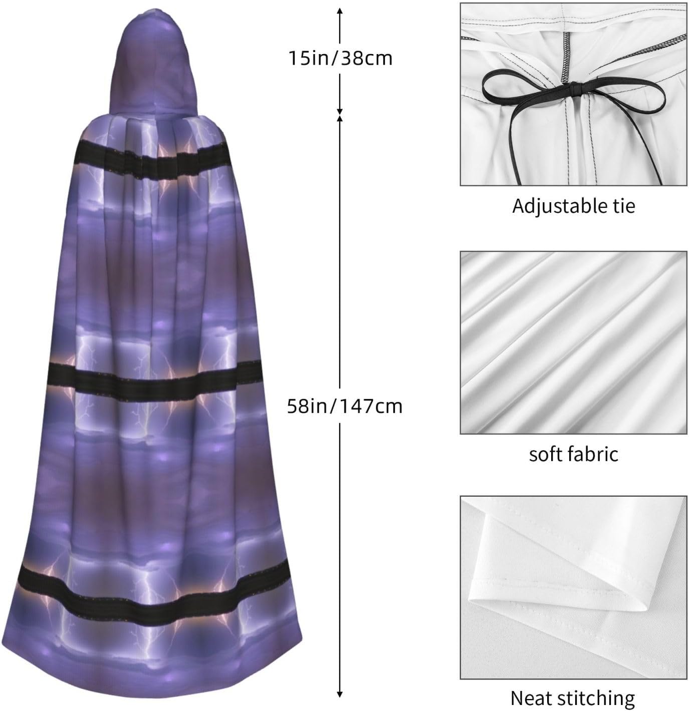 Materiale e design fulmini: il tessuto è realizzato in 100% fibra di poliestere (poliestere) tessuto di alta qualità, morbido e confortevole. Il design con cappuccio non è solo elegante e bello, ma fornisce anche calore extra alla testa e al collo. \r Caratteristiche del prodotto: il poncho oversize con cappuccio è un poncho con cappuccio senza lacci, senza cerniera, comodo realizzato in tessuto lungo, resistente e non prurito. \r Dimensioni del prodotto: il cappello misura 38,1 cm di altezza, 147,3 cm di lunghezza, 154 cm di larghezza. \r Adatto per occasioni: feste di Natale, feste di Halloween, feste in costume, celebrazioni pagane. Ideale per travestimenti, cosplay, costumi da scena, streghe, vampiri, royalty, scelta regalo perfetta per amici o familiari. \r Persone applicabili: adulti, unisex.