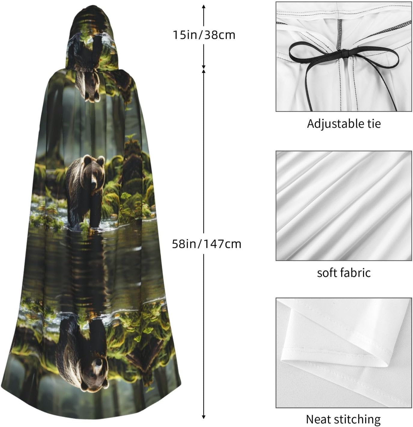 Materiale e design dell'orso marrone: il tessuto è realizzato in 100% fibra di poliestere (poliestere) tessuto di alta qualità, morbido e confortevole. Il design con cappuccio non è solo elegante e bello, ma fornisce anche calore extra alla testa e al collo. Caratteristiche del prodotto: il poncho oversize con cappuccio è un poncho con cappuccio senza lacci, senza cerniera, comodo realizzato in tessuto lungo, resistente e non prurito. Dimensioni del prodotto: il cappello misura 38,1 cm di altezza, 147,3 cm di lunghezza, 154 cm di larghezza. Adatto per occasioni: feste di Natale, feste di Halloween, feste in costume, celebrazioni pagane. Ideale per travestimenti, cosplay, costumi da scena, streghe, vampiri, royalty, scelta regalo perfetta per amici o familiari. Persone applicabili: adulti, unisex