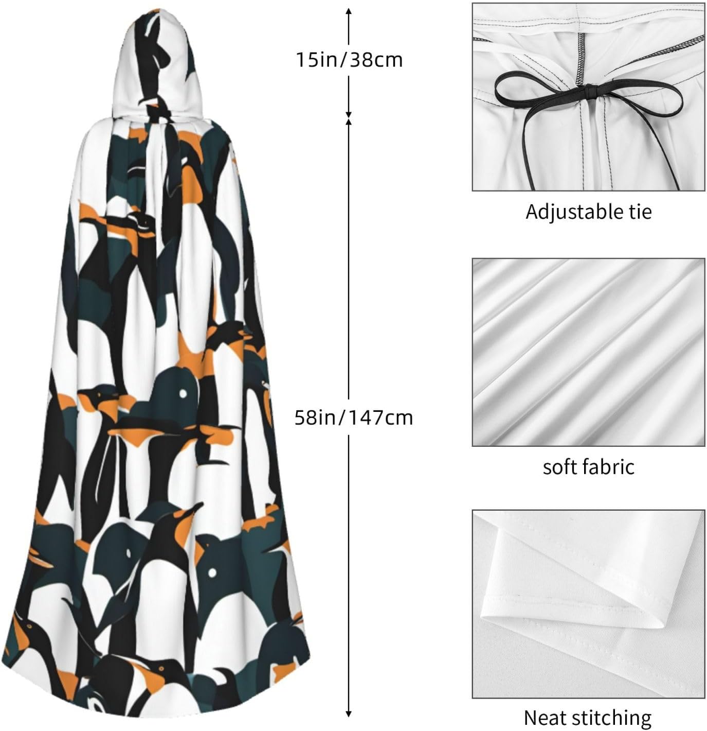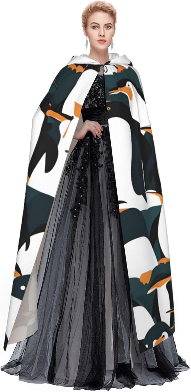 Il design senza cerniera, abbinato a un grande mantello con cappuccio e cravatta al collo, migliora il tuo mistero mantenendoti comodo con il suo tessuto non prurito. Con una lunghezza di 147 cm, una larghezza di 154 cm e un'altezza del cappuccio di 38 cm, il nostro simpatico mantello con cappuccio con stampa animale pinguino offre una copertura completa, assicurandoti di distinguerti in ogni occasione. Vari eventi come Halloween, cosplay, costumi da palcoscenico, feste a tema, balli, convegni di fumetti e molto altro ancora, il nostro mantello è versatile e conveniente. Facile da mantenere e di lunga durata, il nostro simpatico mantello con cappuccio con stampa con pinguino è lavabile in lavatrice e lavabile a mano. Con un design neutro, il nostro mantello è perfetto per uomini e donne.