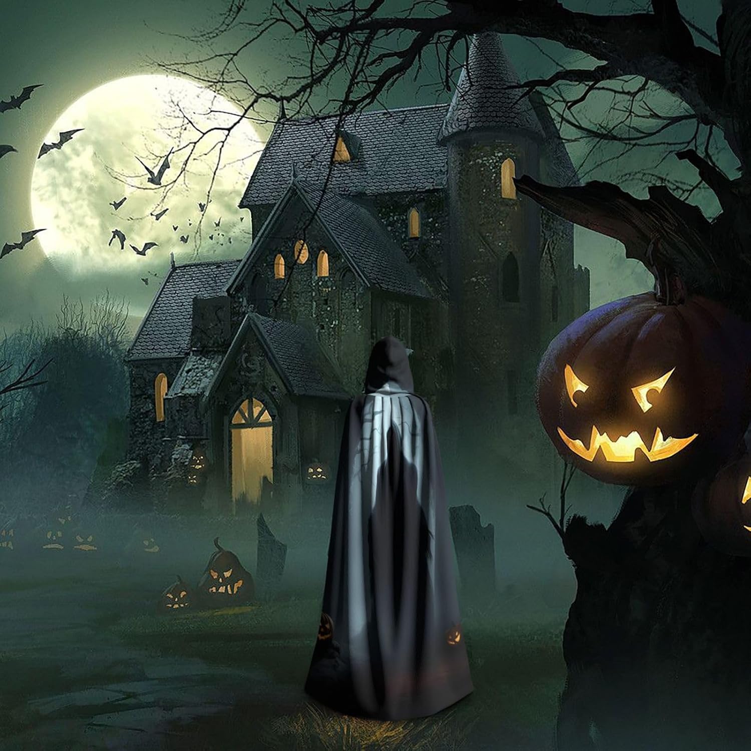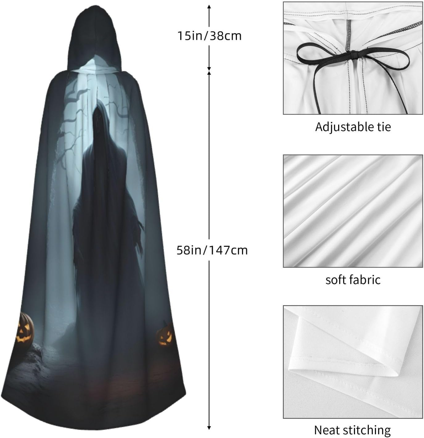 Il design senza cerniera, abbinato a un grande mantello con cappuccio e cravatta al collo, migliora il tuo mistero mantenendoti comodo con il suo tessuto non prurito. Con una lunghezza di 147 cm, larghezza di 154 cm e un'altezza del cappuccio di 38 cm, il nostro mantello con cappuccio con stampa fantasma di Halloween offre una copertura completa, assicurandoti di distinguerti in ogni occasione. Vari eventi come Halloween, cosplay, costumi da palcoscenico, feste a tema, balli, convegni di fumetti e molto altro ancora, il nostro mantello è versatile e conveniente. Facile da mantenere e di lunga durata, il nostro mantello con cappuccio con stampa fantasma di Halloween è lavabile in lavatrice e lavabile a mano. Con un design neutro, il nostro mantello è perfetto per uomini e donne.