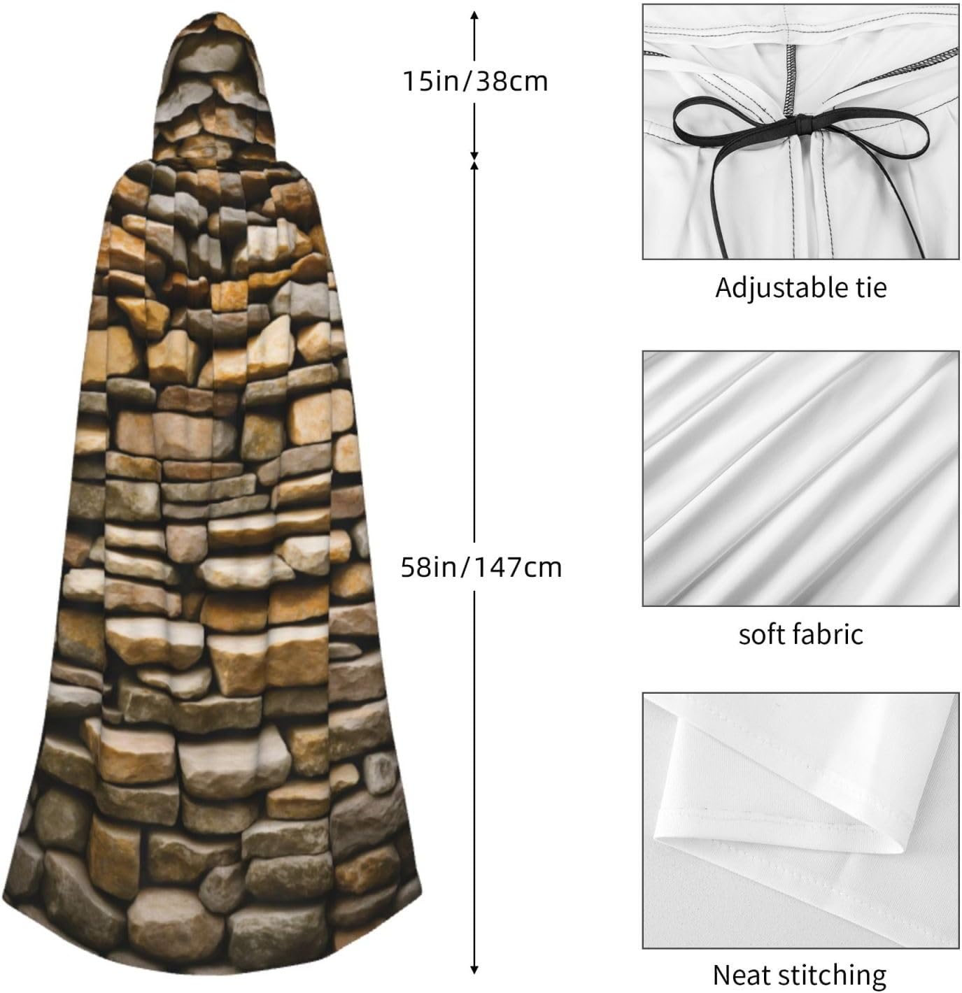 Il design senza cerniera, abbinato a un grande mantello con cappuccio e cravatta al collo, migliora il tuo mistero mantenendoti comodo con il suo tessuto non prurito. Con una lunghezza di 147 cm, una larghezza di 154 cm e un'altezza del cappuccio di 38 cm, il nostro mantello con cappuccio rustico con stampa a muro di mattoni offre una copertura completa, assicurandoti di distinguerti in ogni occasione. Vari eventi come Halloween, cosplay, costumi da palcoscenico, feste a tema, balli, convegni di fumetti e molto altro ancora, il nostro mantello è versatile e conveniente. Facile da mantenere e di lunga durata, il nostro mantello con cappuccio rustico con stampa a muro di mattoni è lavabile in lavatrice e lavabile a mano. Con un design neutro, il nostro mantello è perfetto per uomini e donne.