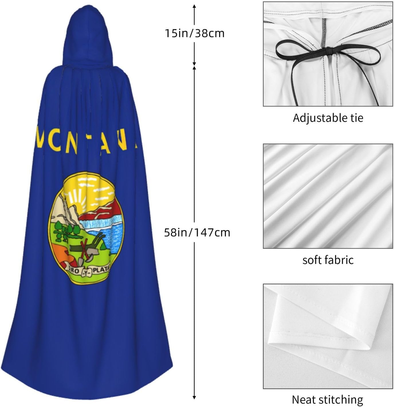 Il design senza cerniera, abbinato a un grande mantello con cappuccio e cravatta al collo, migliora il tuo mistero mantenendoti comodo con il suo tessuto non prurito. Con una lunghezza di 147 cm, larghezza di 154 cm e un'altezza del cappuccio di 38 cm, il nostro mantello con cappuccio con stampa bandiera del Montana offre una copertura completa, assicurandoti di distinguerti in ogni occasione. Vari eventi come Halloween, cosplay, costumi da palcoscenico, feste a tema, balli, convegni di fumetti e molto altro ancora, il nostro mantello è versatile e conveniente. Facile da mantenere e di lunga durata, il nostro mantello con cappuccio con stampa bandiera dello stato del Montana è lavabile in lavatrice e lavabile a mano. Con un design neutro, il nostro mantello è perfetto per uomini e donne.