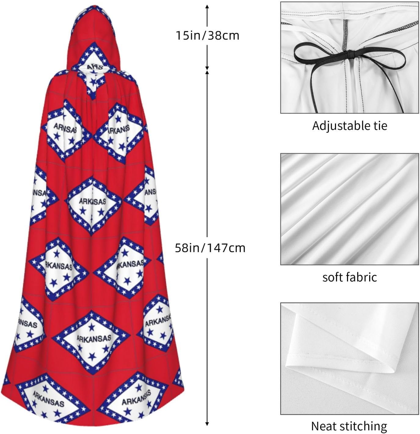 Il design senza cerniera, abbinato a un grande mantello con cappuccio e cravatta al collo, migliora il tuo mistero mantenendoti comodo con il suo tessuto non prurito. Con una lunghezza di 147 cm, larghezza di 154 cm e un'altezza del cappuccio di 38 cm, il nostro mantello con cappuccio con stampa bandiera dell'Arkansas offre una copertura completa, assicurandoti di distinguerti in ogni occasione. Vari eventi come Halloween, cosplay, costumi da palcoscenico, feste a tema, balli, convegni di fumetti e molto altro ancora, il nostro mantello è versatile e conveniente. Facile da mantenere e di lunga durata, il nostro mantello con cappuccio con stampa bandiera dell'Arkansas è lavabile in lavatrice e lavabile a mano. Con un design neutro, il nostro mantello è perfetto per uomini e donne.