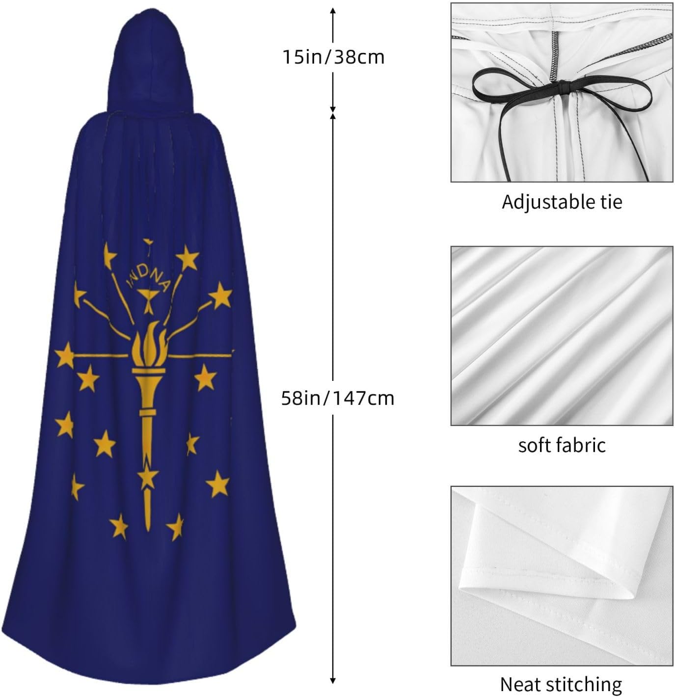 Il design senza cerniera, abbinato a un grande mantello con cappuccio e cravatta al collo, migliora il tuo mistero mantenendoti comodo con il suo tessuto non prurito. Con una lunghezza di 147 cm, larghezza di 154 cm e un'altezza del cappuccio di 38 cm, il nostro mantello con cappuccio con stampa bandiera dell'Indiana offre una copertura completa, assicurandoti di distinguerti in ogni occasione. Vari eventi come Halloween, cosplay, costumi da palcoscenico, feste a tema, balli, convegni di fumetti e molto altro ancora, il nostro mantello è versatile e conveniente. Facile da mantenere e di lunga durata, il nostro mantello con cappuccio con stampa bandiera dell'Indiana è lavabile in lavatrice e lavabile a mano. Con un design neutro, il nostro mantello è perfetto per uomini e donne.