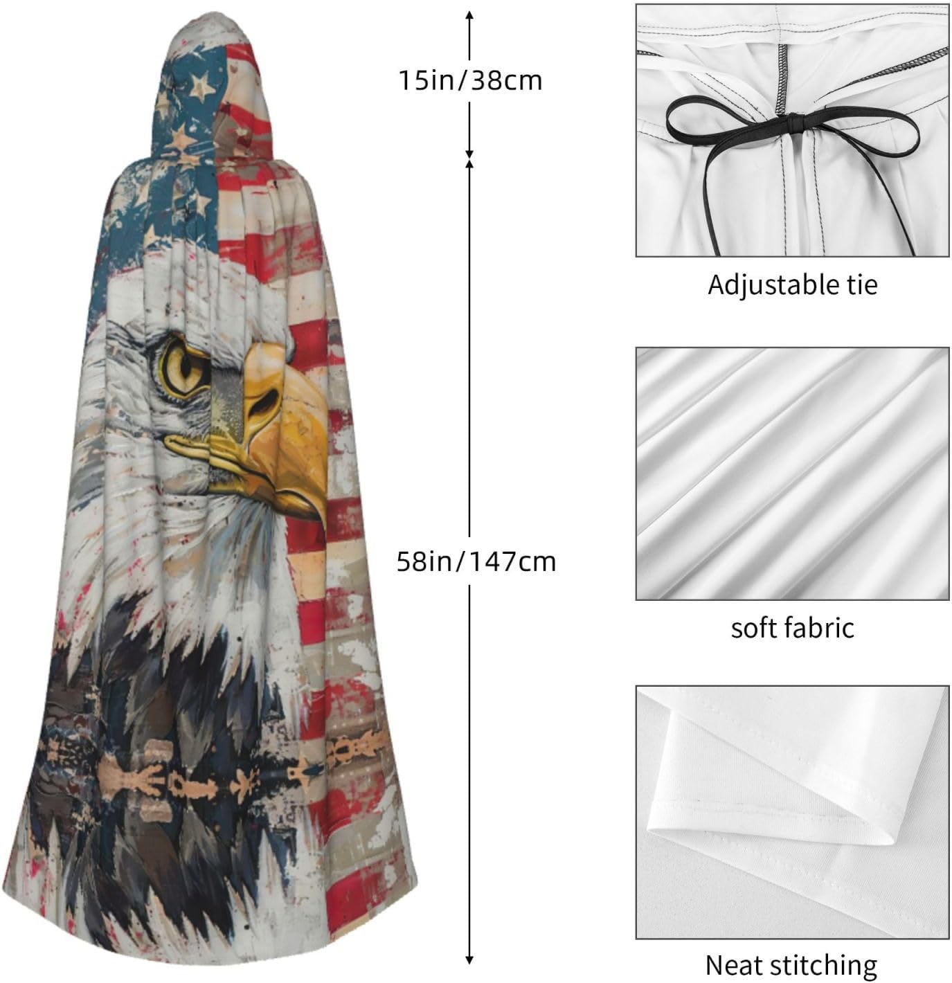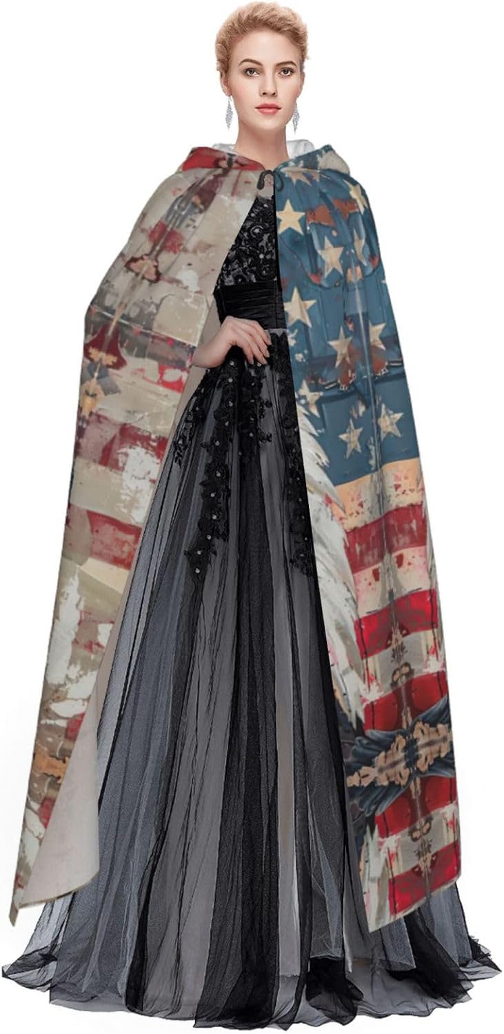 Il design senza cerniera, abbinato a un grande mantello con cappuccio e cravatta al collo, migliora il tuo mistero mantenendoti comodo con il suo tessuto non prurito. Con una lunghezza di 147 cm, larghezza di 154 cm e un'altezza del cappuccio di 38 cm, il nostro mantello con cappuccio con stampa con aquila patriottica offre una copertura completa, assicurandoti di distinguerti in ogni occasione. Vari eventi come Halloween, cosplay, costumi da palcoscenico, feste a tema, balli, convegni di fumetti e molto altro ancora, il nostro mantello è versatile e conveniente. Facile da mantenere e di lunga durata, il nostro mantello con cappuccio con stampa aquila patriottica è lavabile in lavatrice e lavabile a mano. Con un design neutro, il nostro mantello è perfetto per uomini e donne.